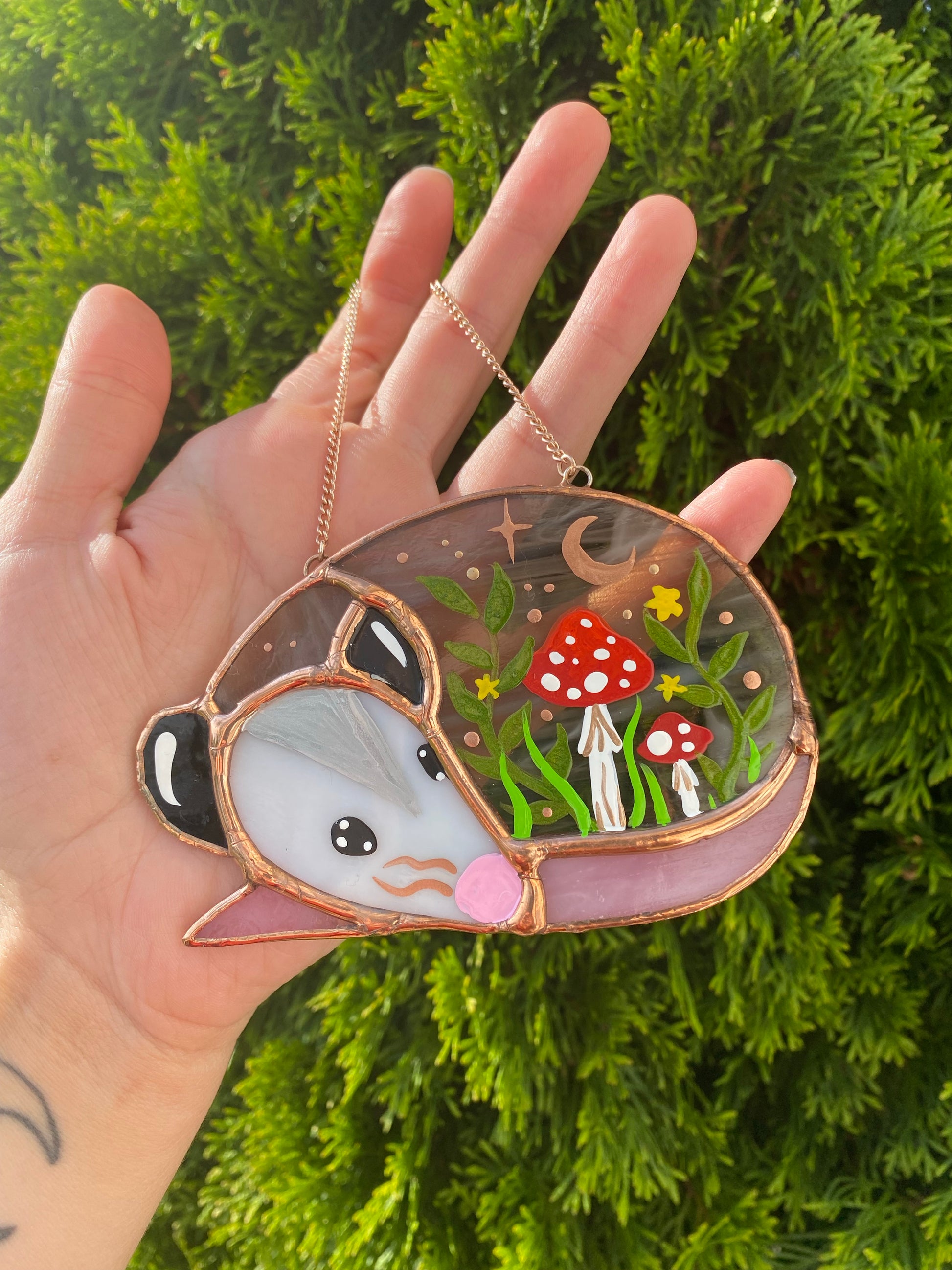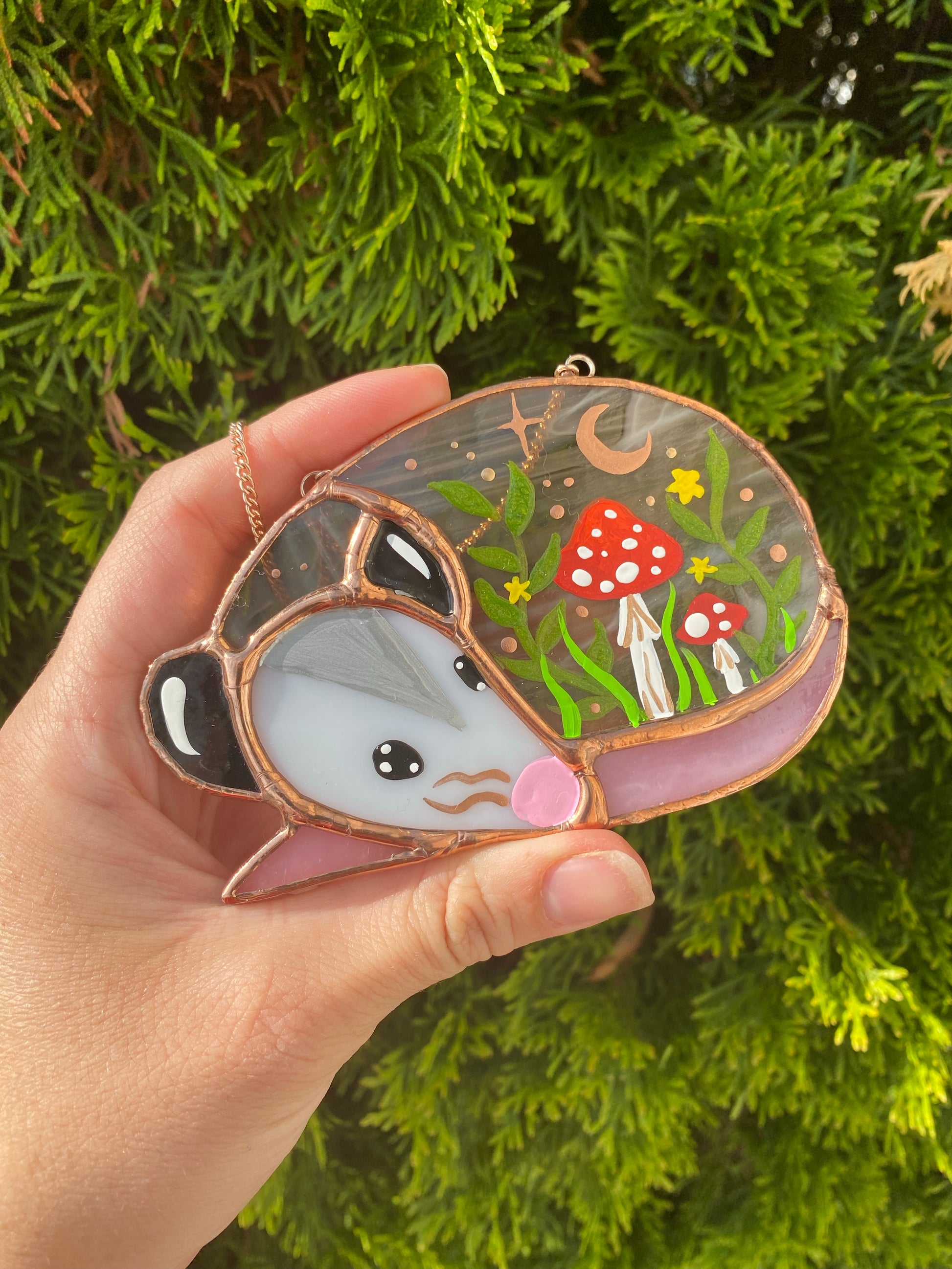 Red Mushroom Sleepy Opossum Mini Stained Glass Suncatcher