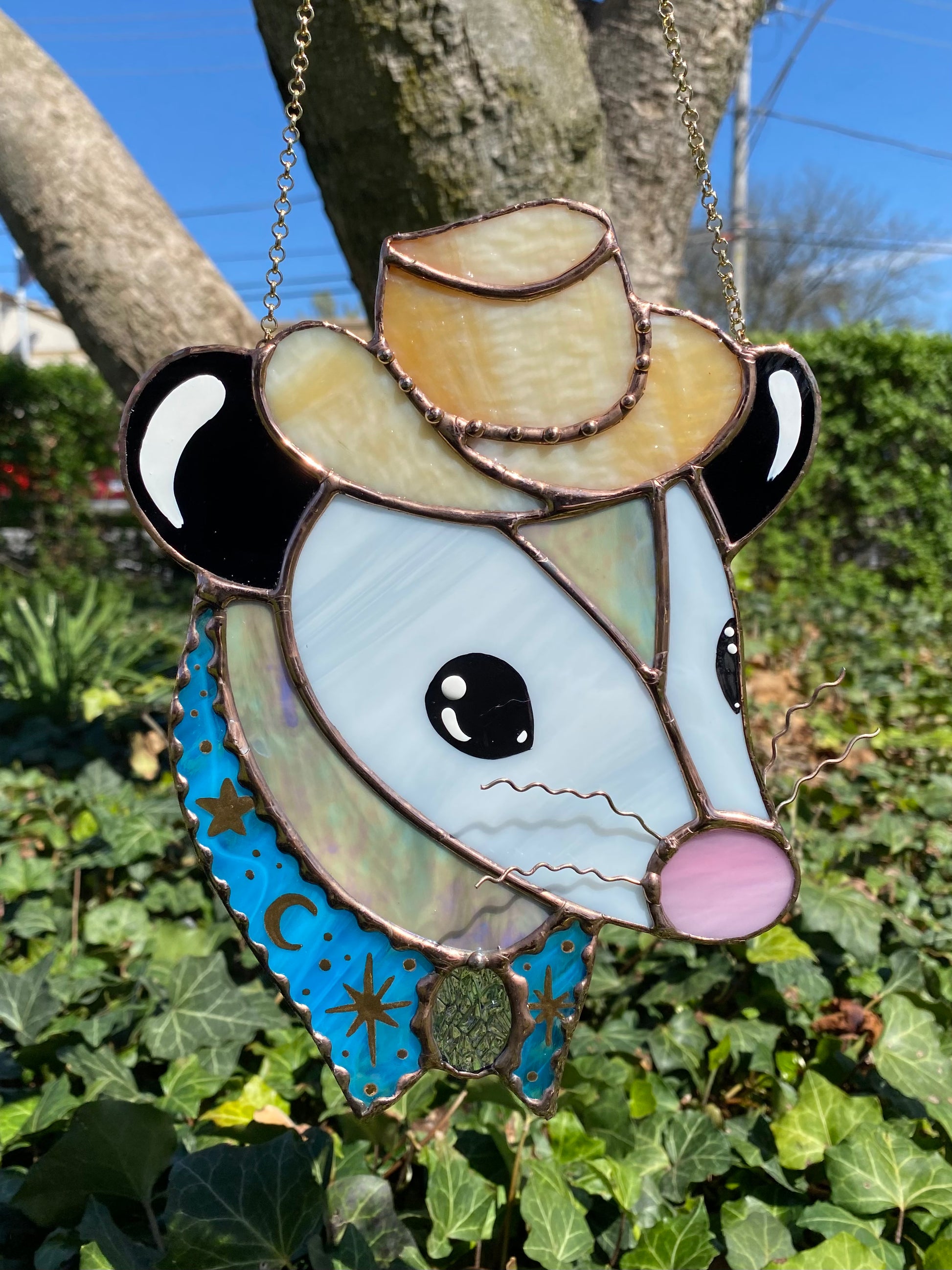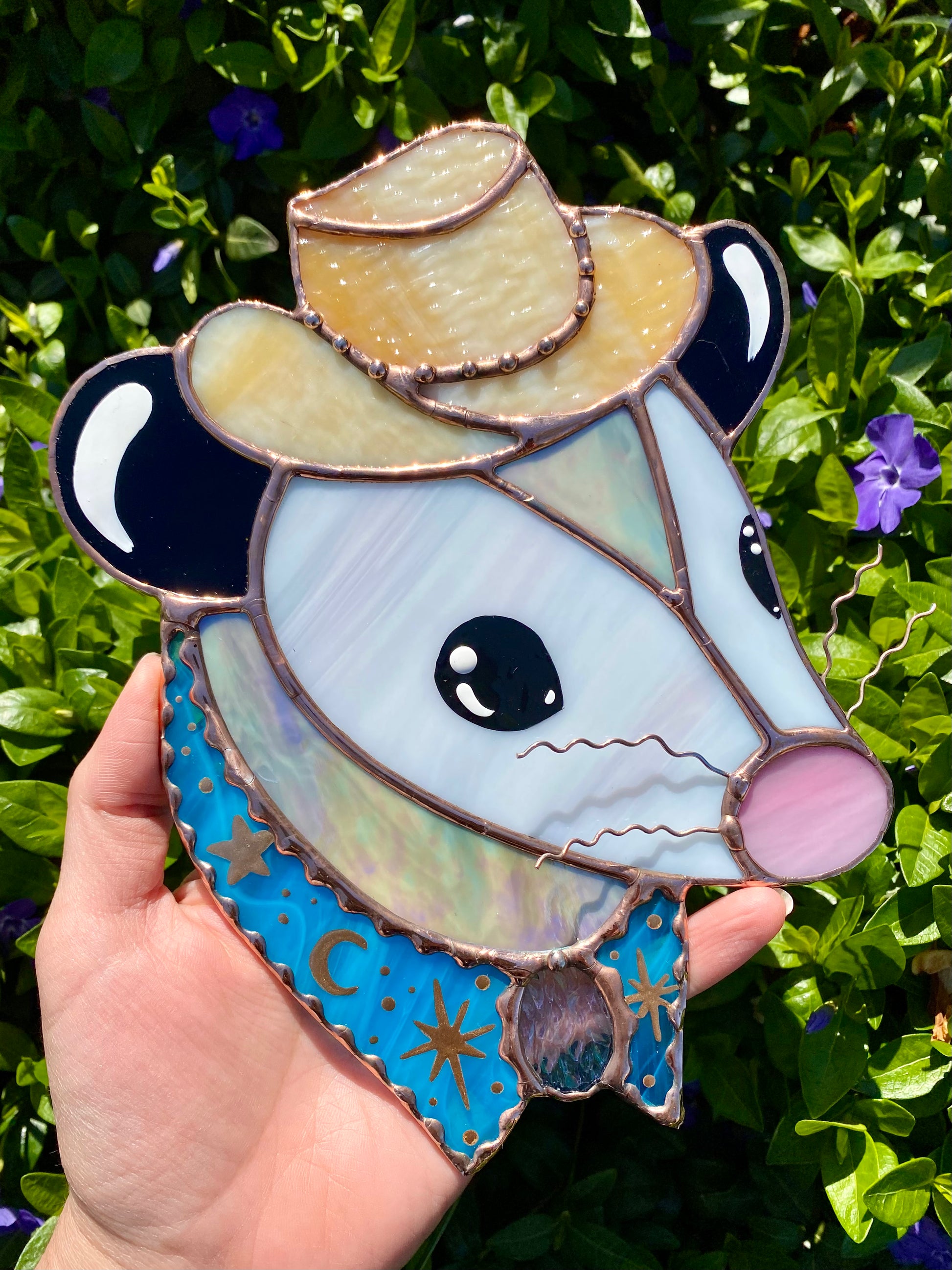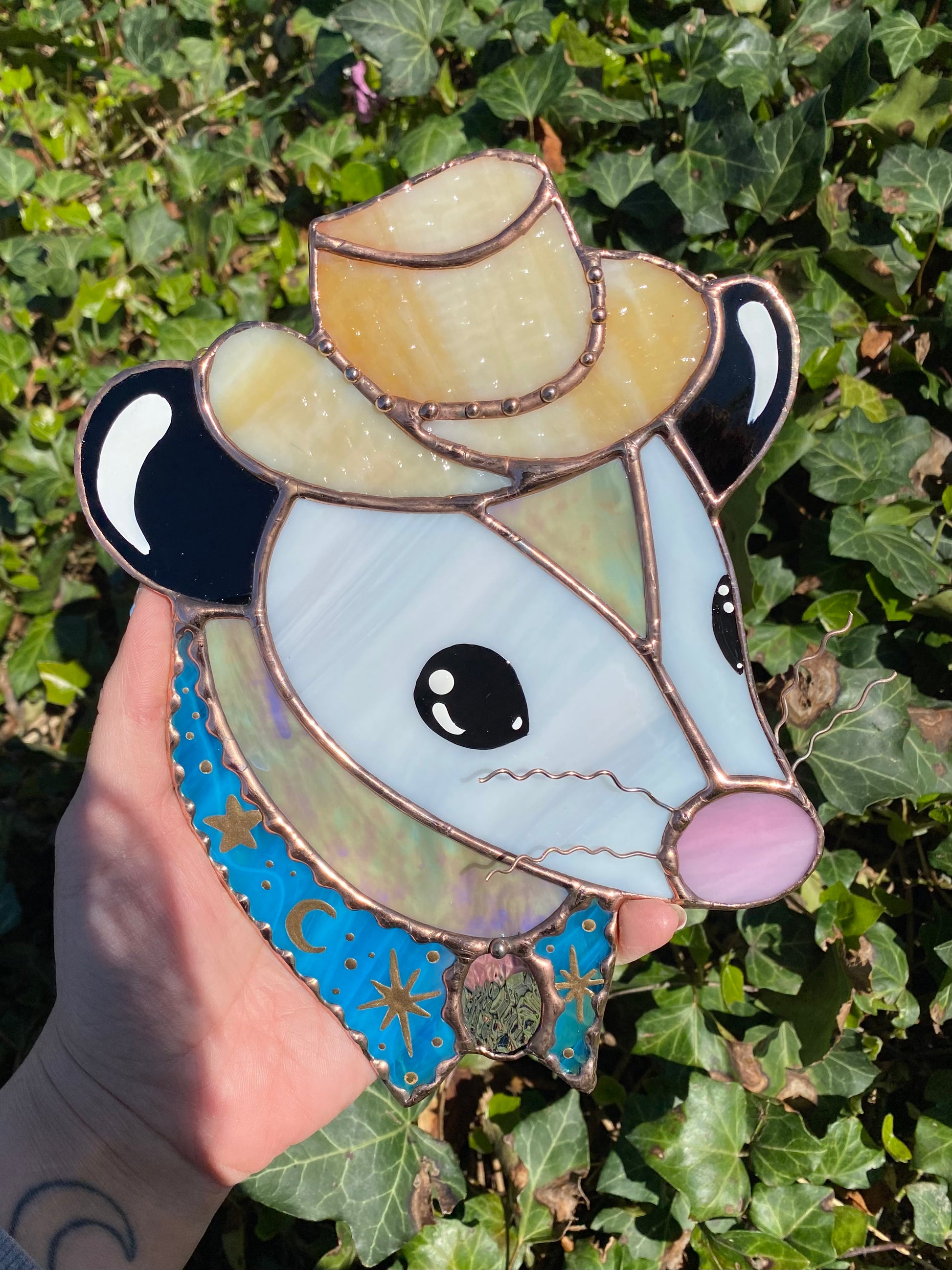 Blue and Gold Cowboy Opossum Stained Glass Suncatcher