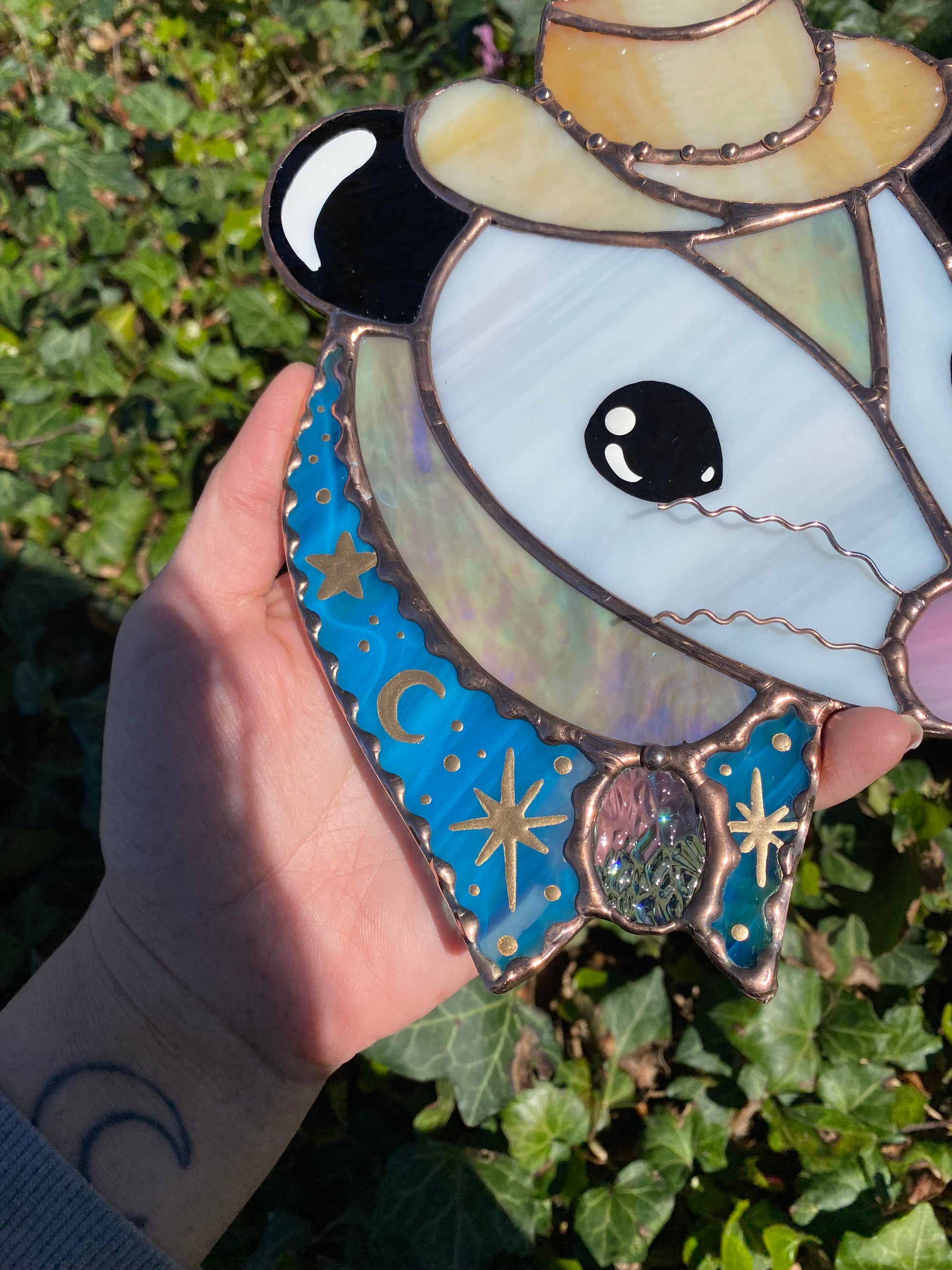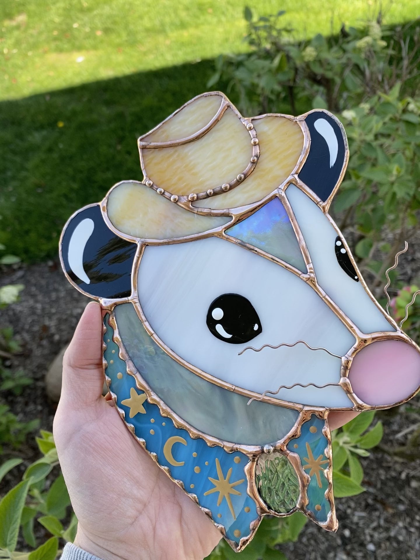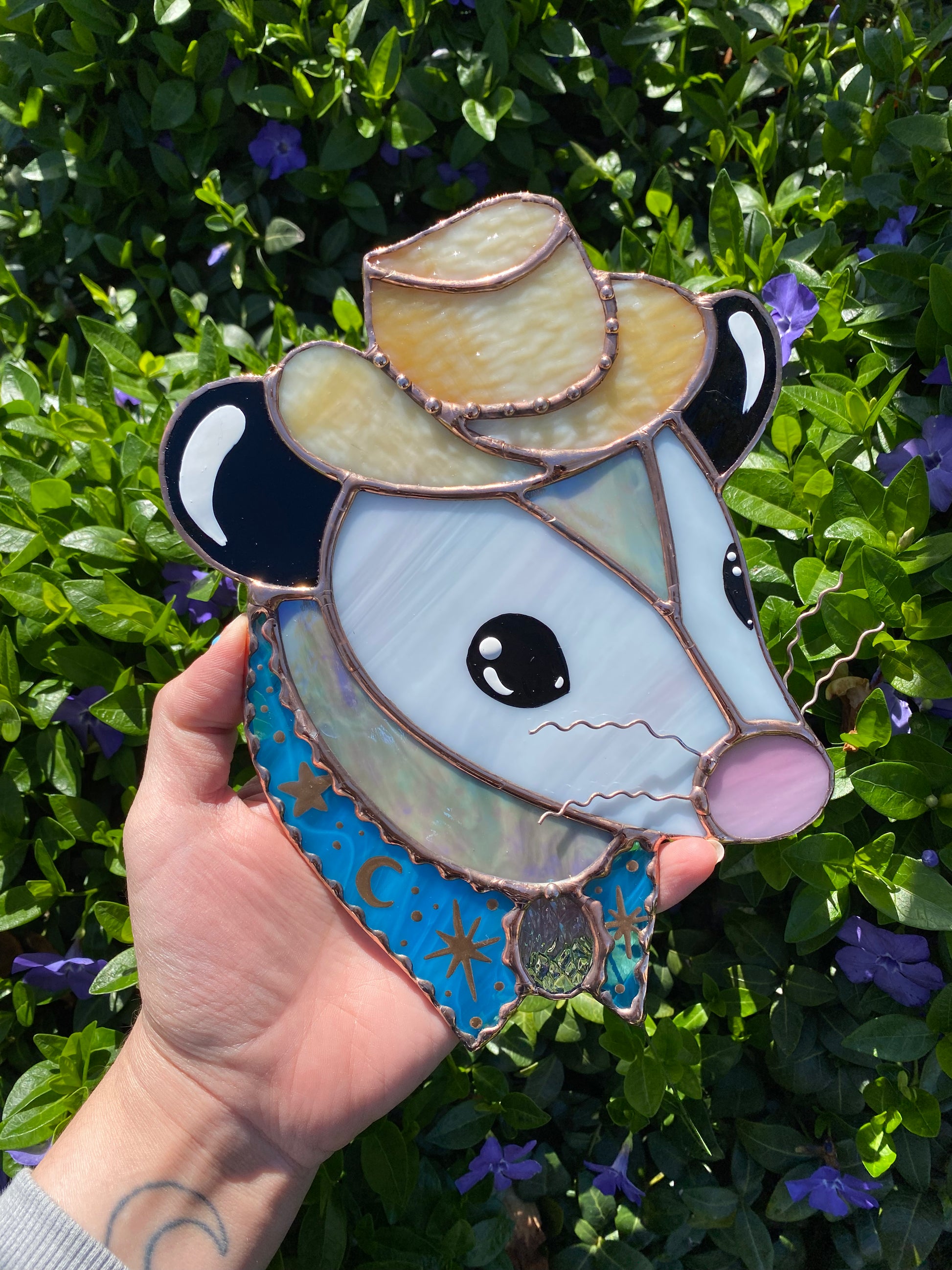Blue and Gold Cowboy Opossum Stained Glass Suncatcher