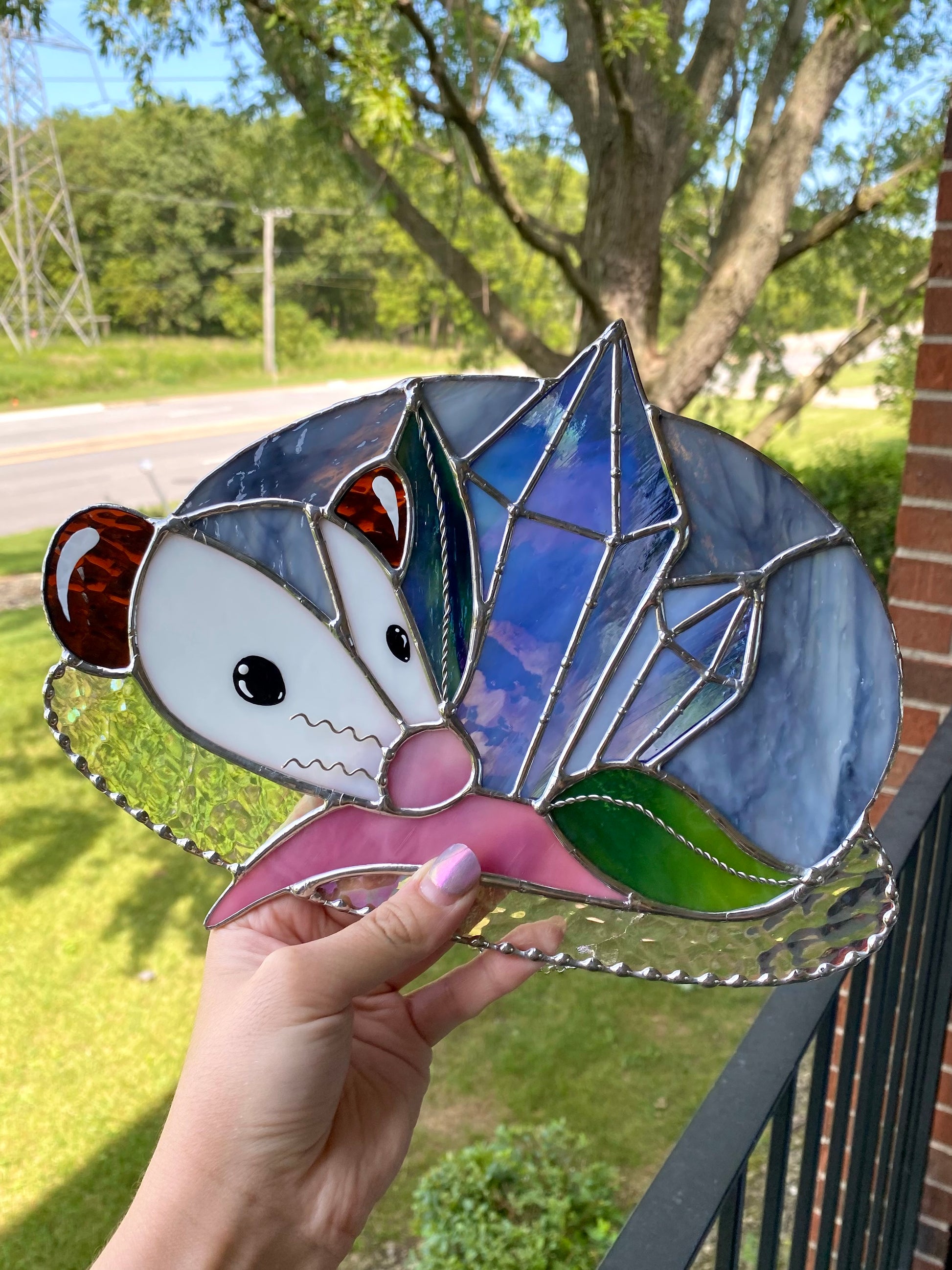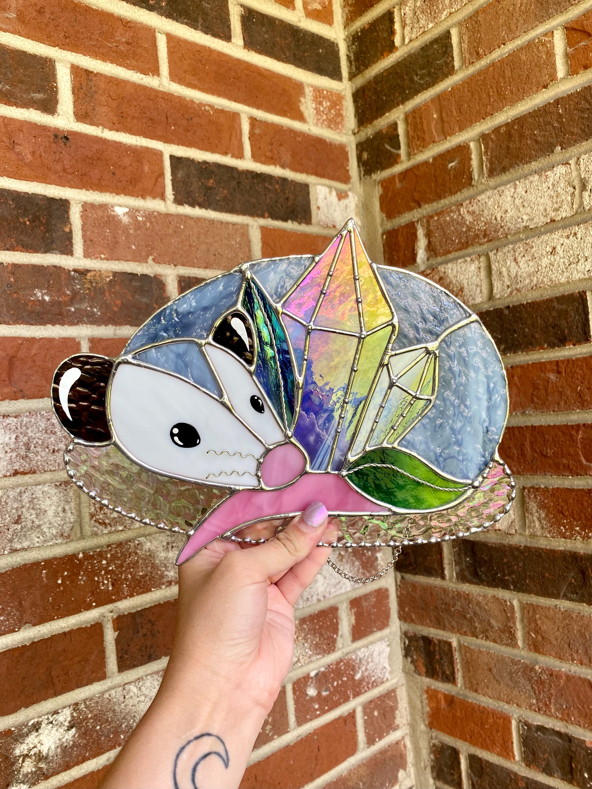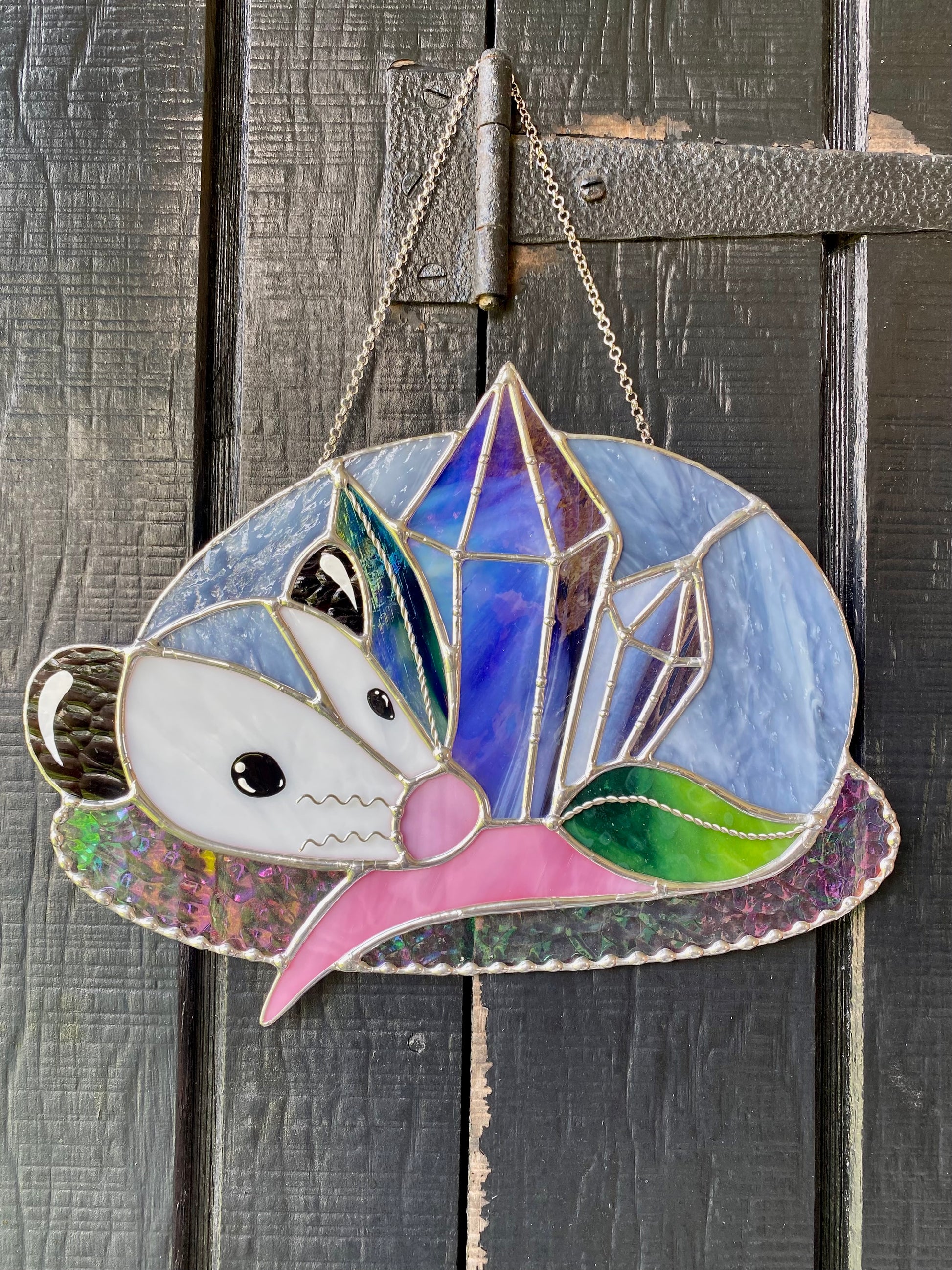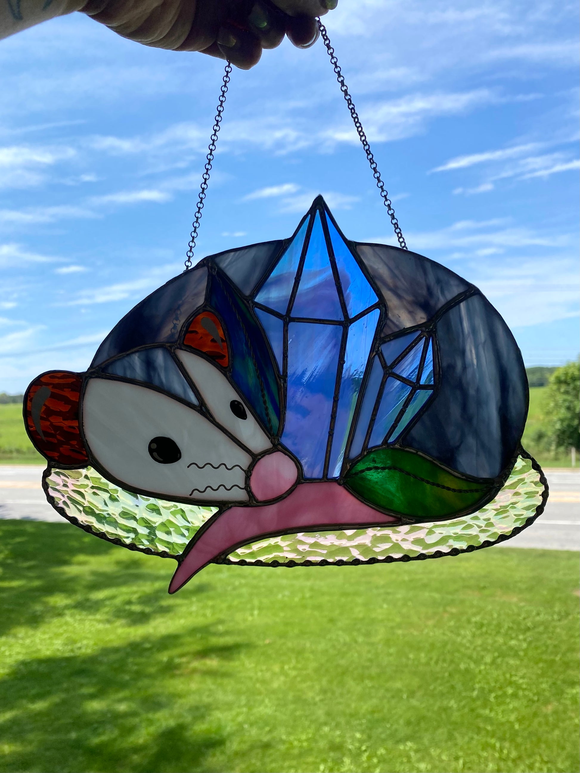 Blue Crystal Guardian Opossum Stained Glass Suncatcher