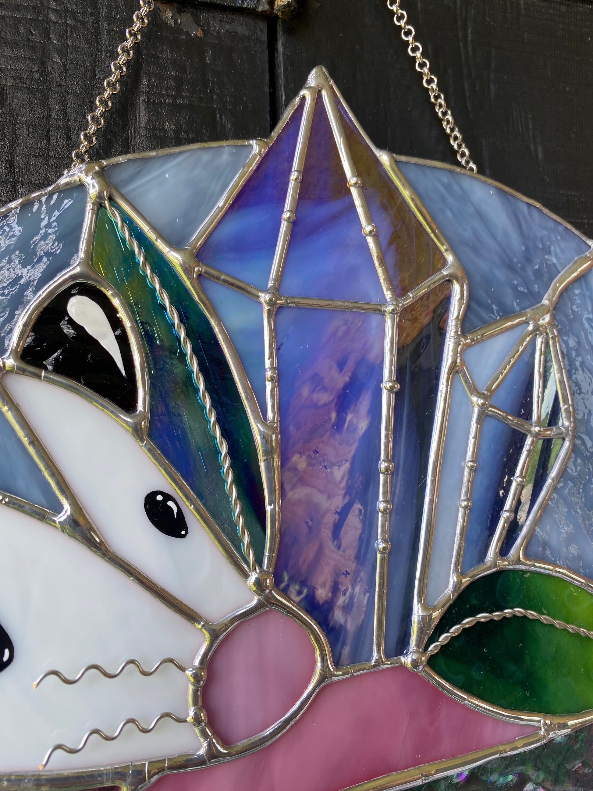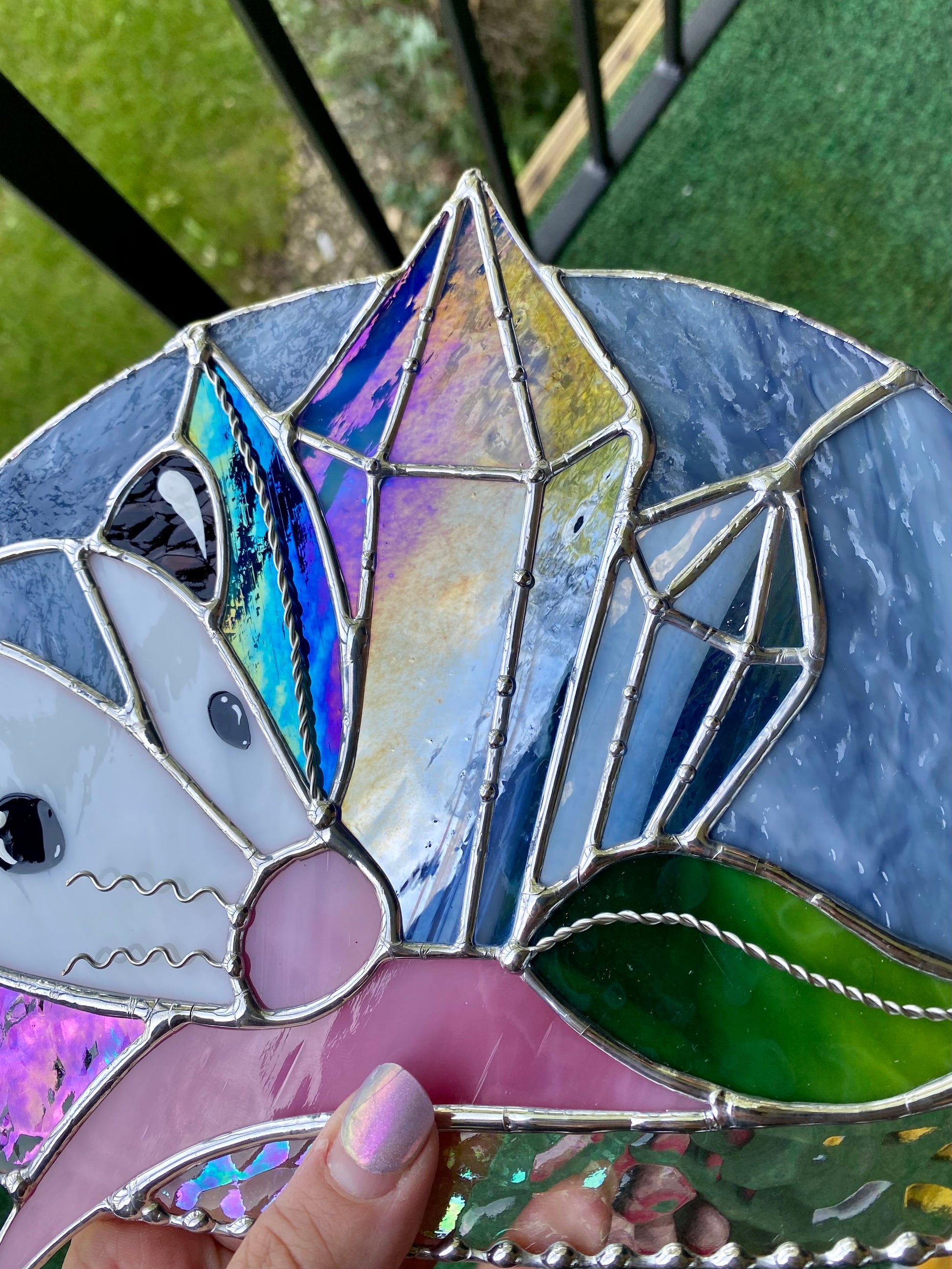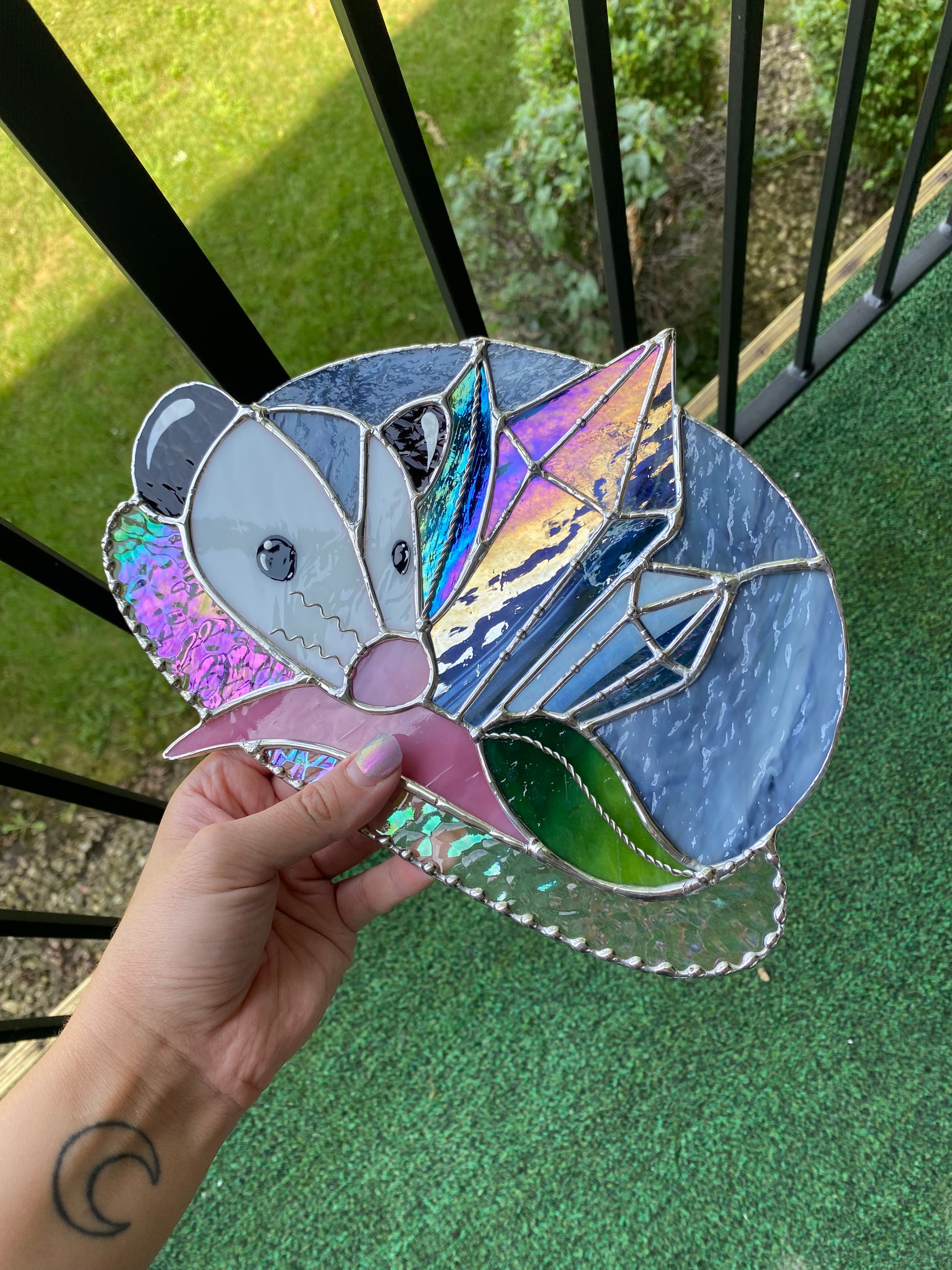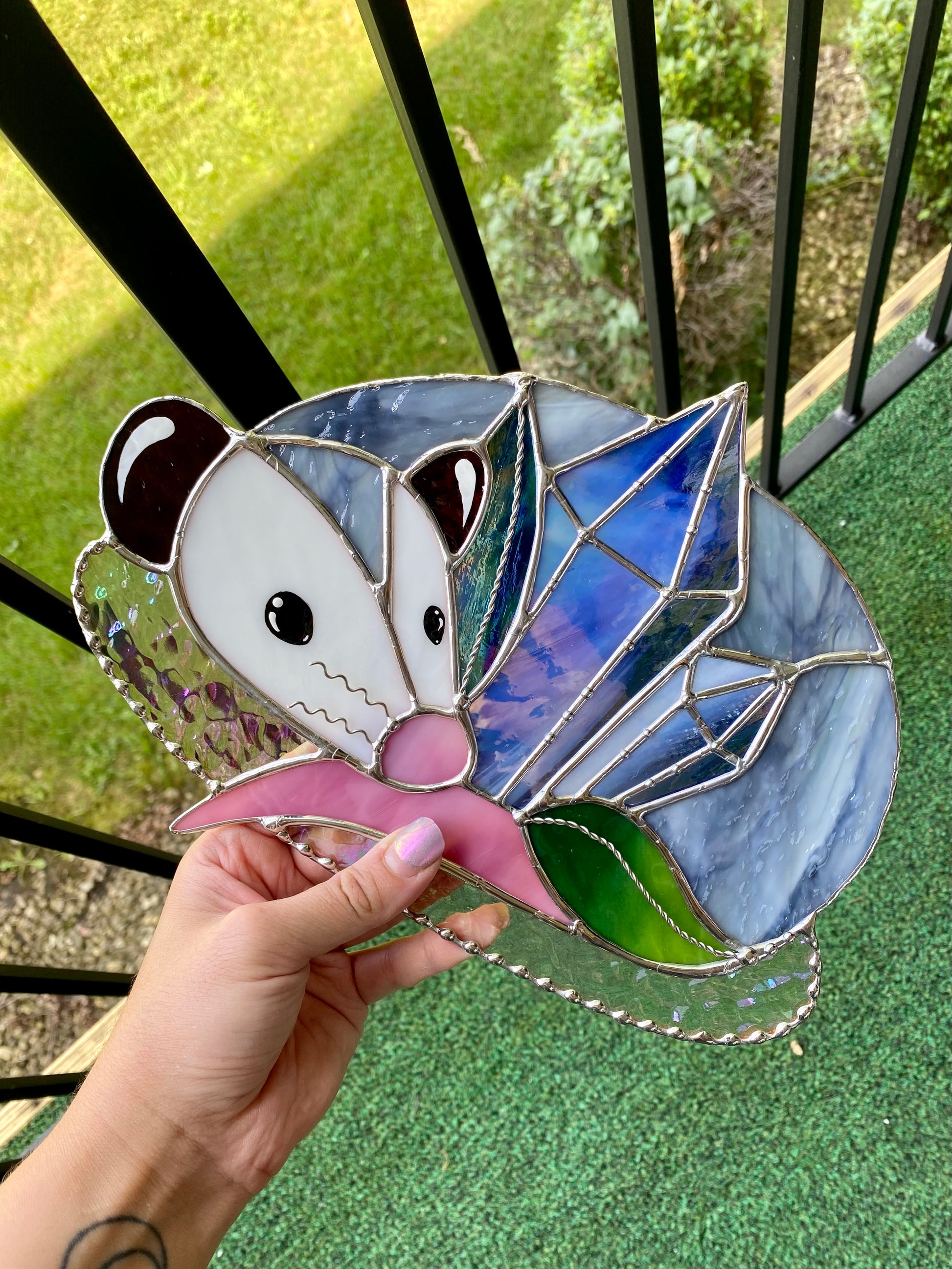 Blue Crystal Guardian Opossum Stained Glass Suncatcher