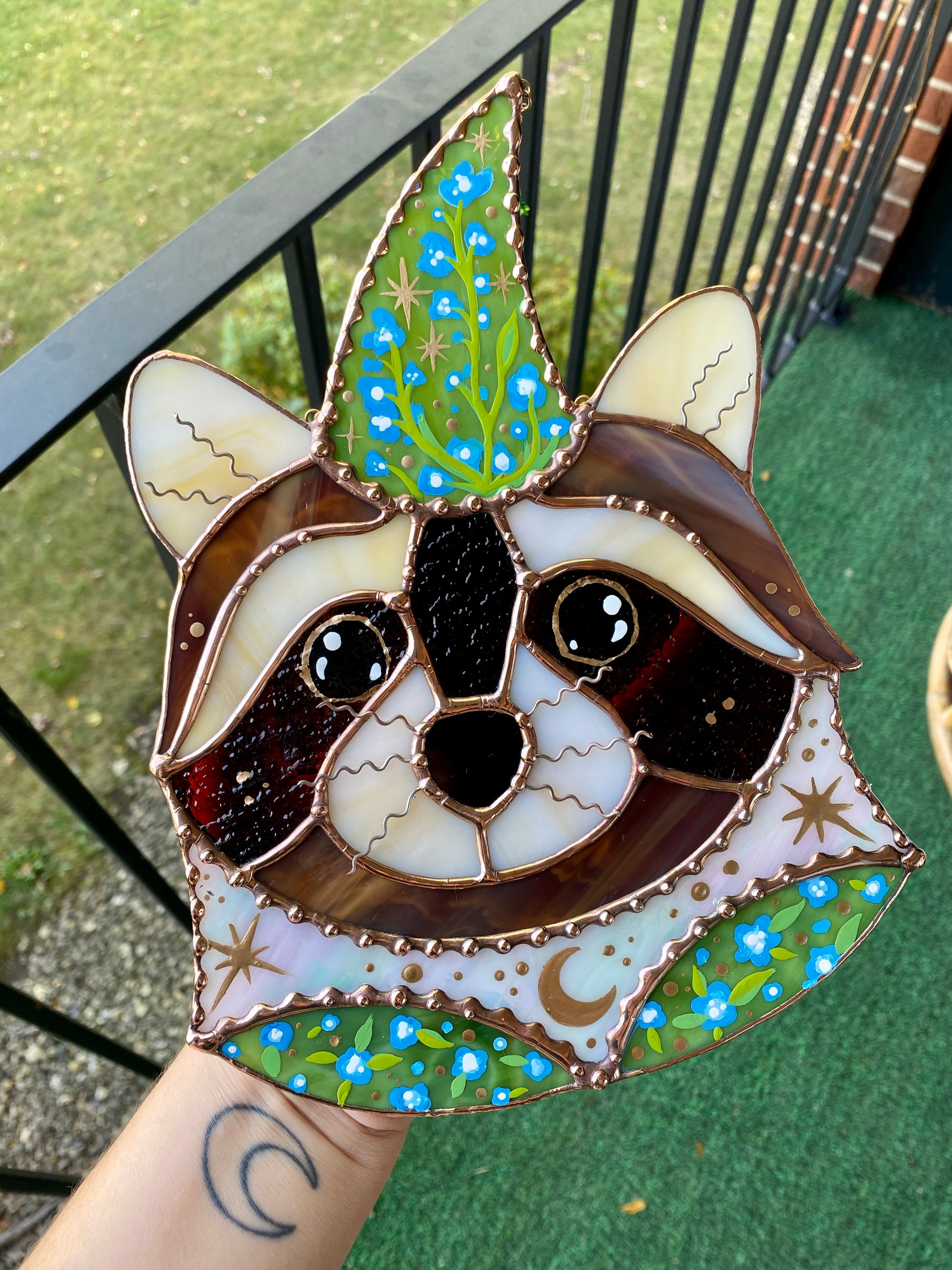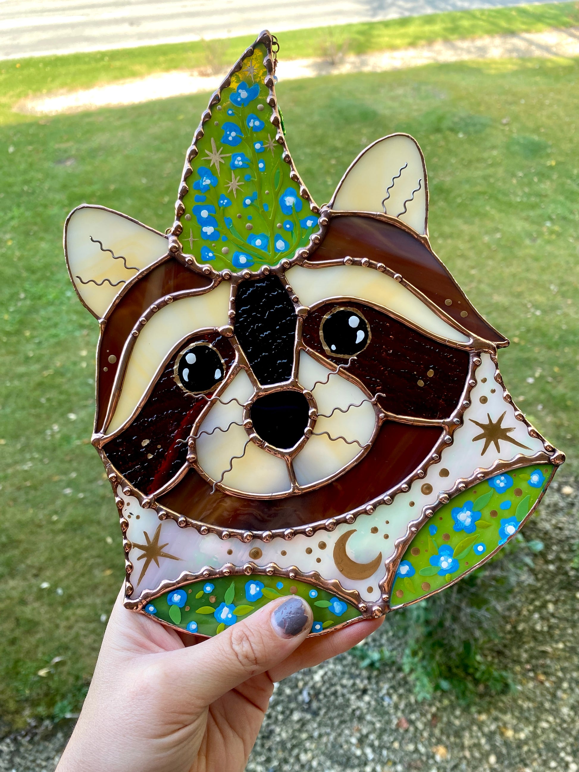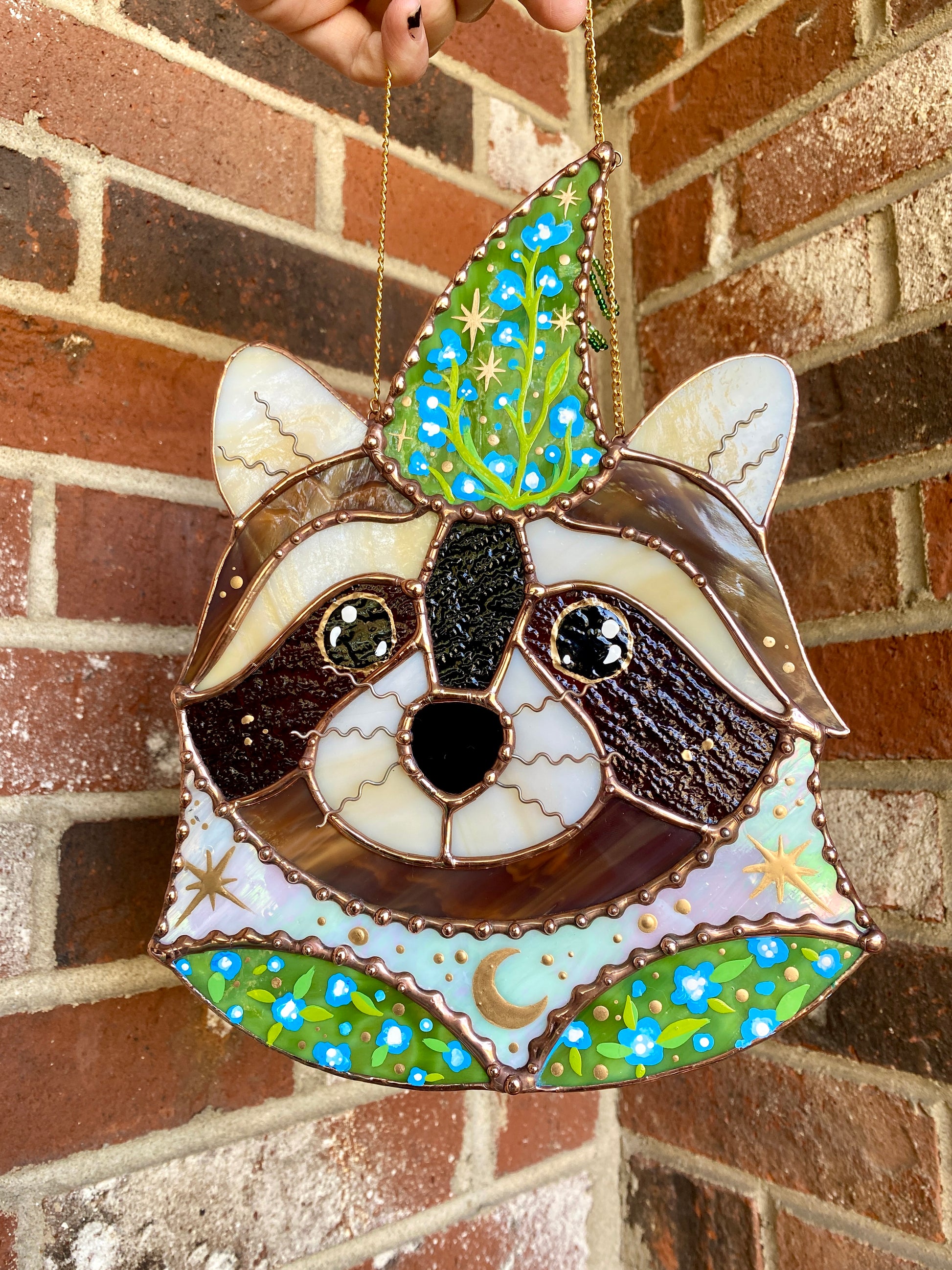 Blue Flower Wizard Raccoon Stained Glass Suncatcher