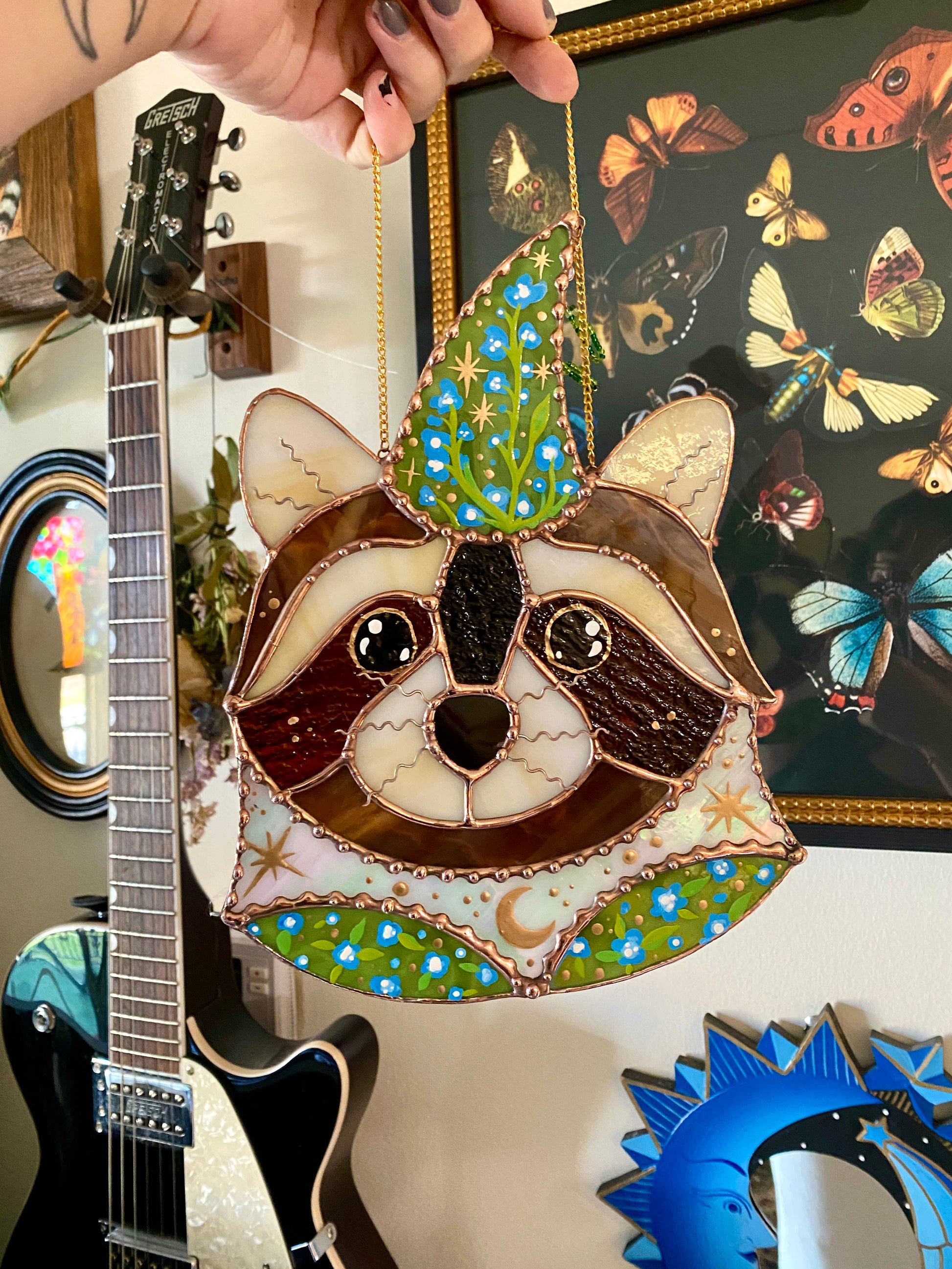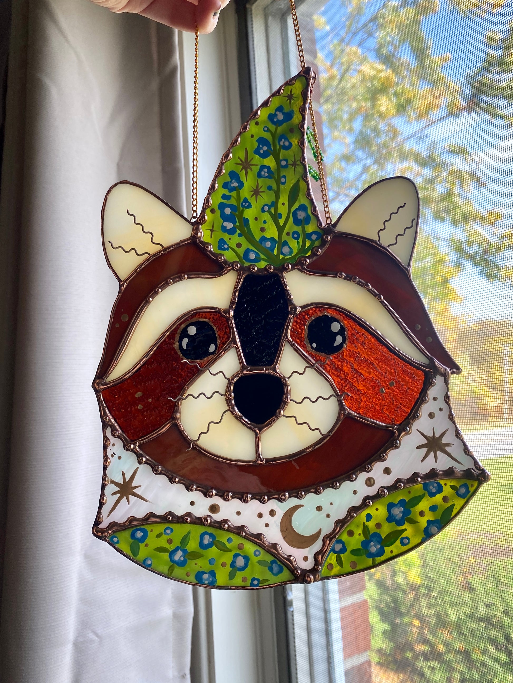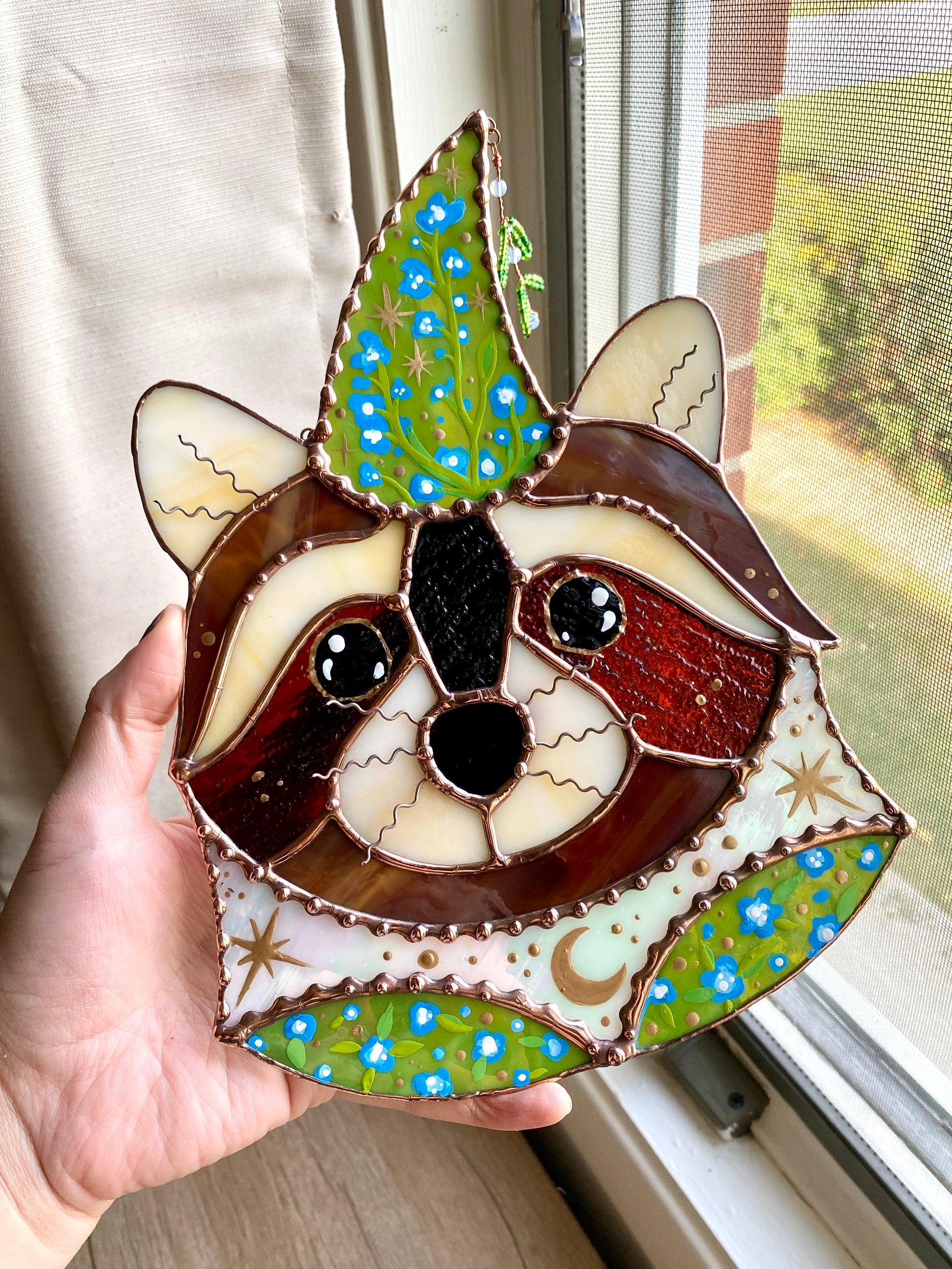 Blue Flower Wizard Raccoon Stained Glass Suncatcher
