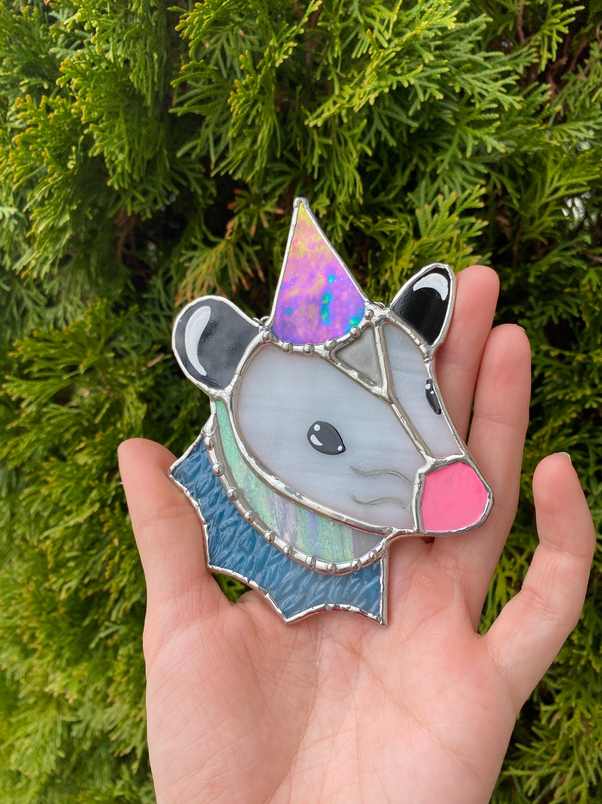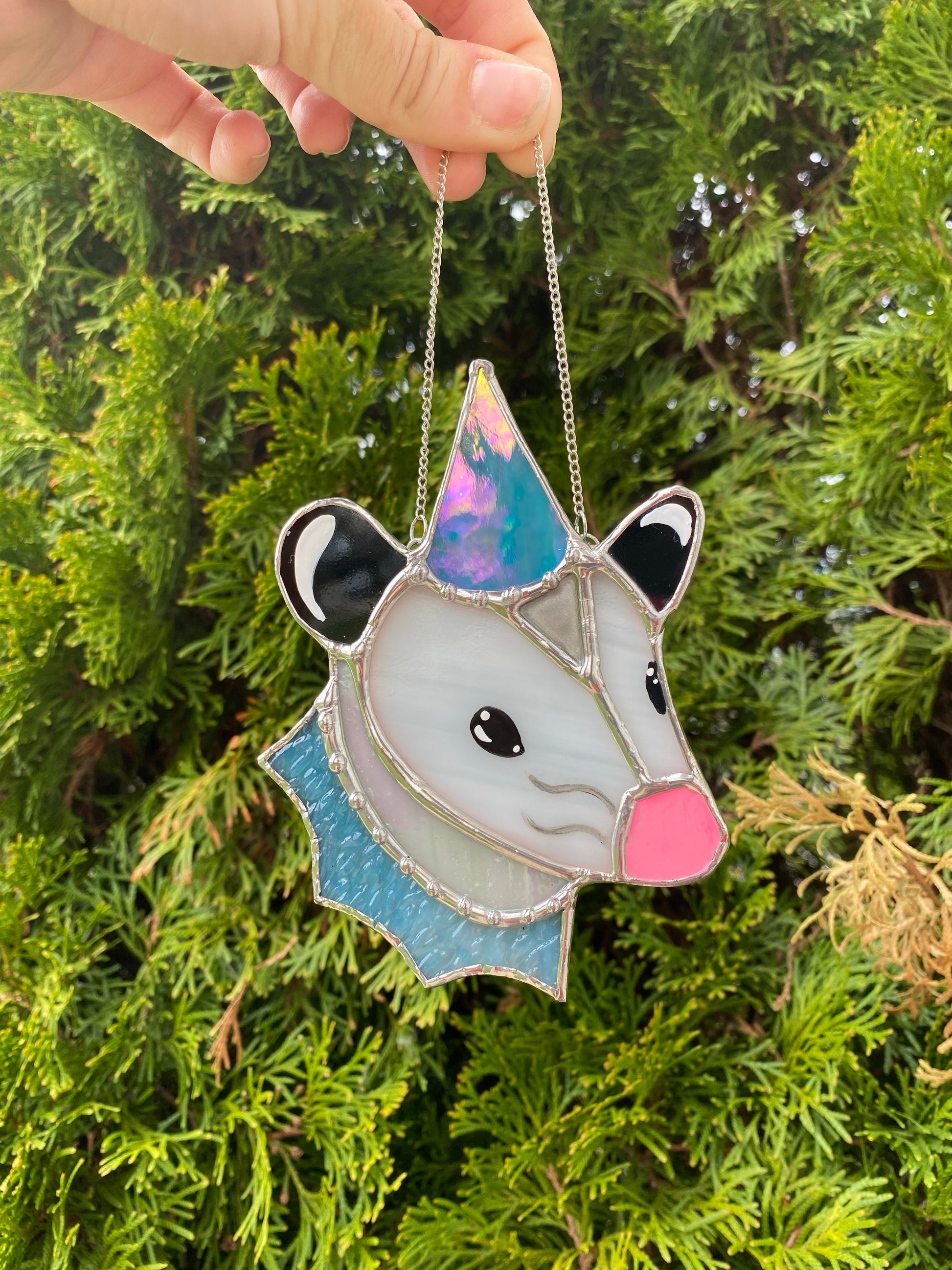 Blue Iridescent Wizard Opossum Mini Stained Glass Suncatcher