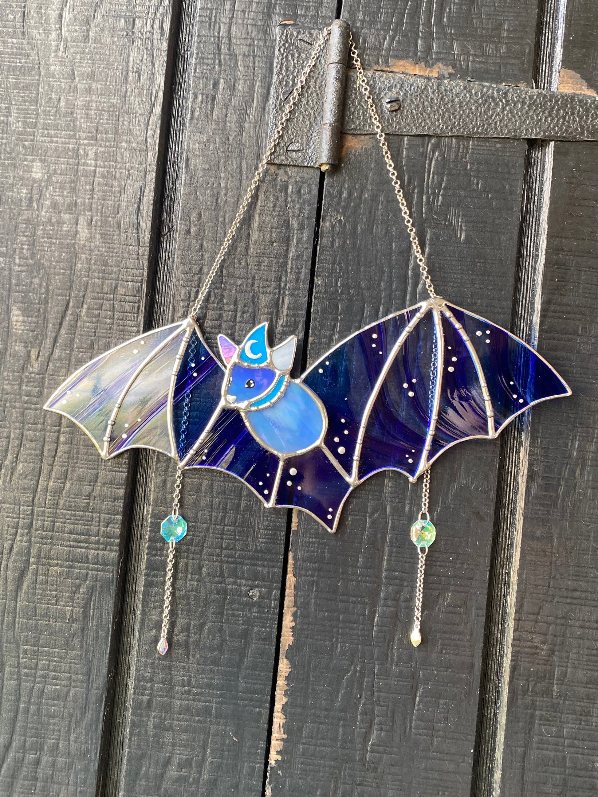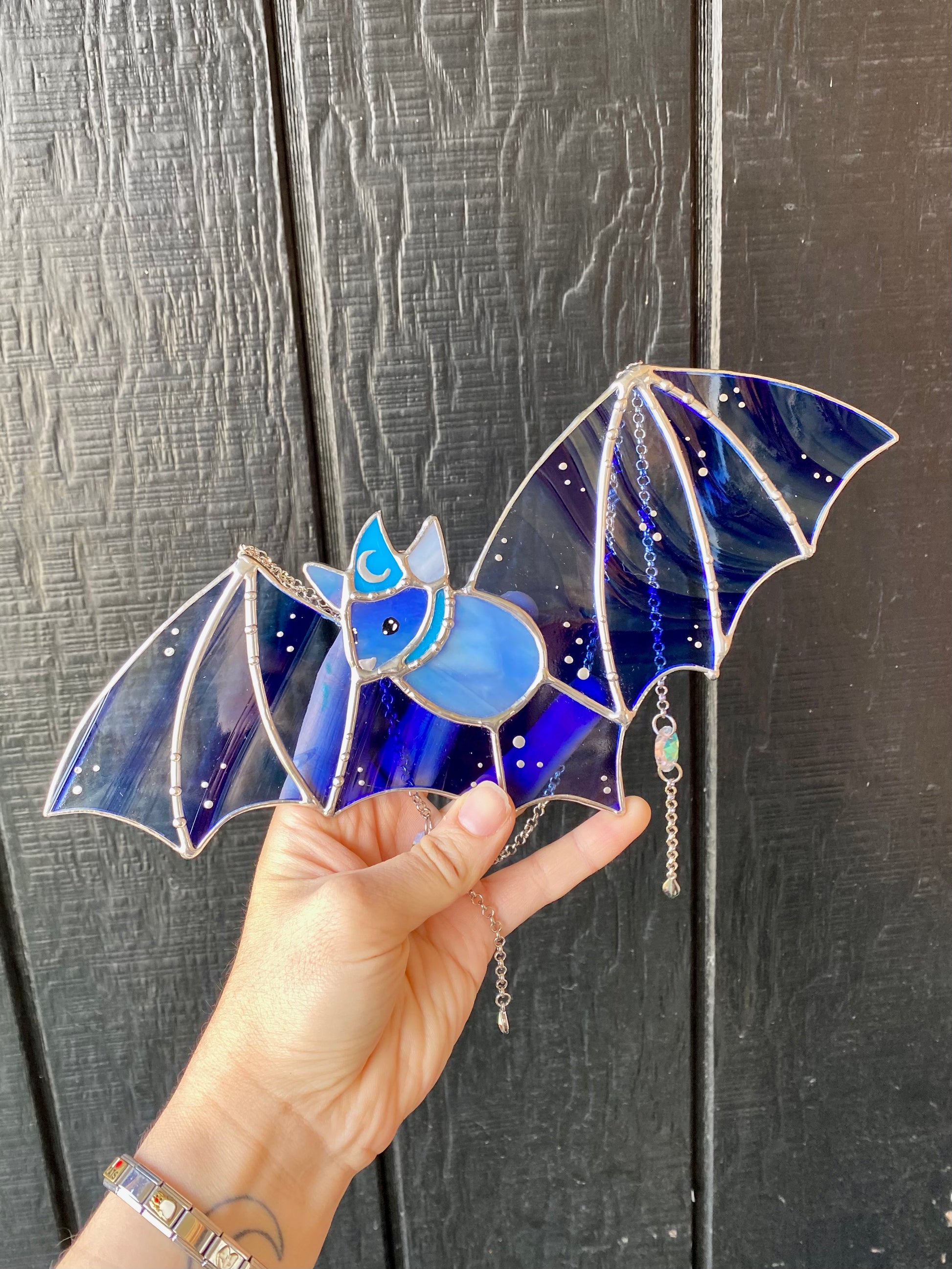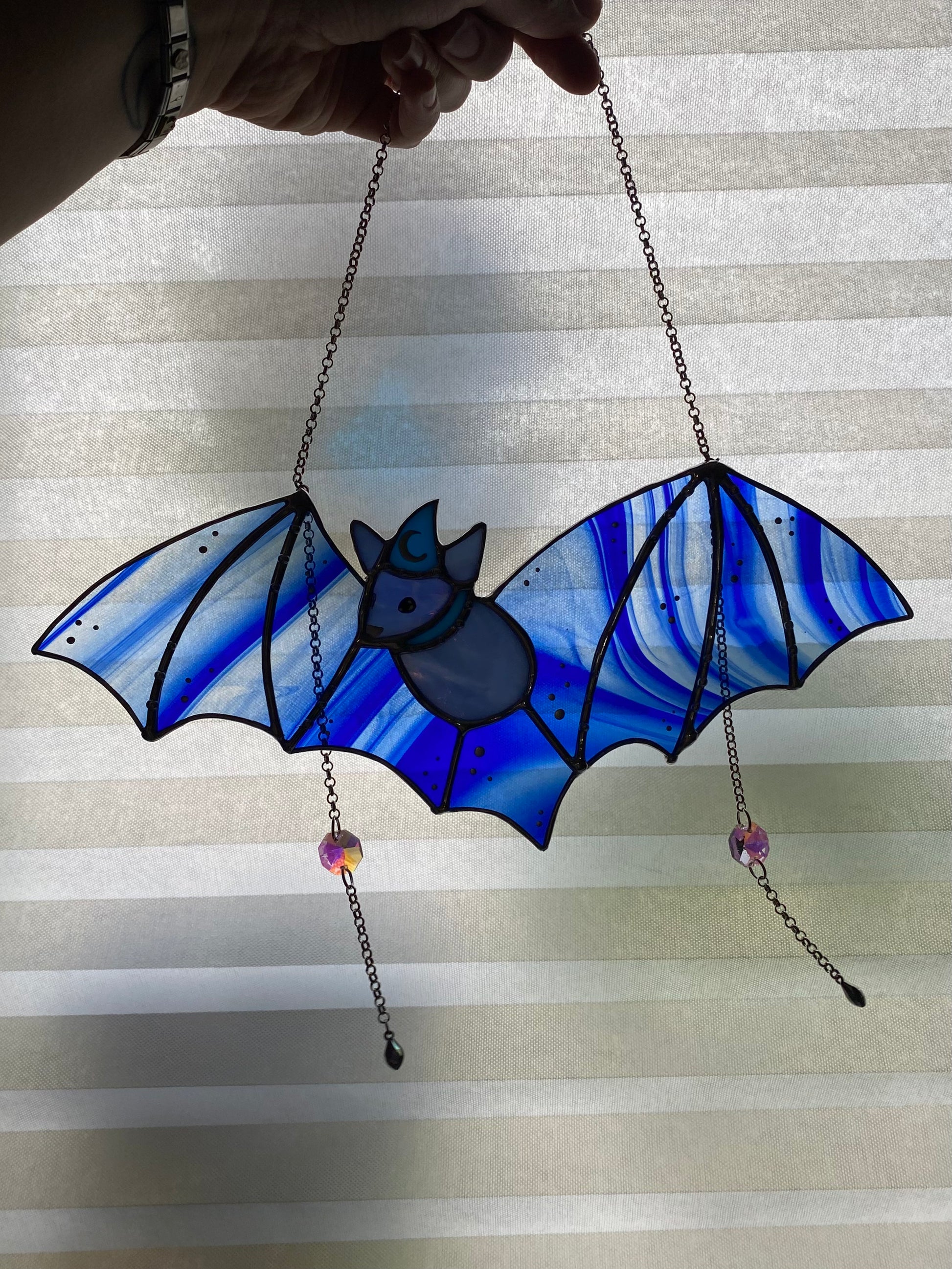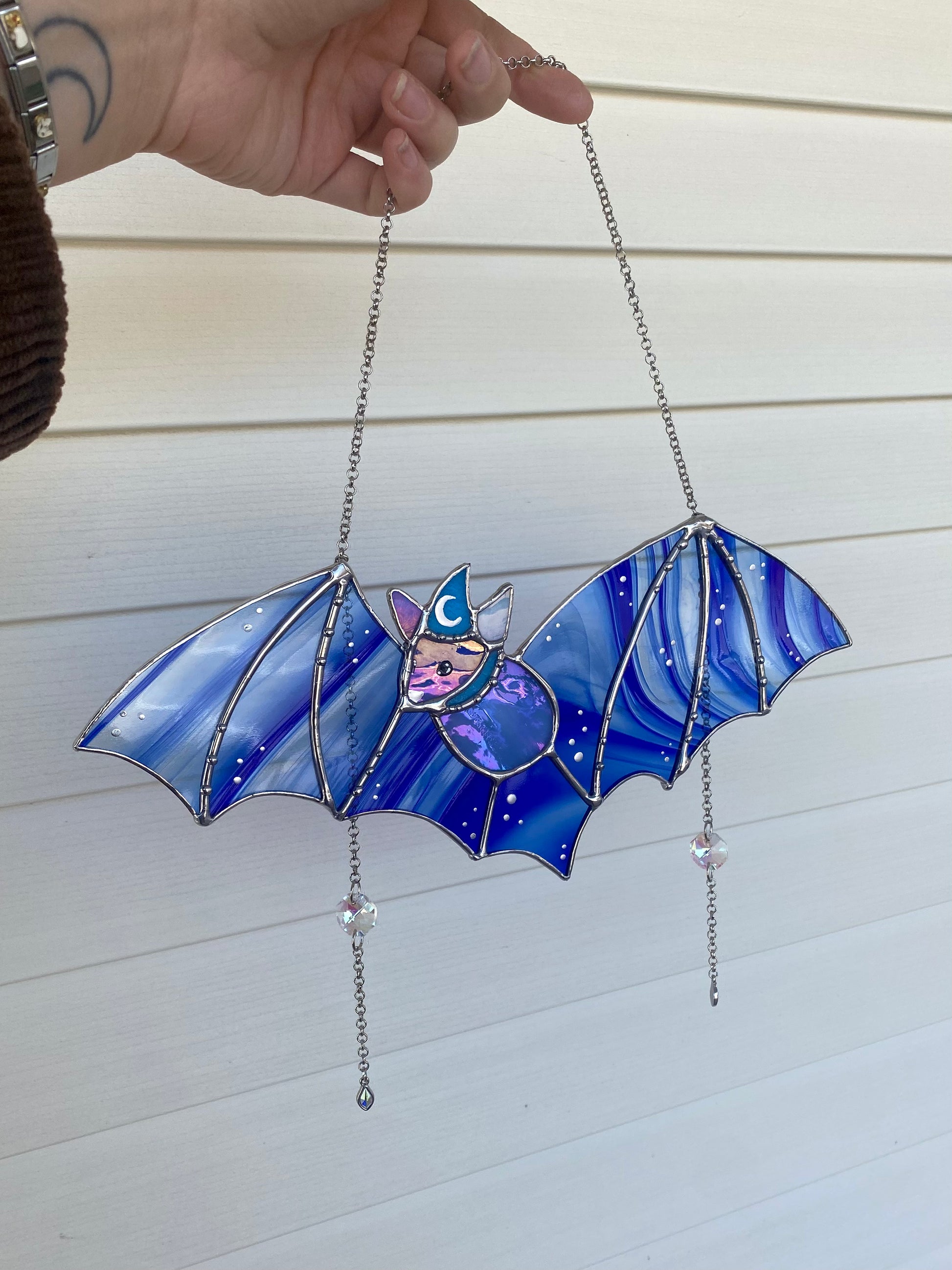 Blue Swirl Wizard Bat Stained Glass Suncatcher