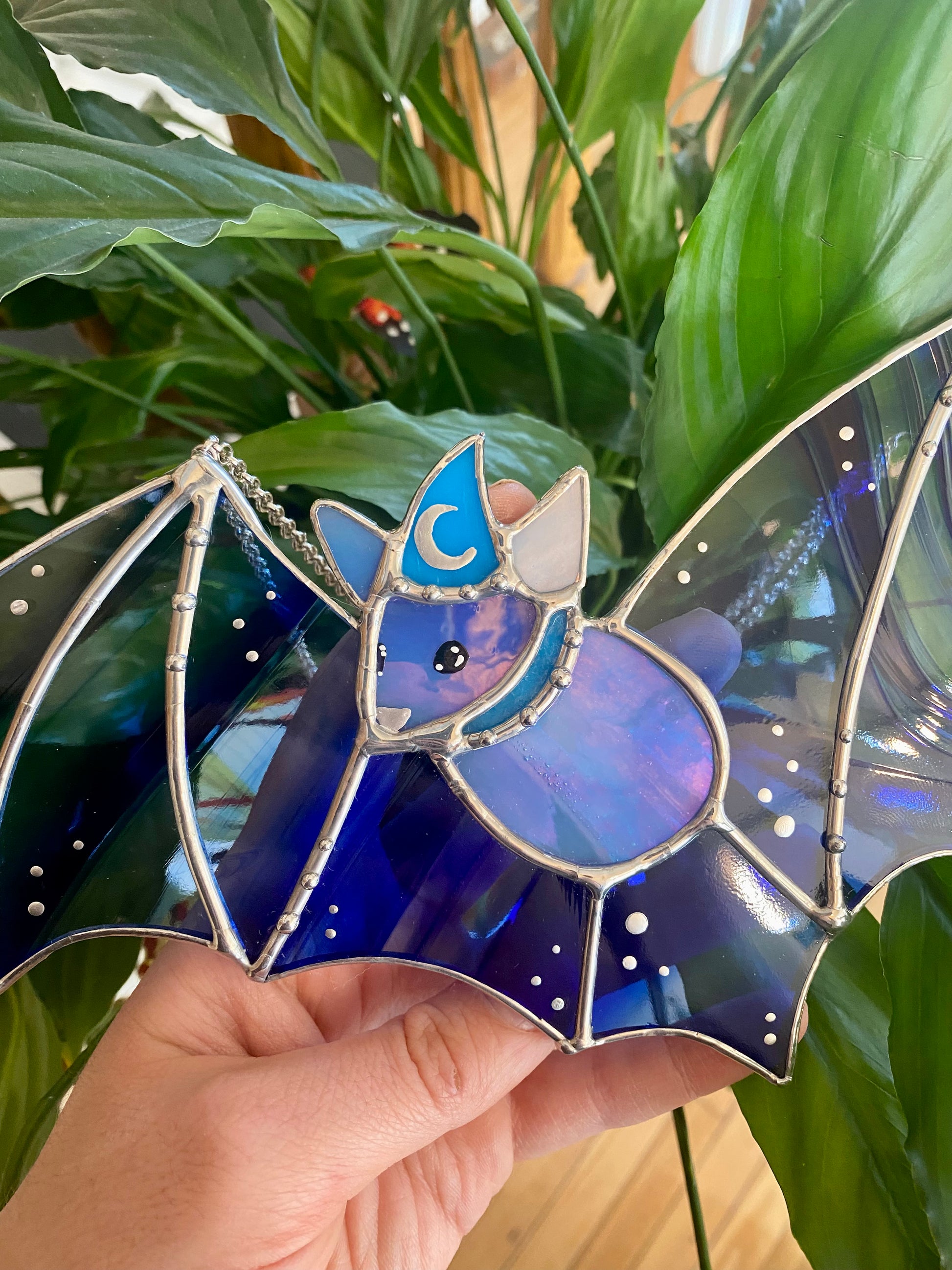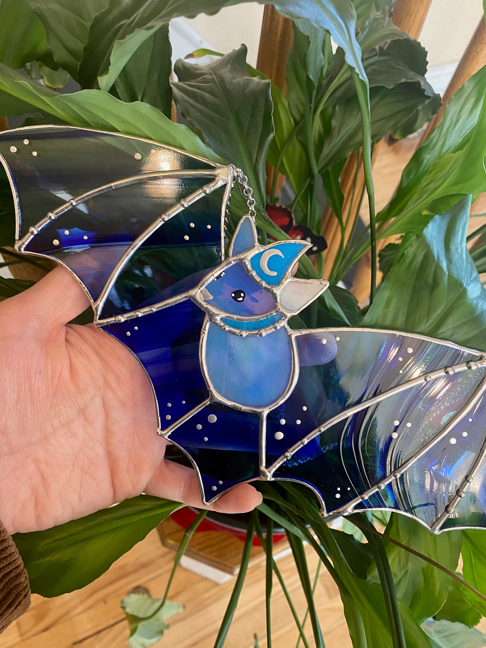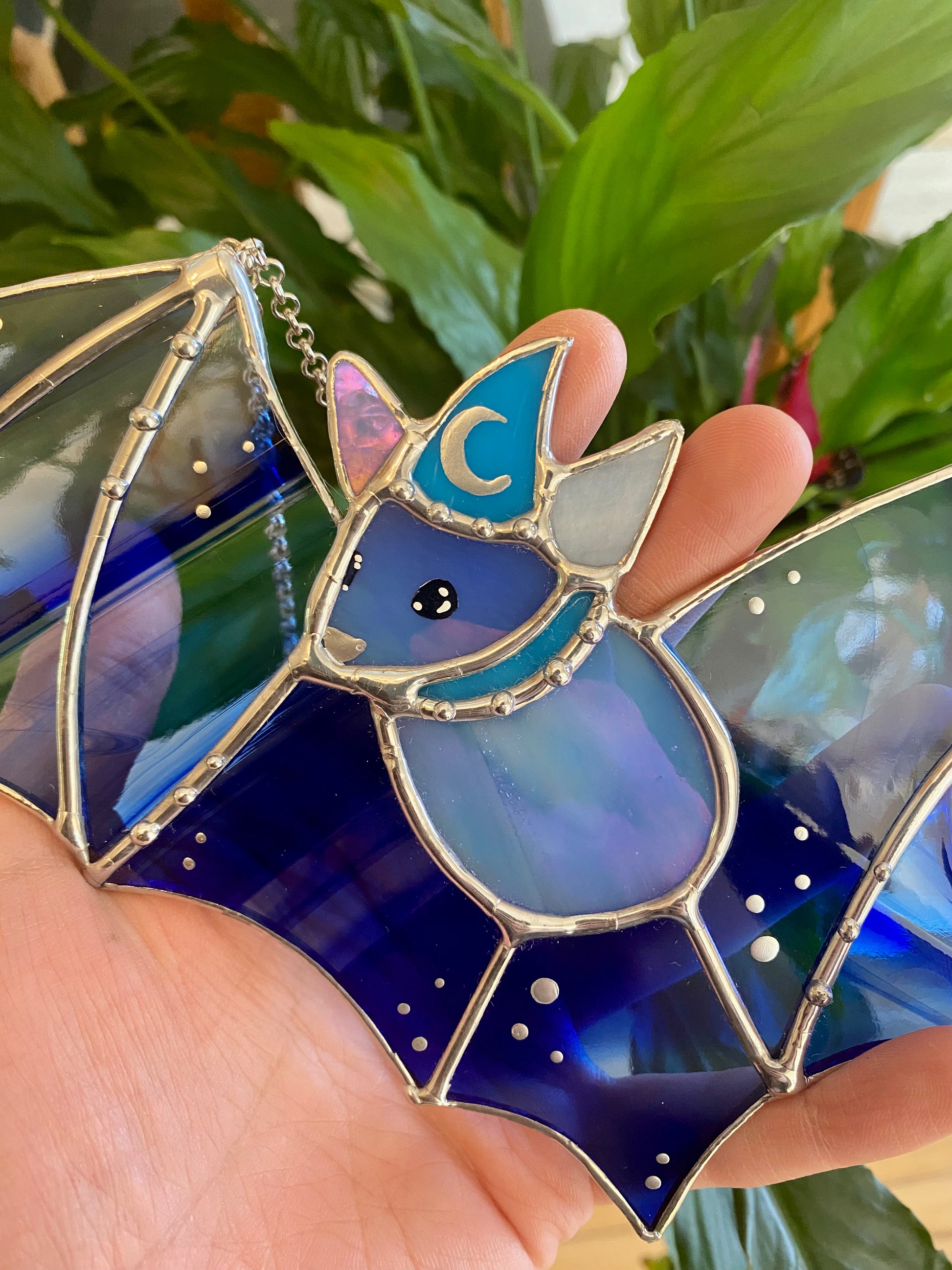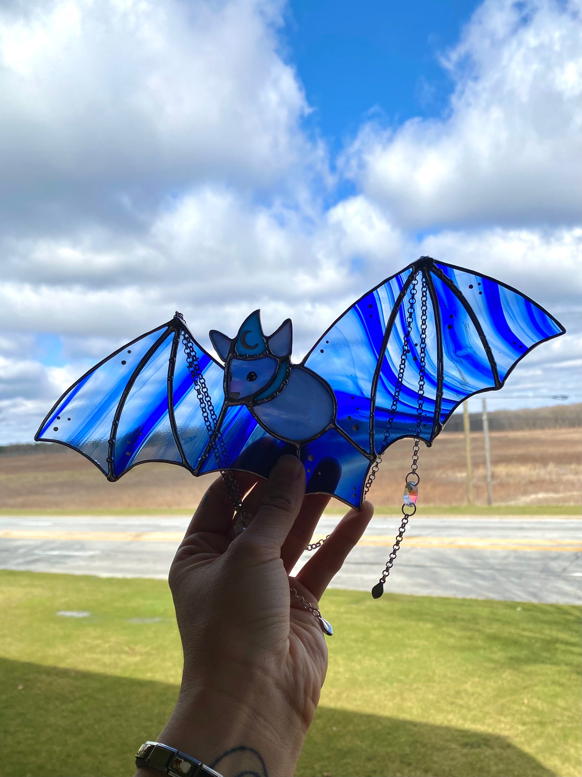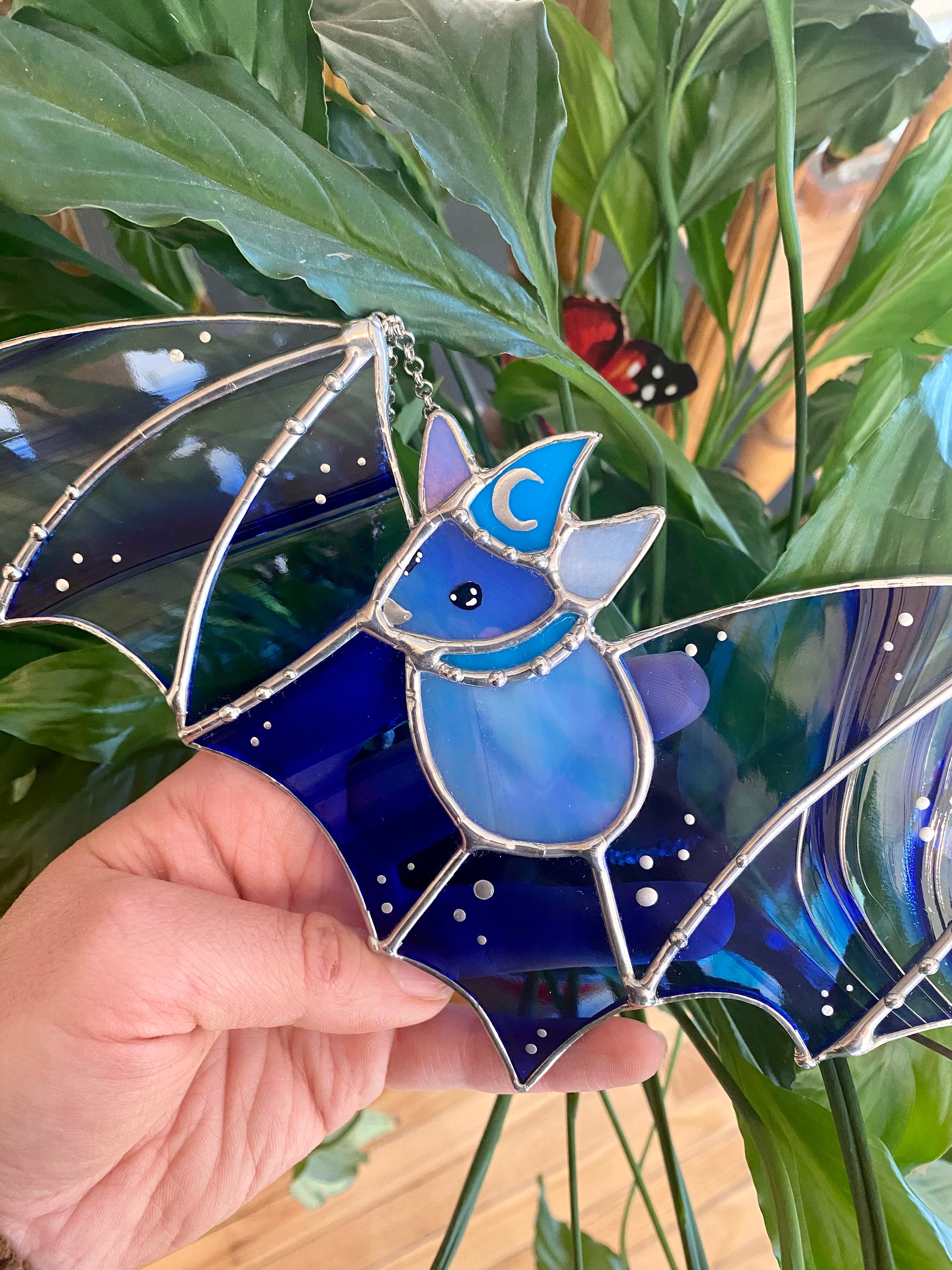 Blue Swirl Wizard Bat Stained Glass Suncatcher