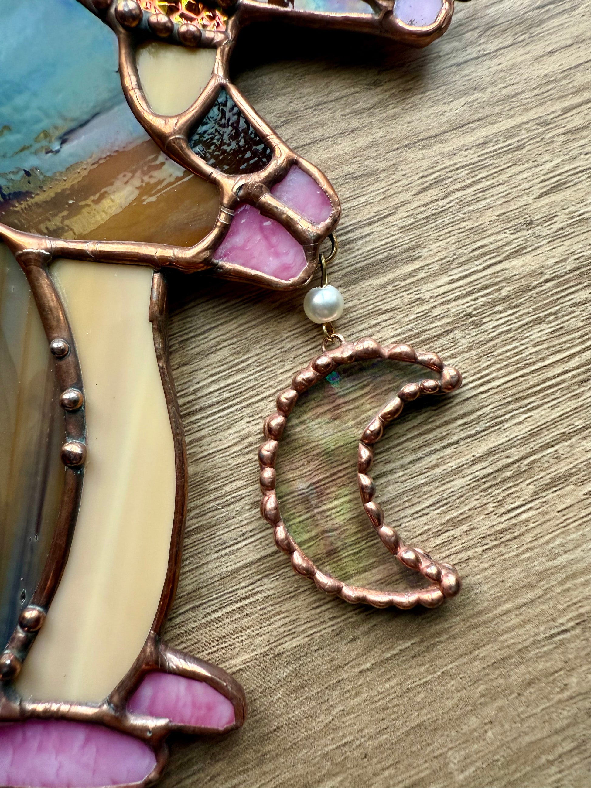 Measures about 9” tall. Hand soldered detailed and painted enamel. Fairy wings are in a textured iridescent glass and pearl and gold chain.