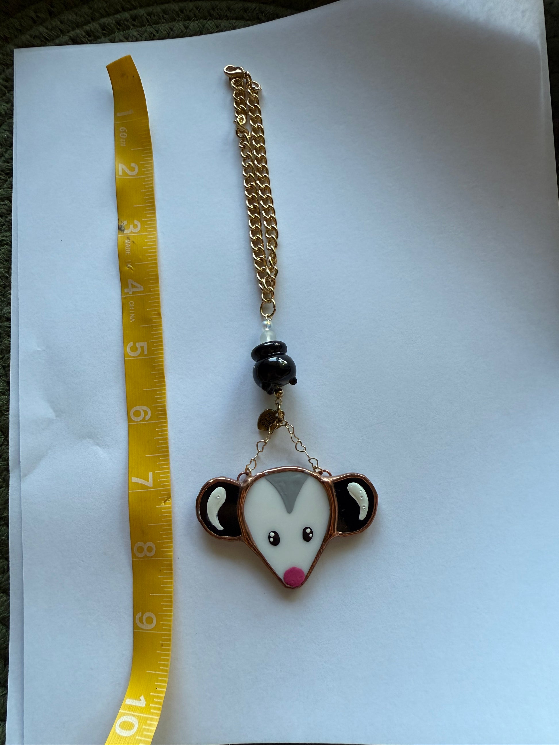 opossum with cauldron charm and gold chain. Has a clasp for easy hanging around rear view mirror.
