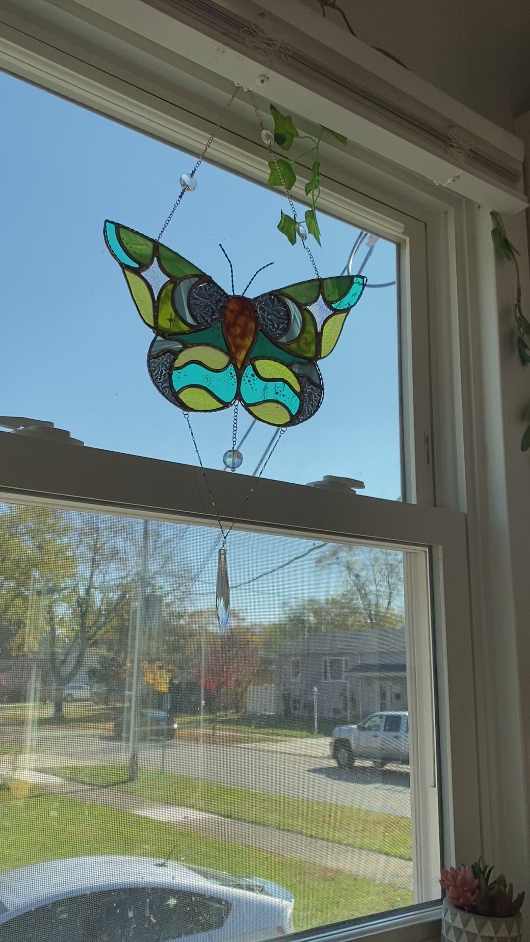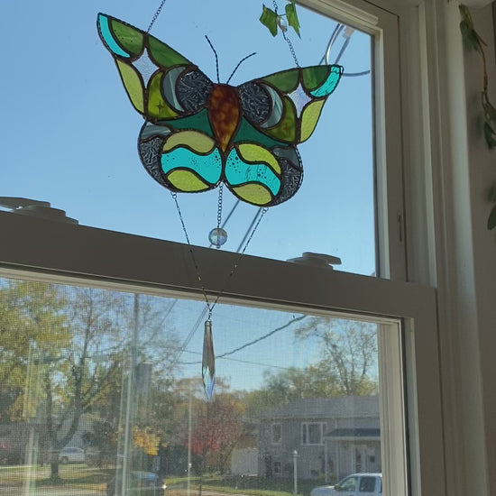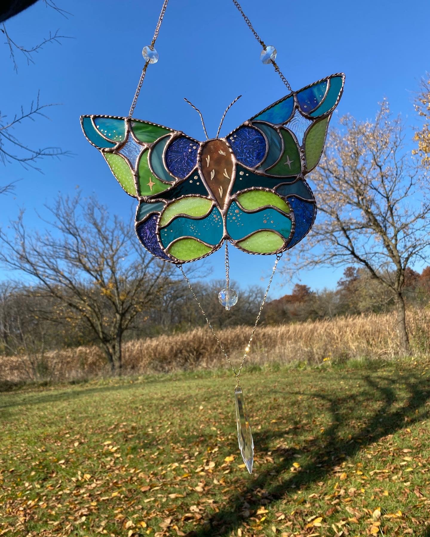 Moth has wingspan of 11". Length including chain and crystals is about 18".