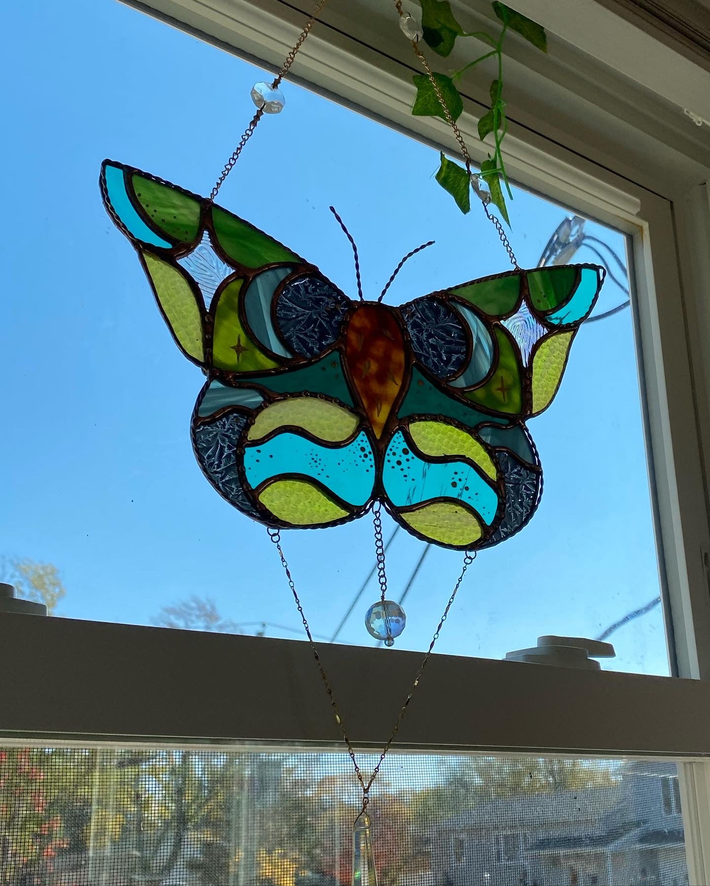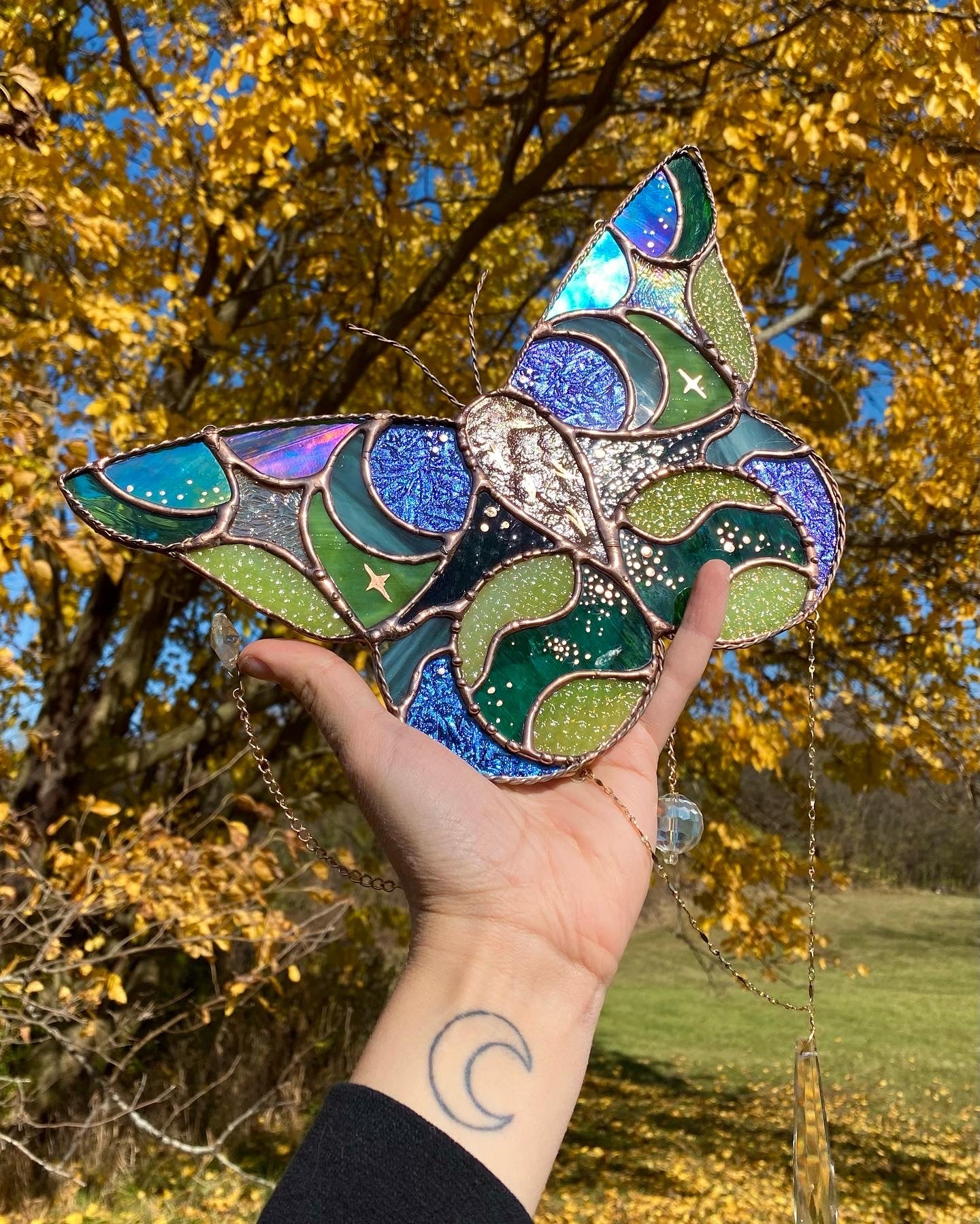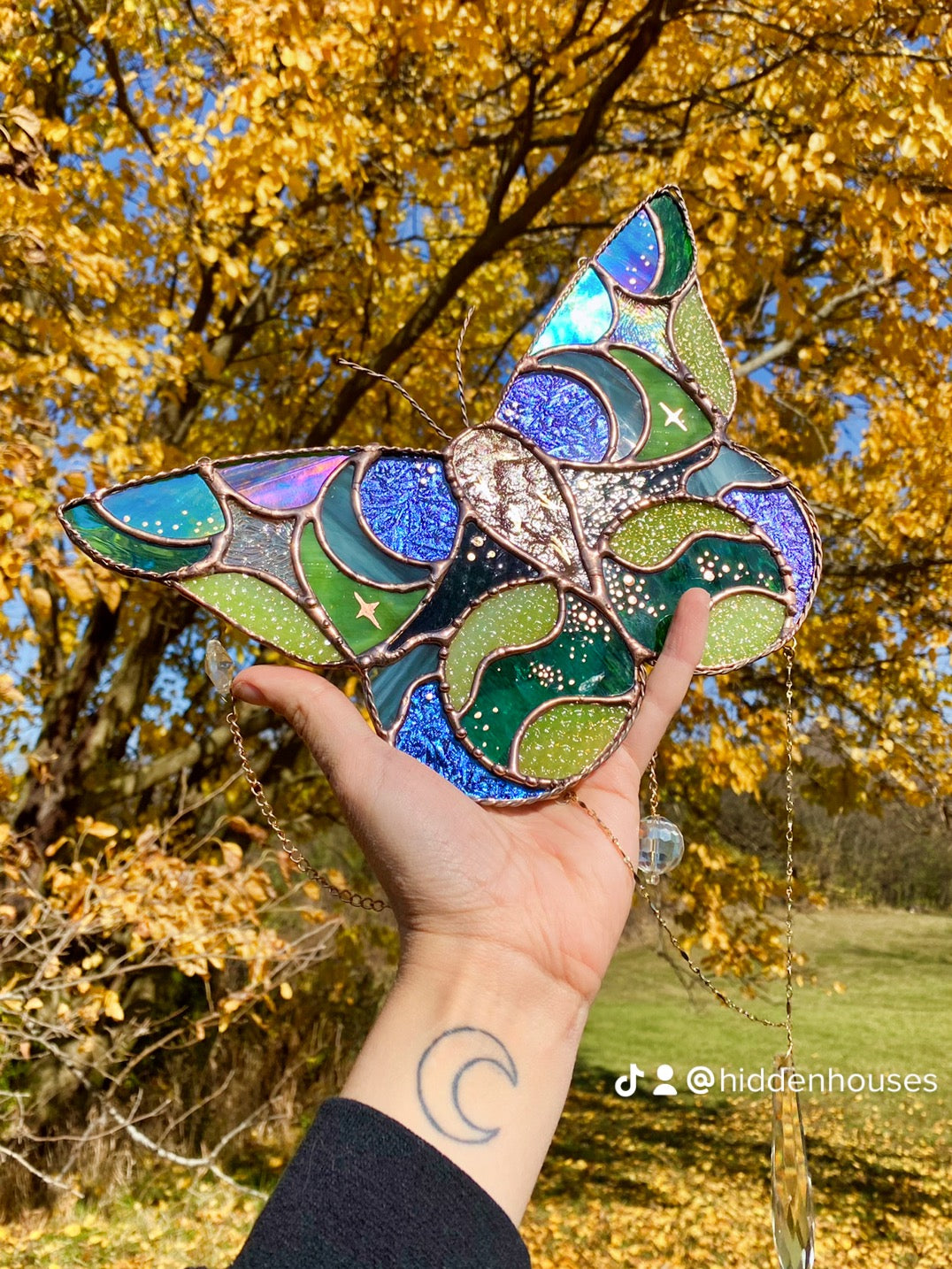 Moth has wingspan of 11". Length including chain and crystals is about 18".
