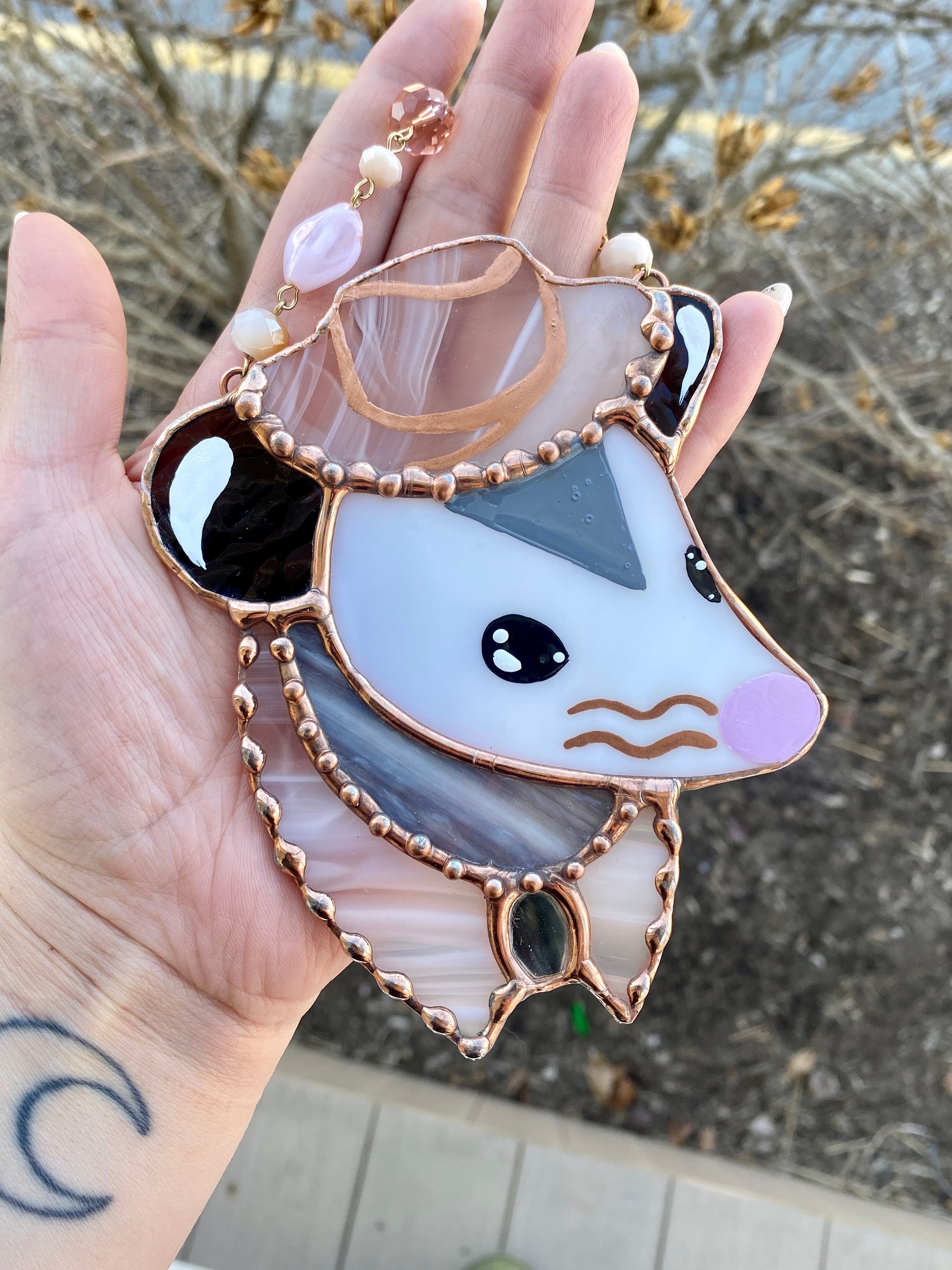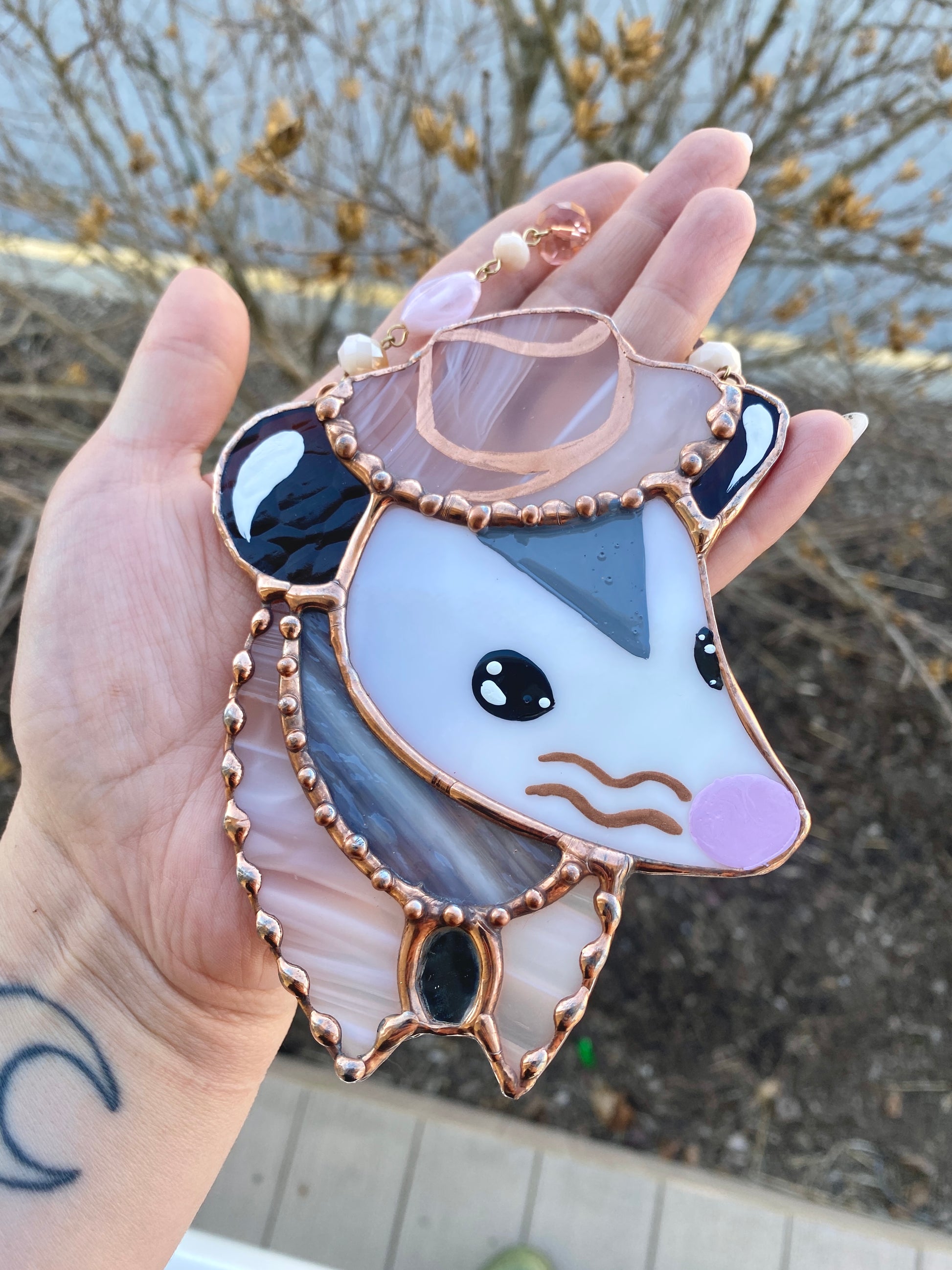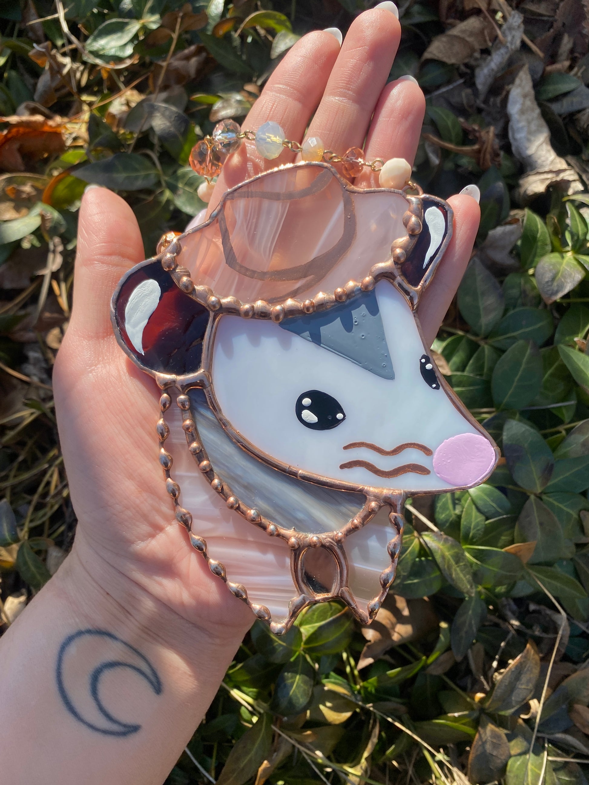 Mini Pink Swirl Cowboy Opossum Stained Glass