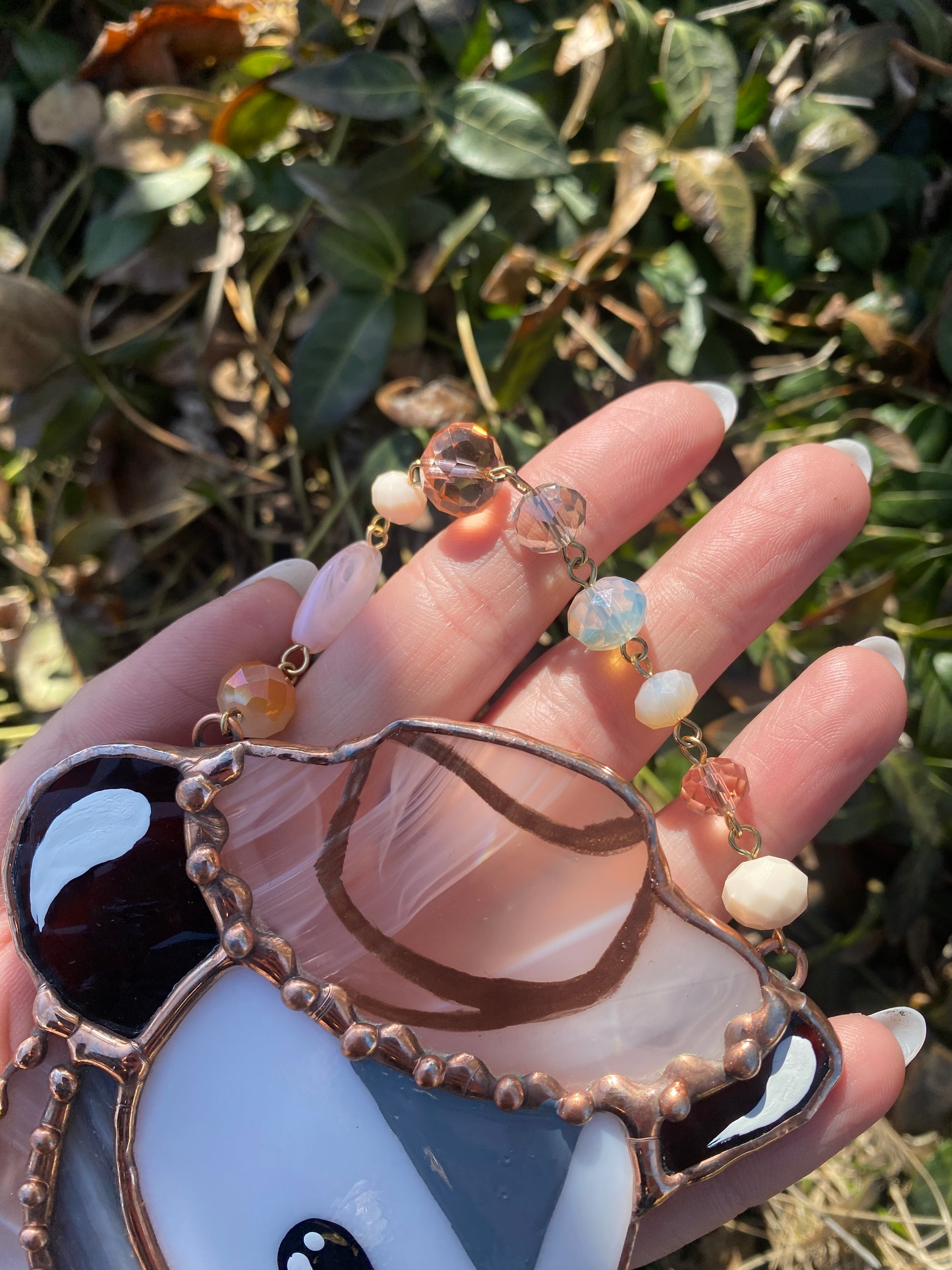 Measures approx 5” by 4”. Made with pink swirl glass, mirror for her bolo tie, and hand painted with enamel. Comes with pink beaded suncatcher chain.