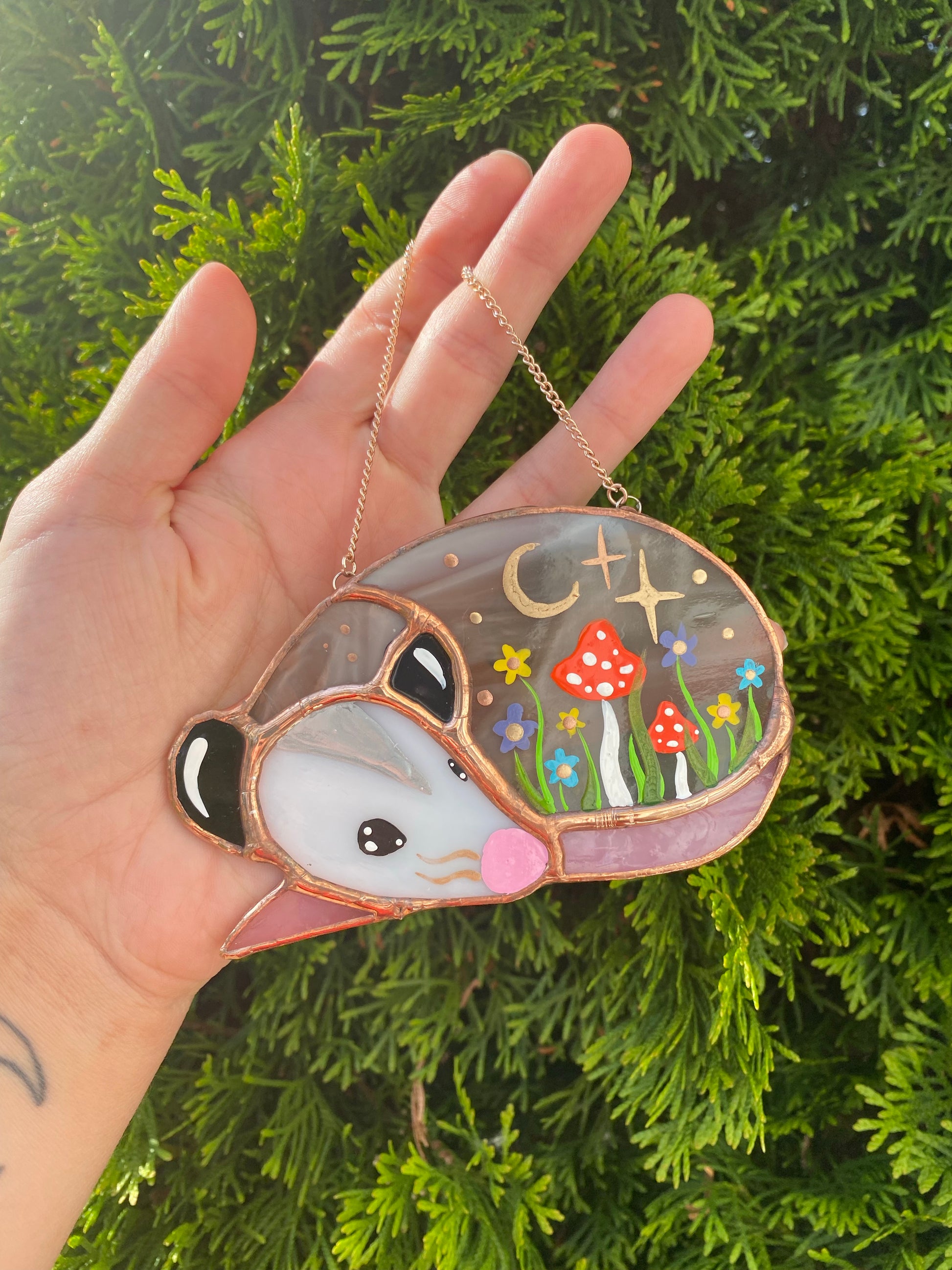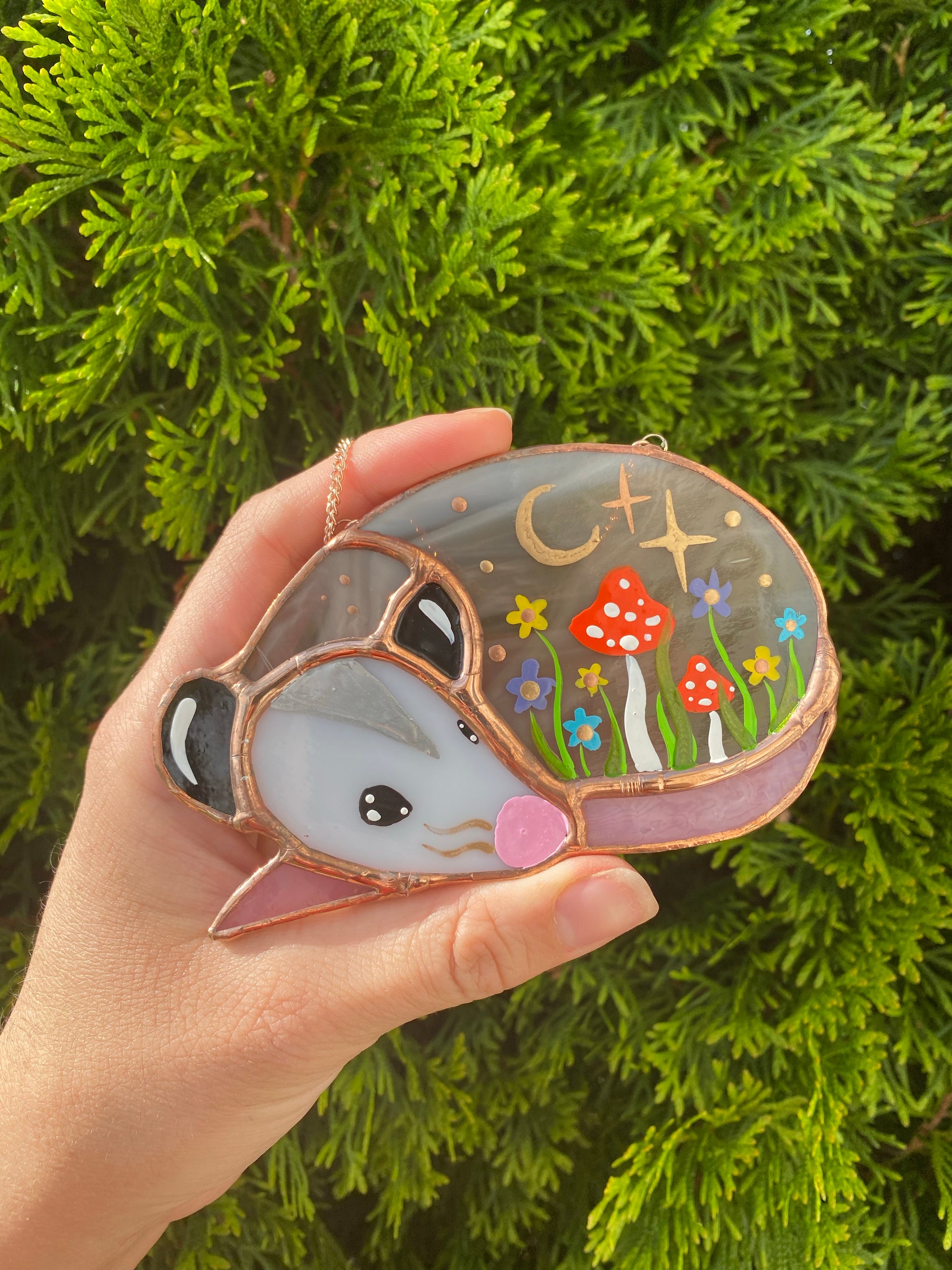Wildflowers and Mushroom SleepyOpossum Mini Stained Glass Suncatcher