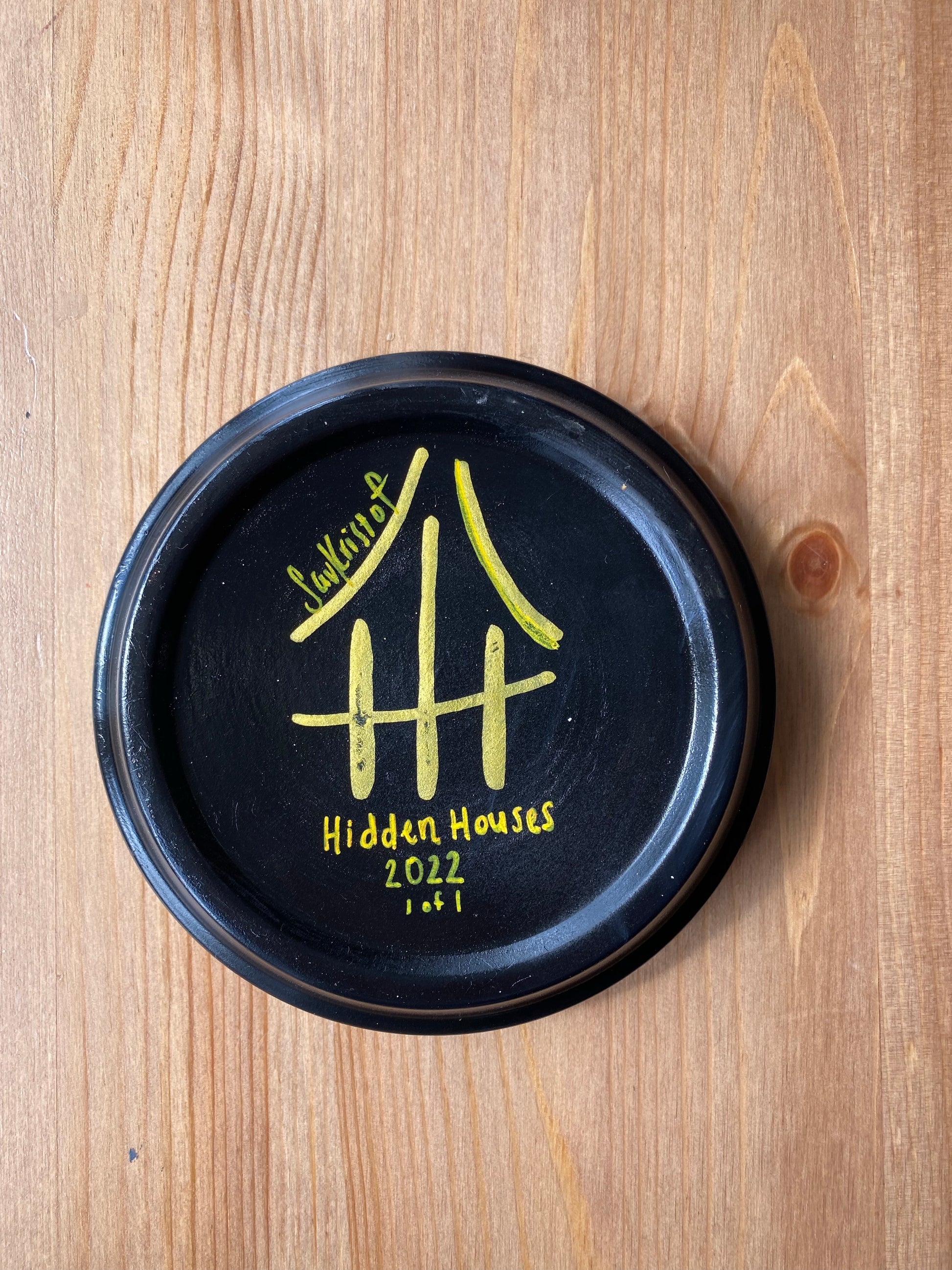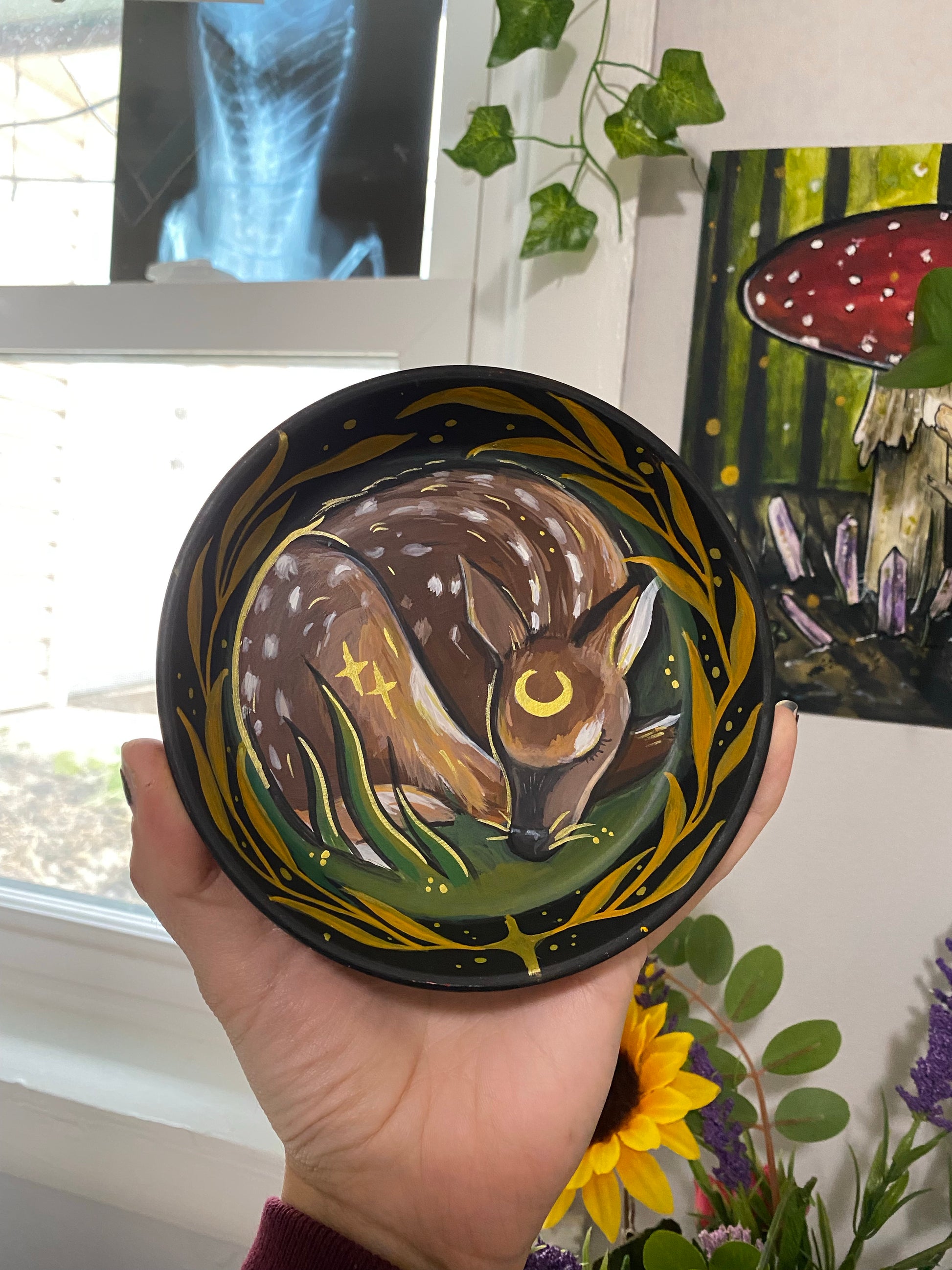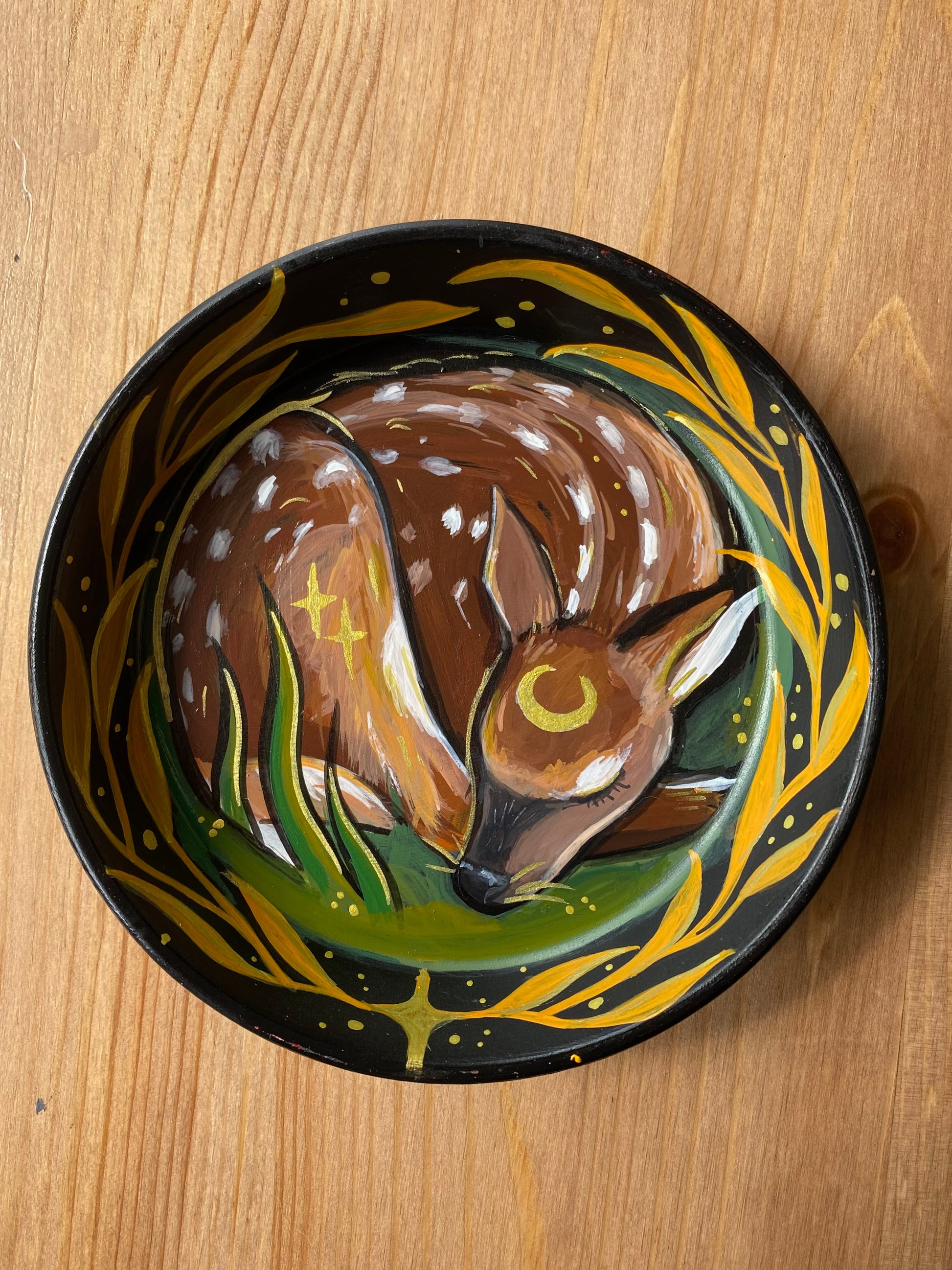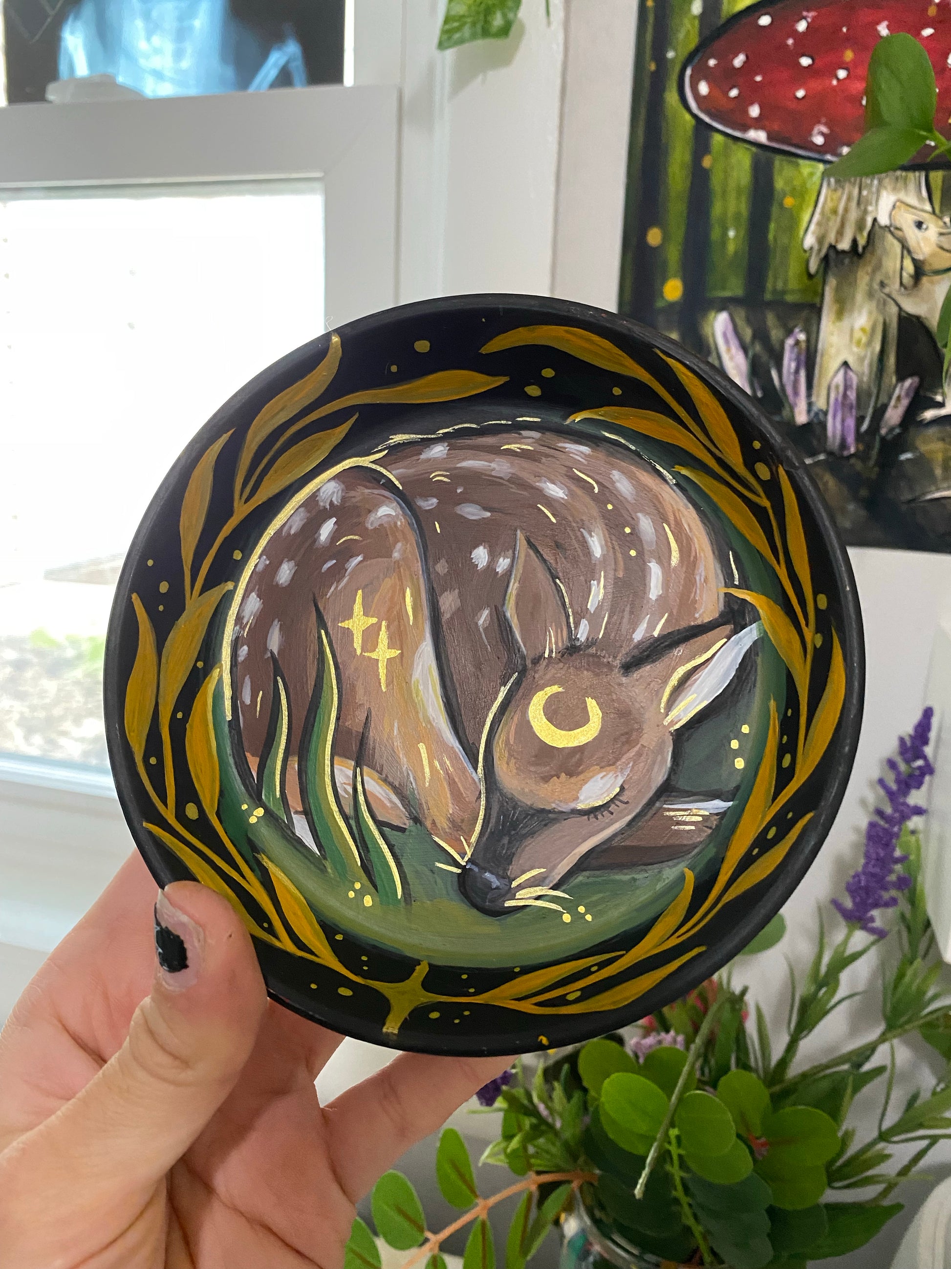 Acrylic on terracotta dish. Varnished and sealed. Clean gently with soap and water only as needed. Measures 5.5” in diameter, 1” deep.