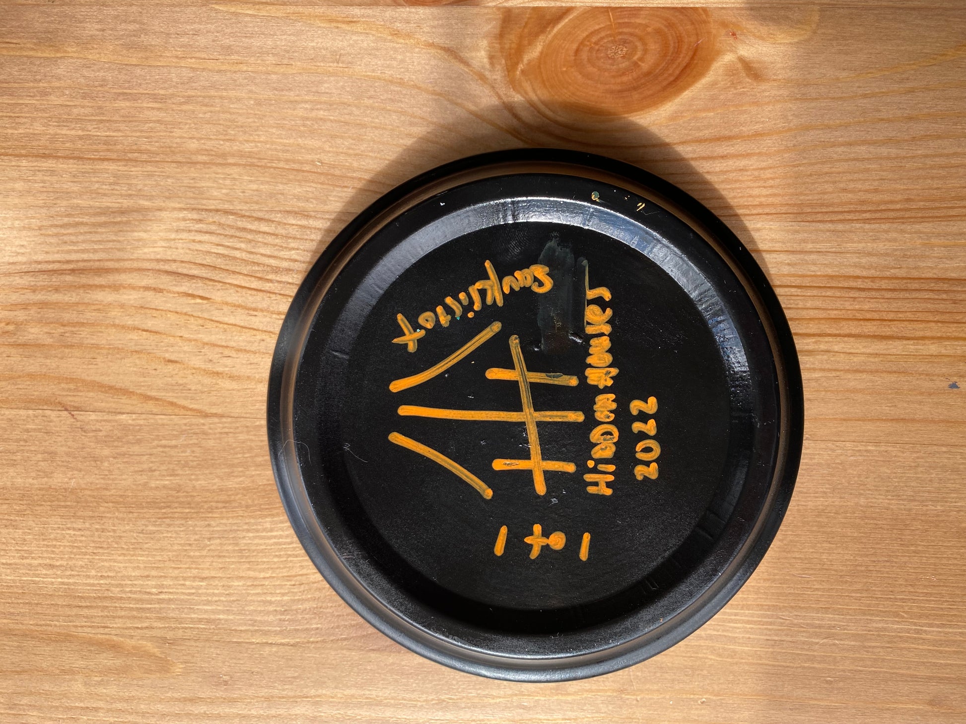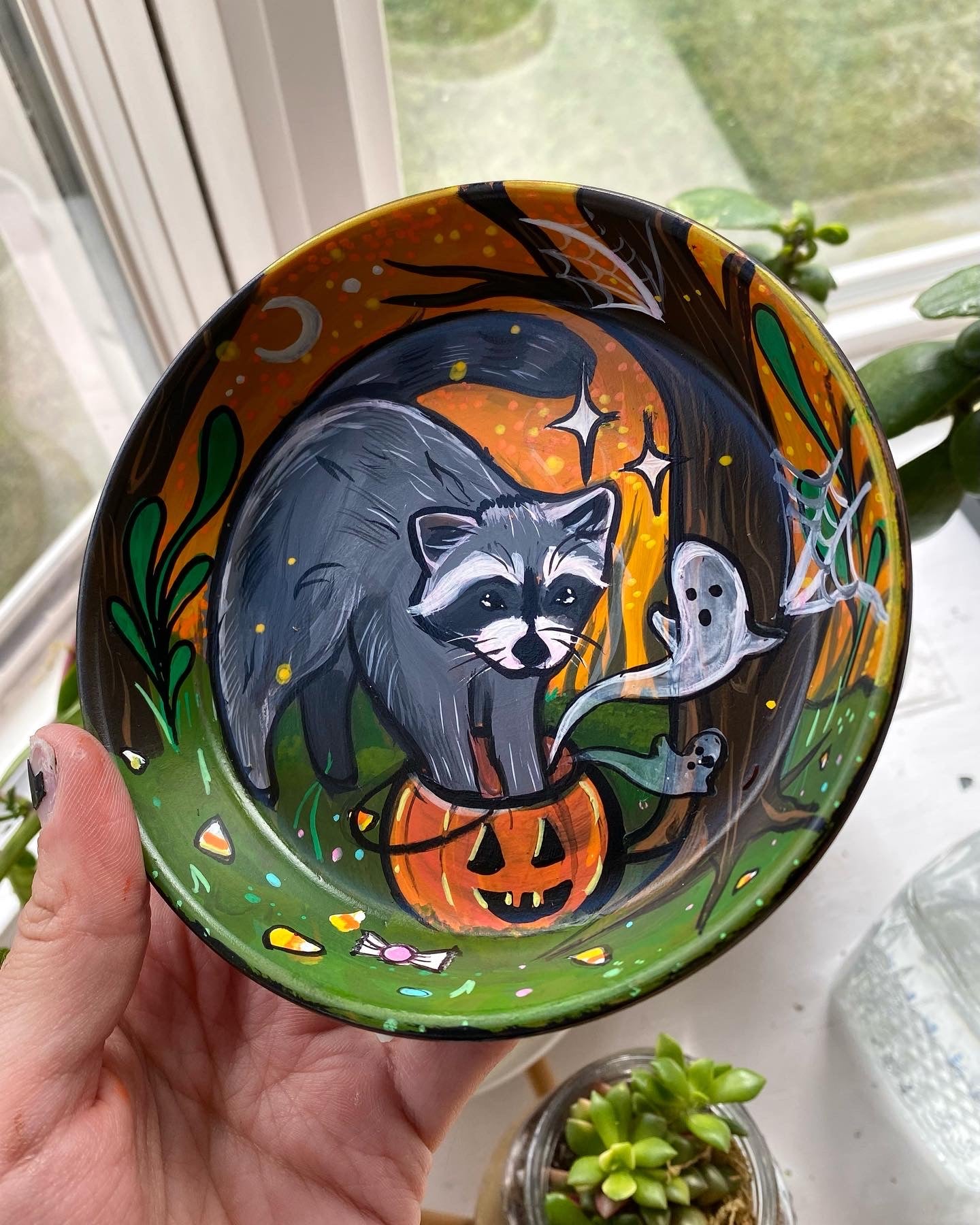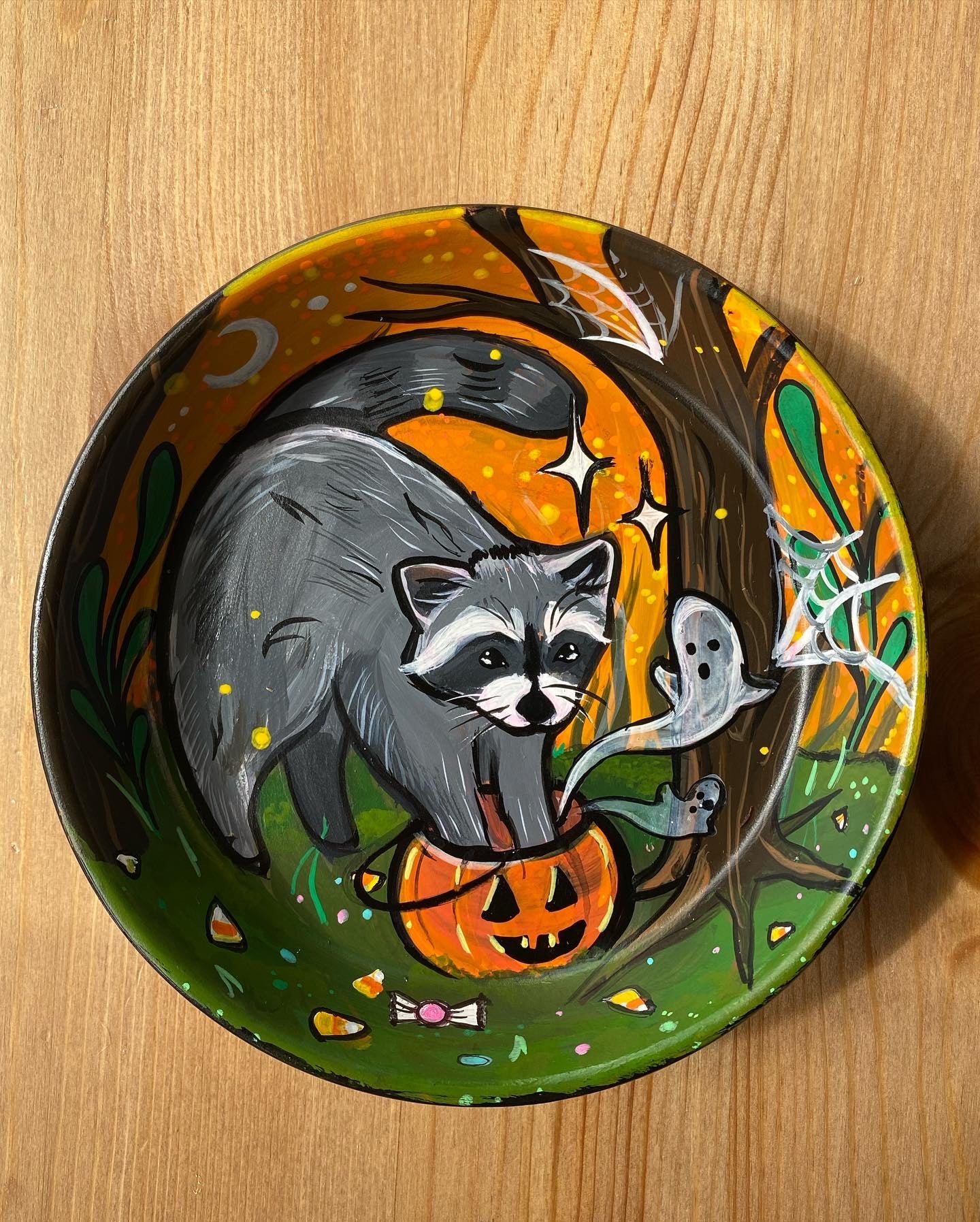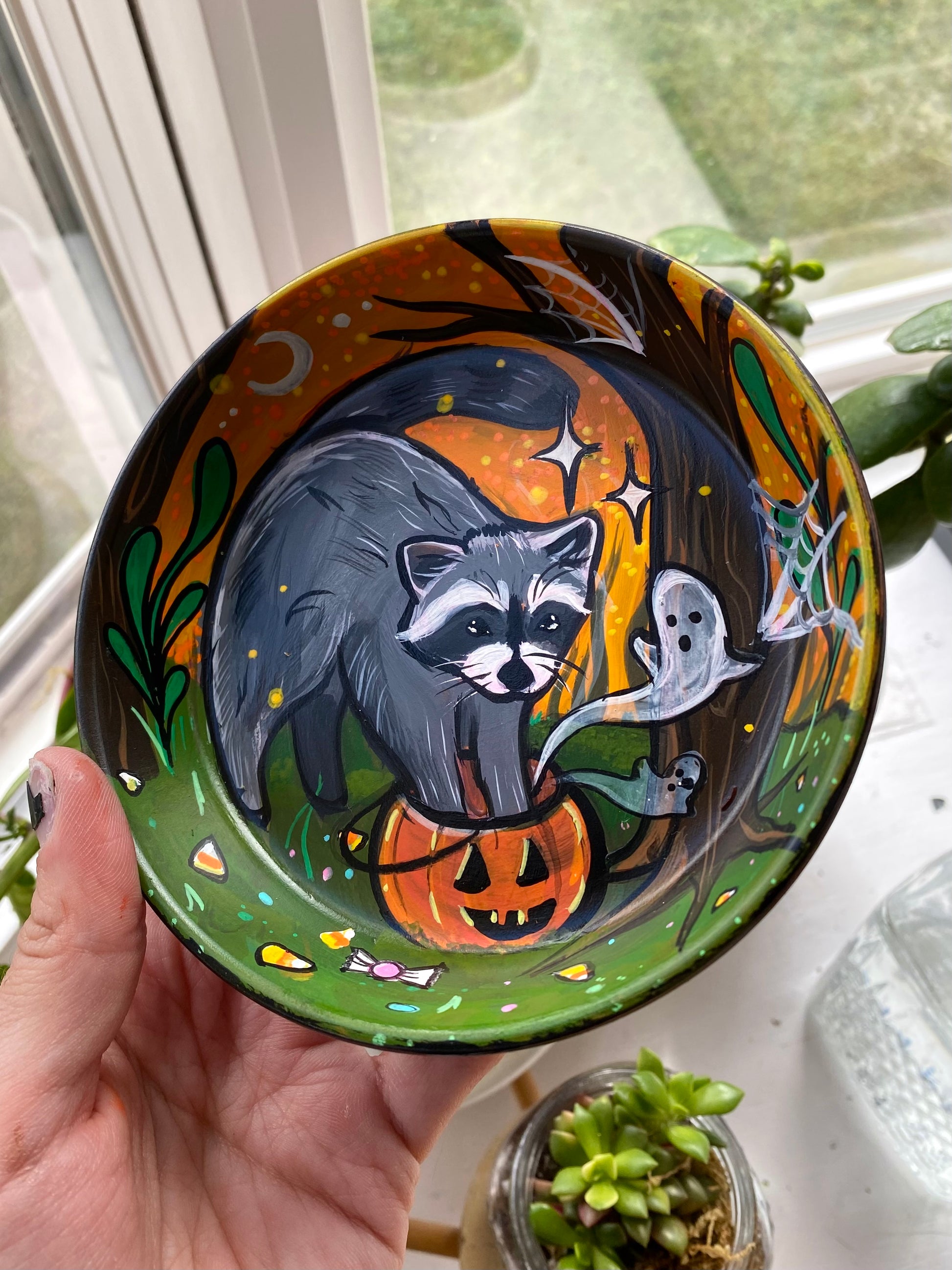 Acrylic on terracotta dish. Varnished and sealed. Clean gently with soap and water only as needed. Measures 5.5” in diameter, 1” deep.