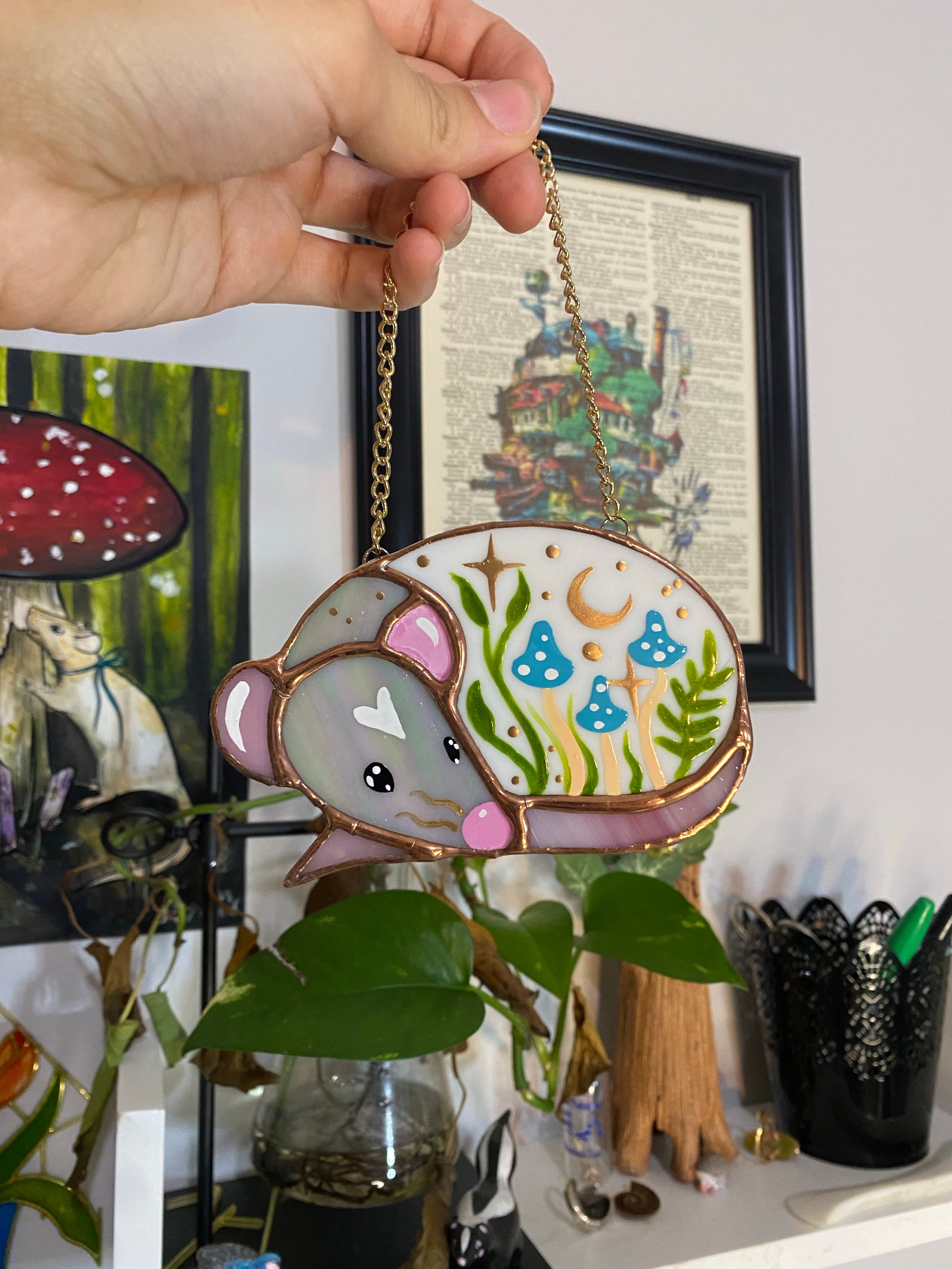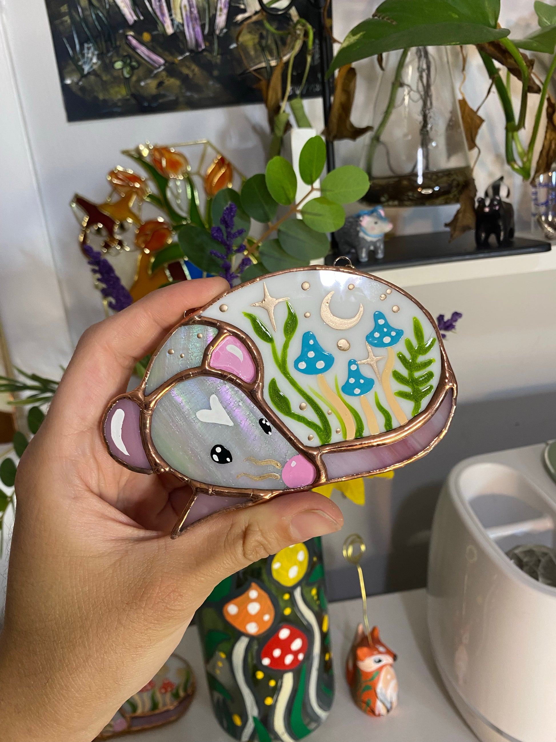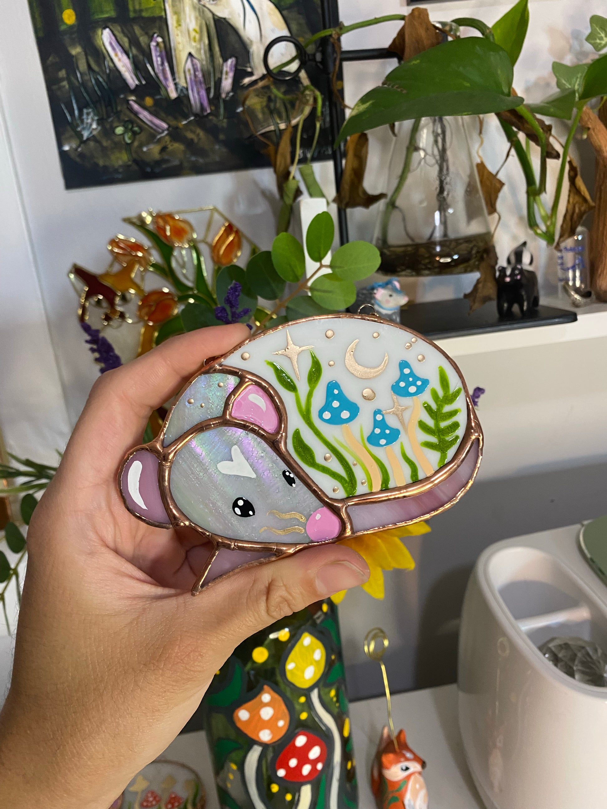Mini Grey Rat and Blue Mushroom Stained Glass Suncatcher