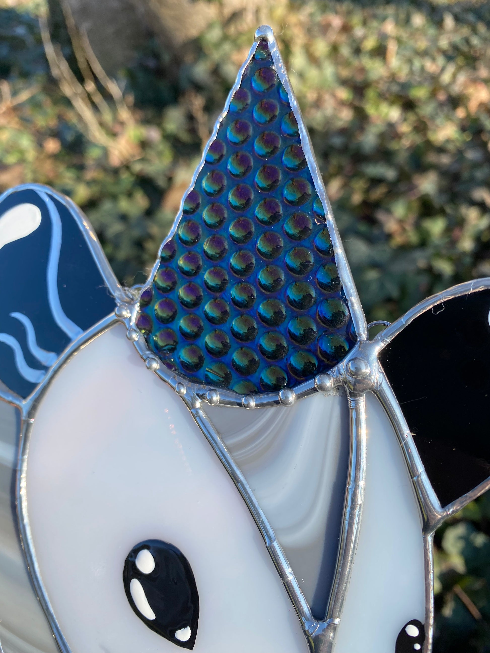 Measures 8.5” tall and 6” wide. Made with iridescent and Van Gogh glass. Has a silver chain and screw-in hook to hang her up wherever you please!
