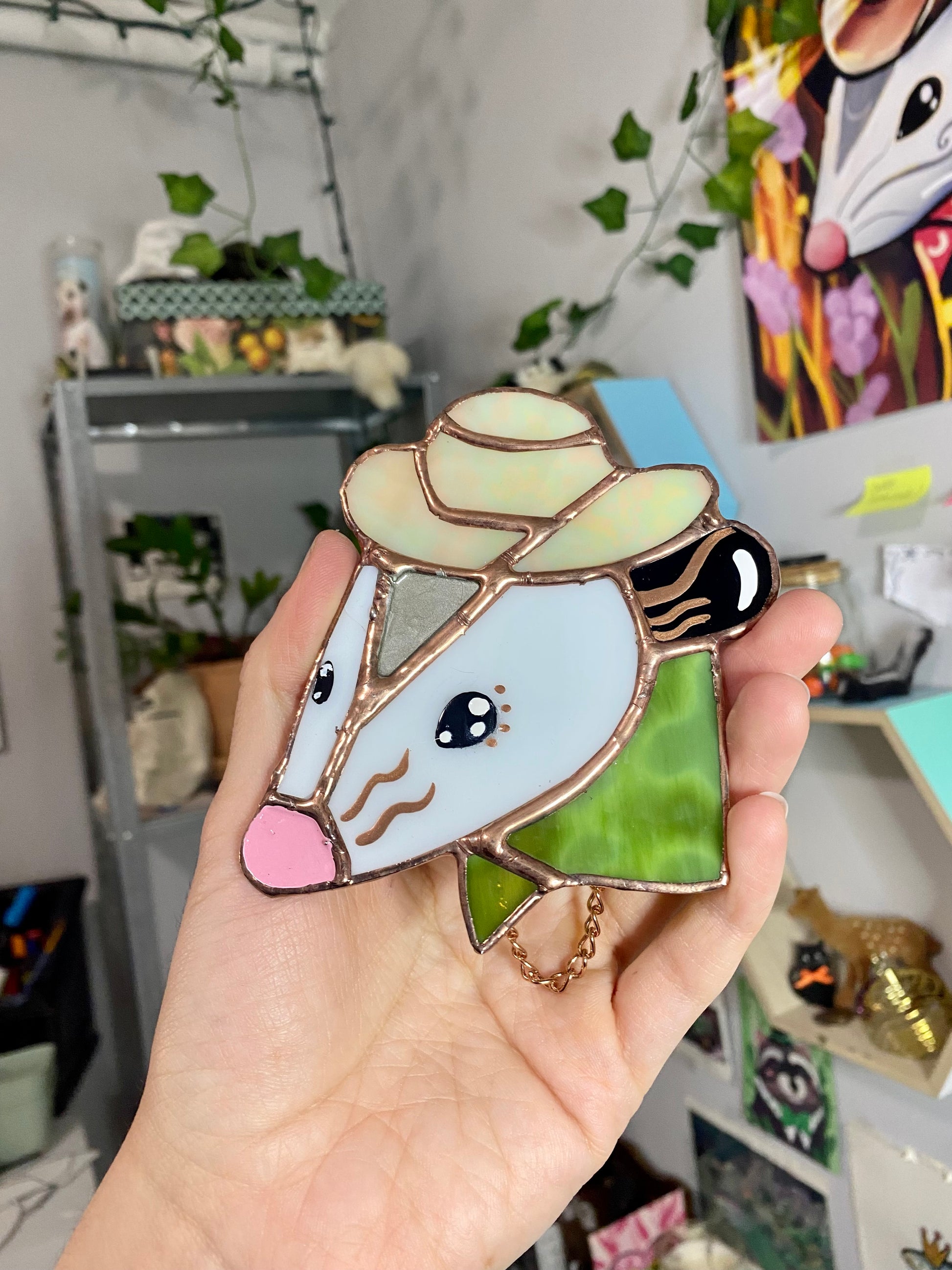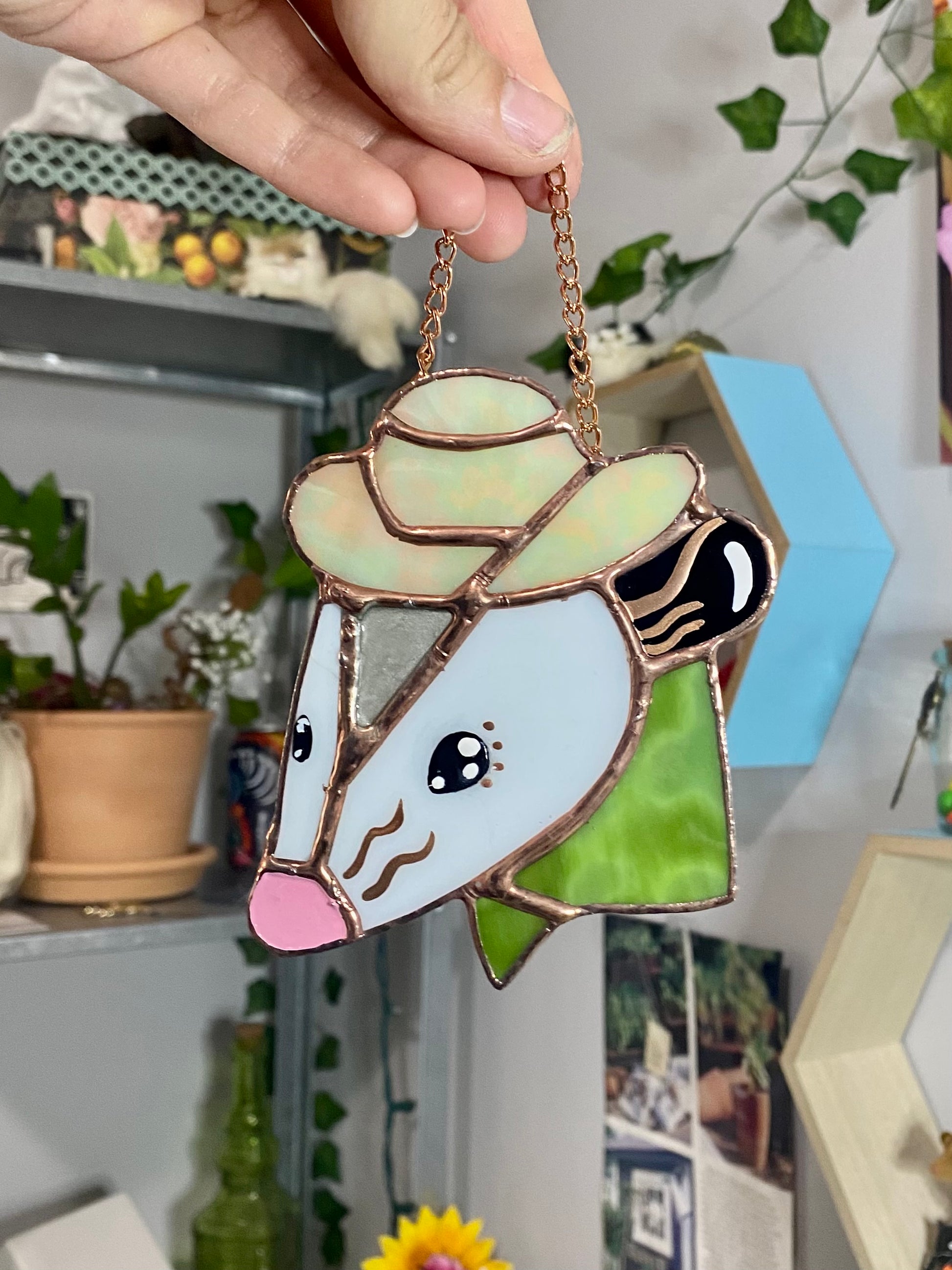 A baby version of my original cowboy opossum. These are the perfect size for use as ornaments, car decoration, or as a suncatcher. Measures 4.5” tall and 3” wide. Has a red ribbon to hang him up wherever you please!