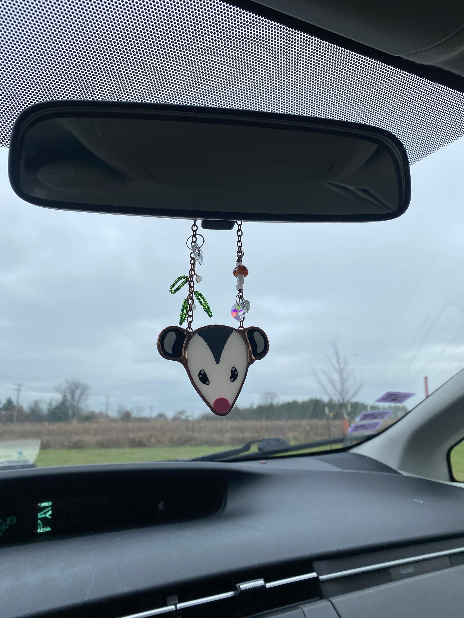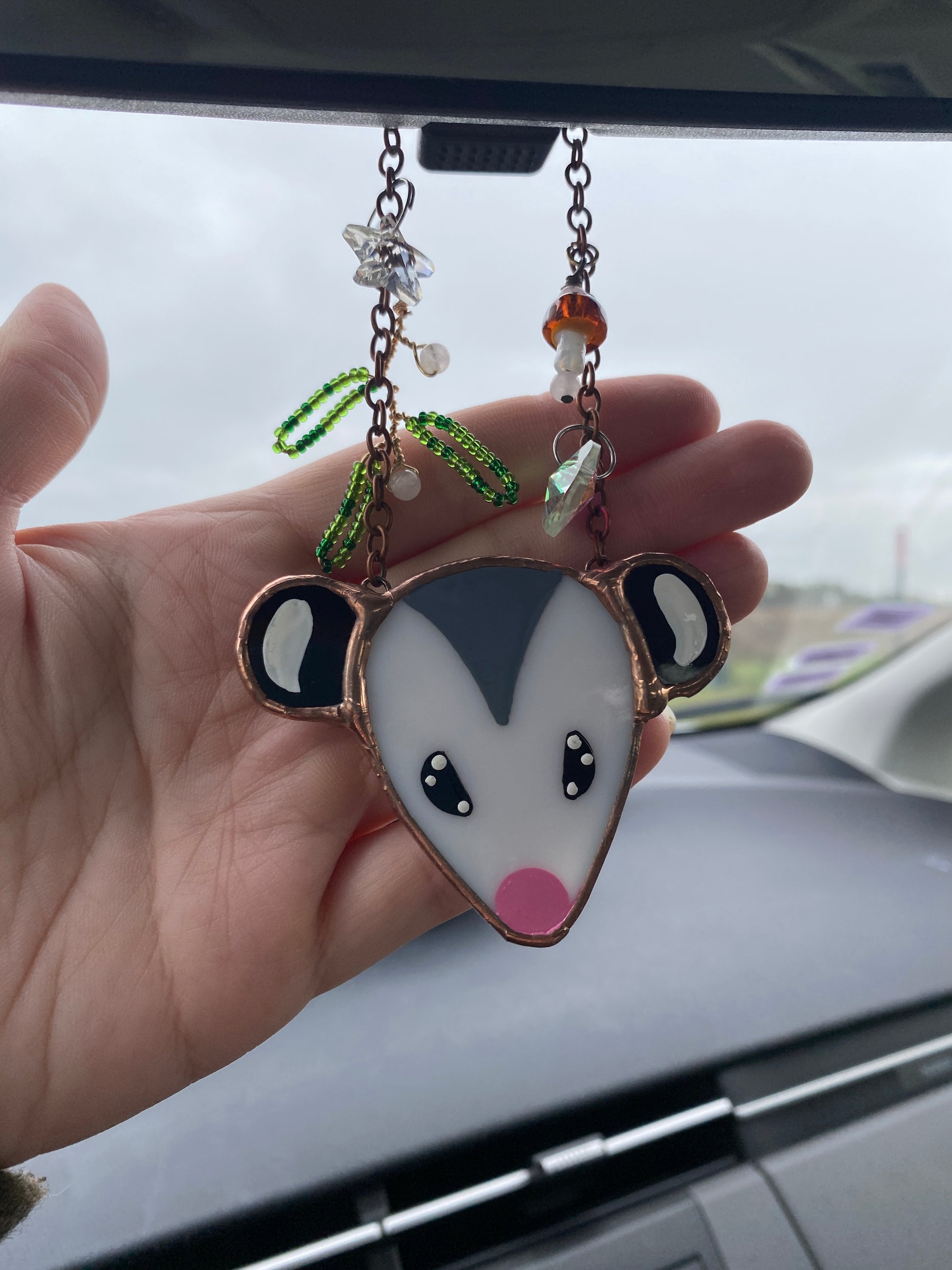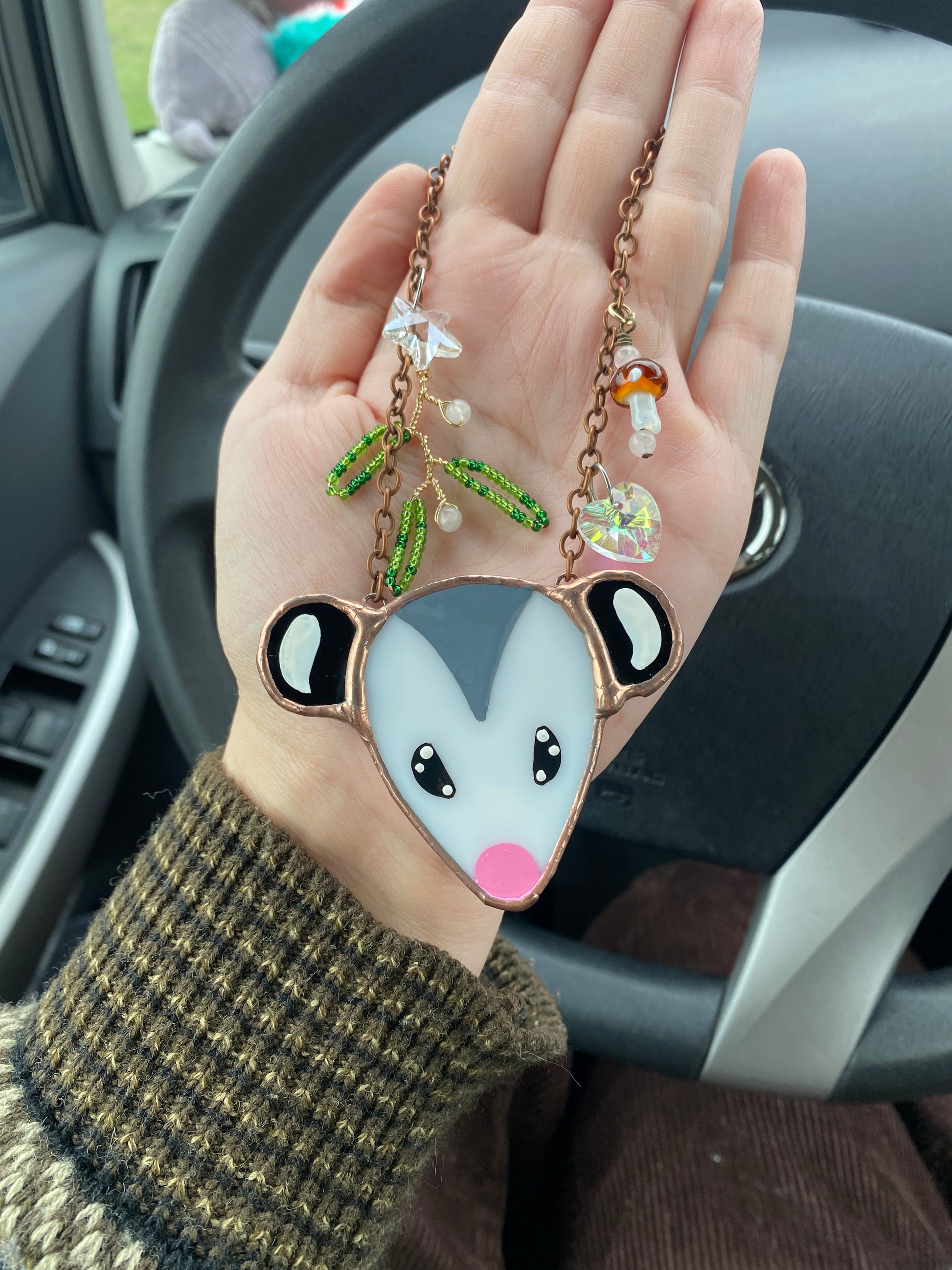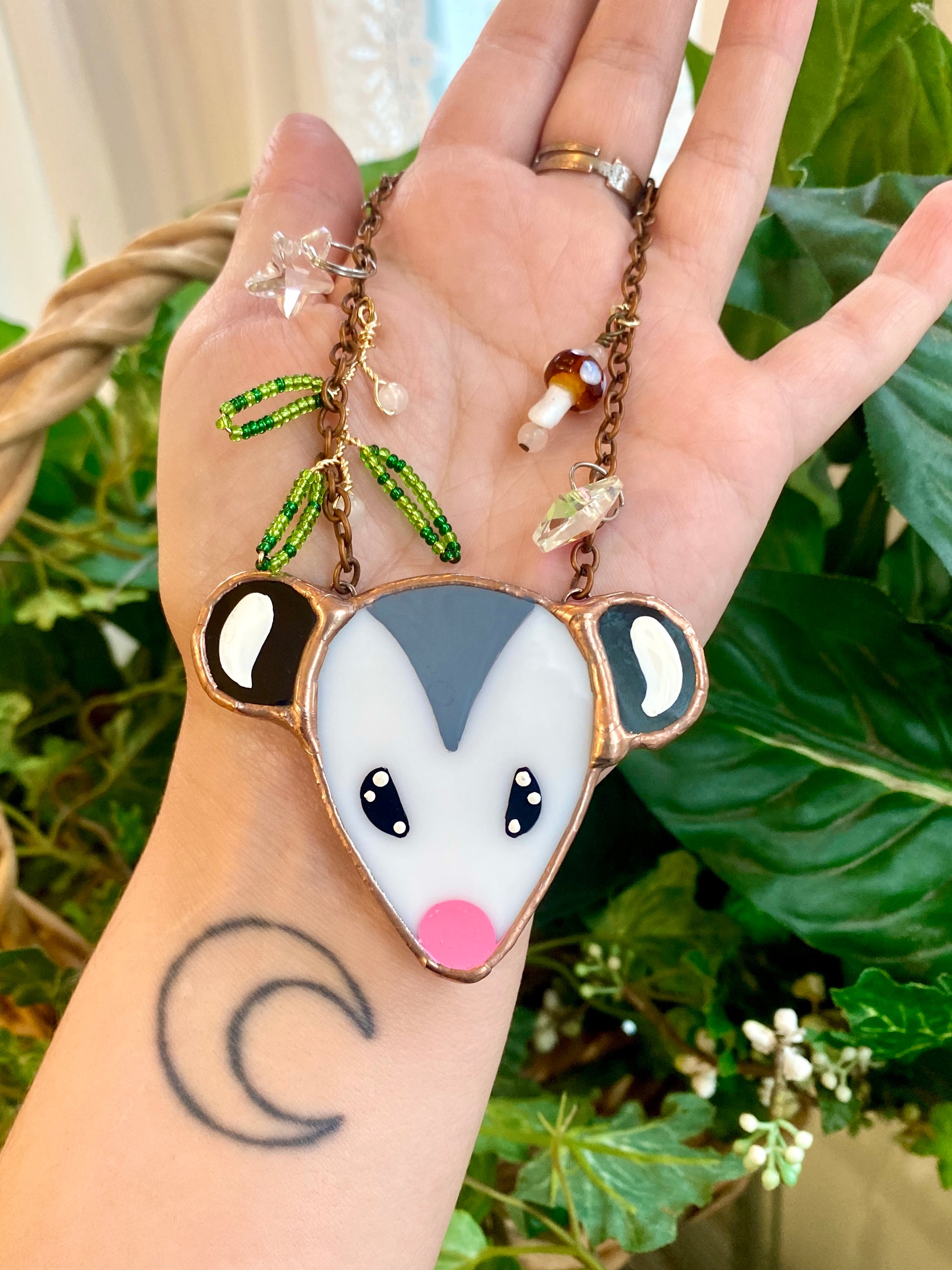 Opossum measures 2.73” by 2.3”. Total length of 6.5”. Comes on a copper chain with mushroom bead, suncatcher beads, and beaded leaf.