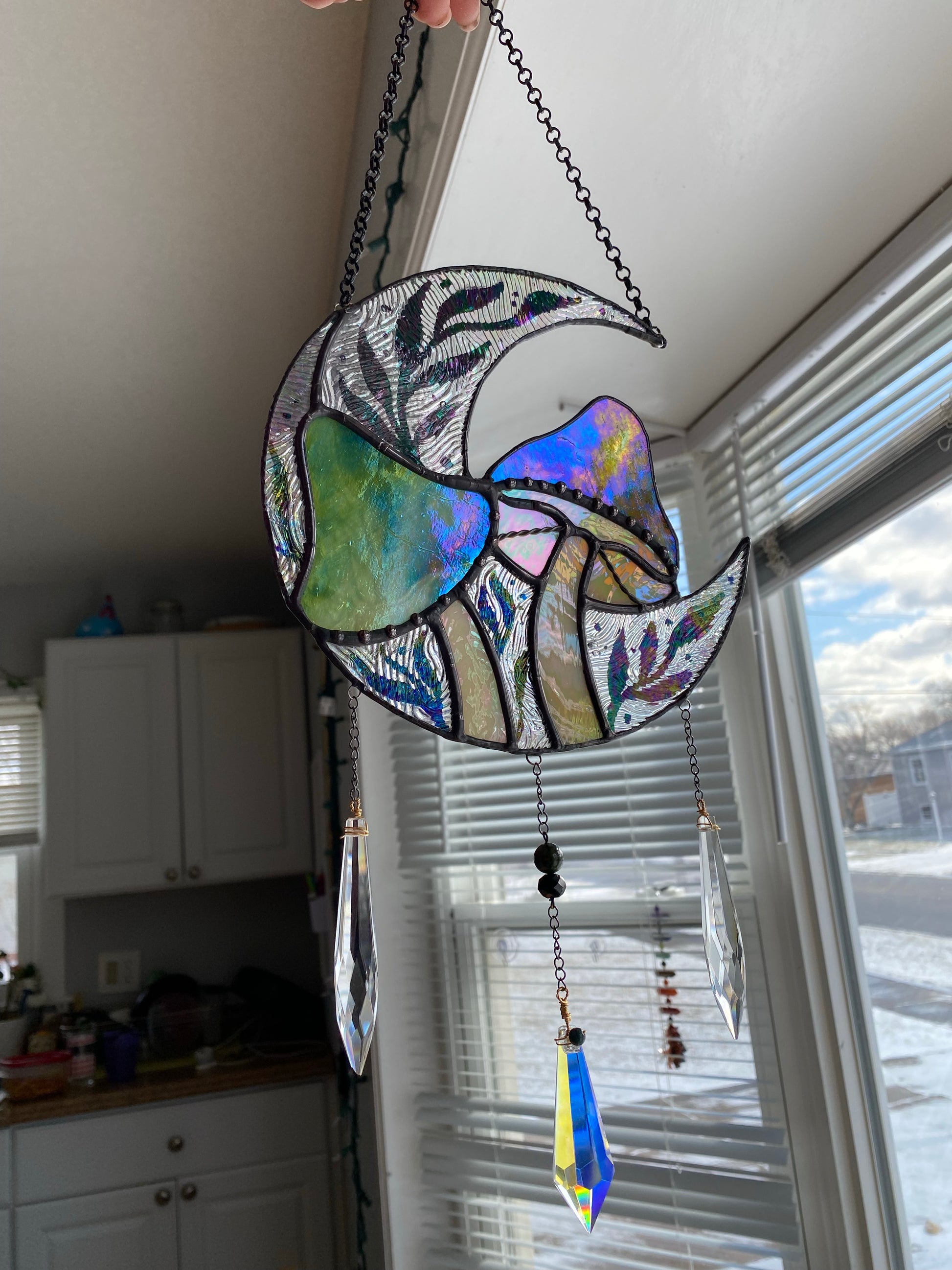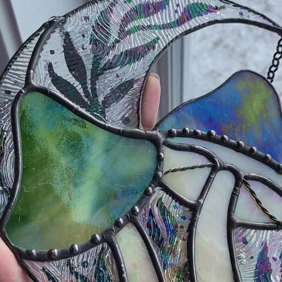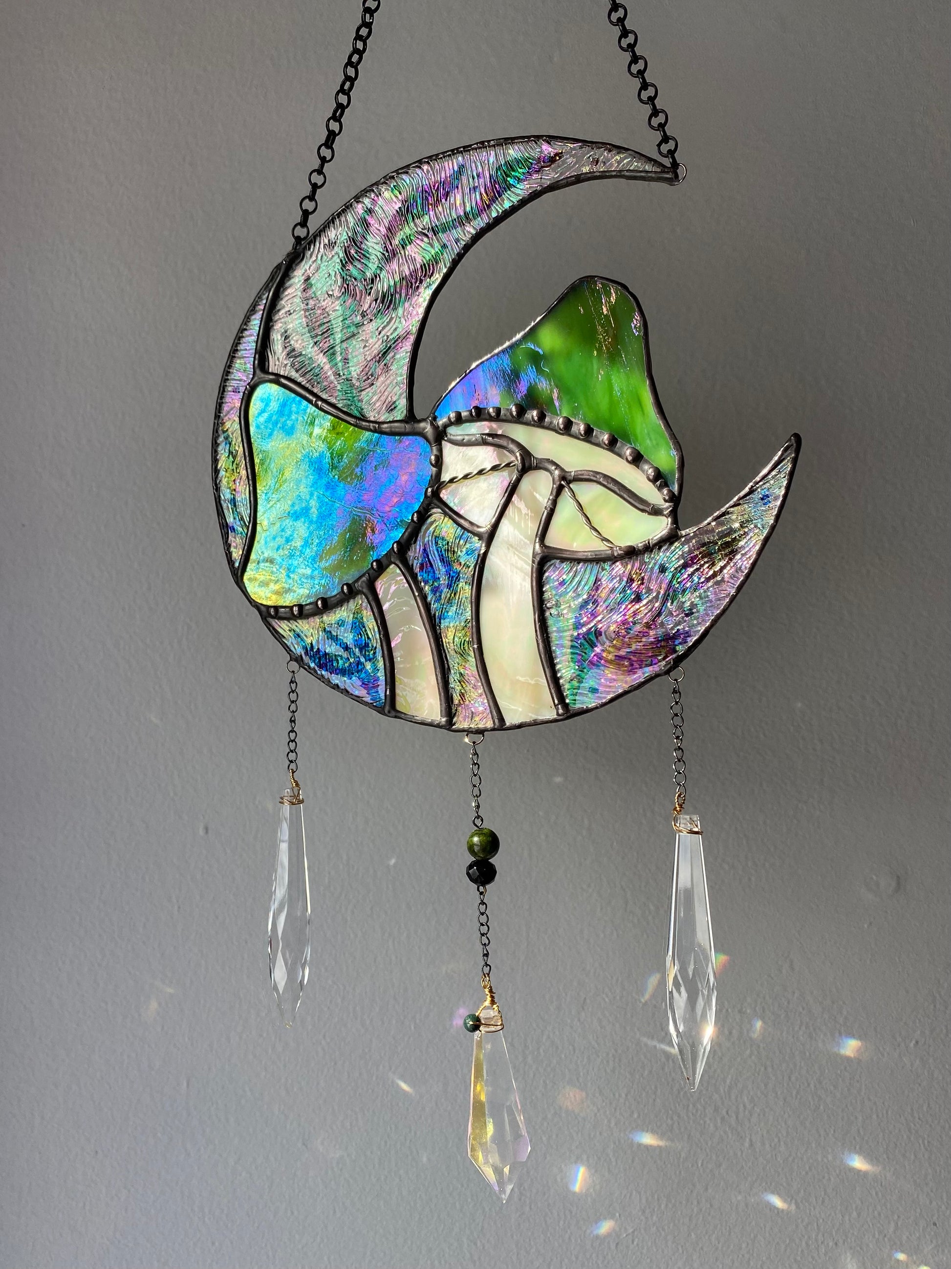 One of one. Fully iridescent!!! Made with beautiful green iridescent swirl glass and a bunch of clear iridescent texture. Has multiple suncatcher beads that will fill the room with rainbows :)