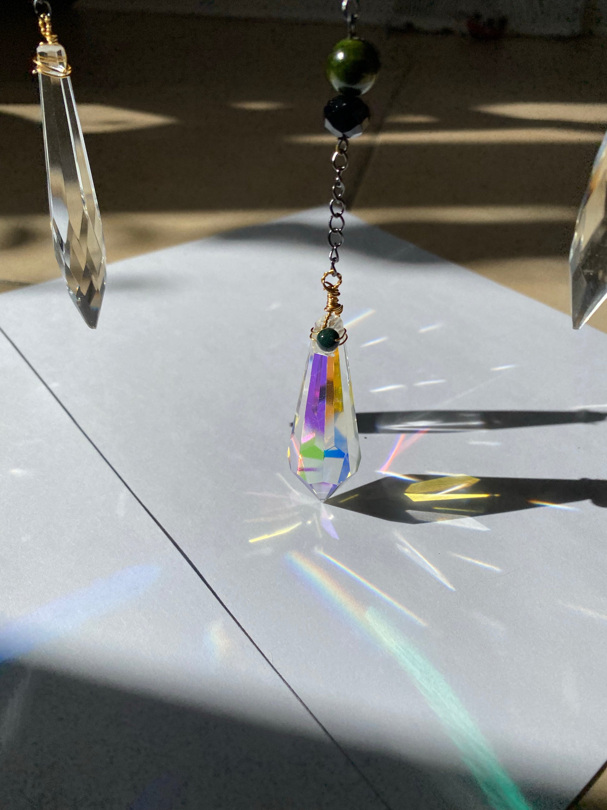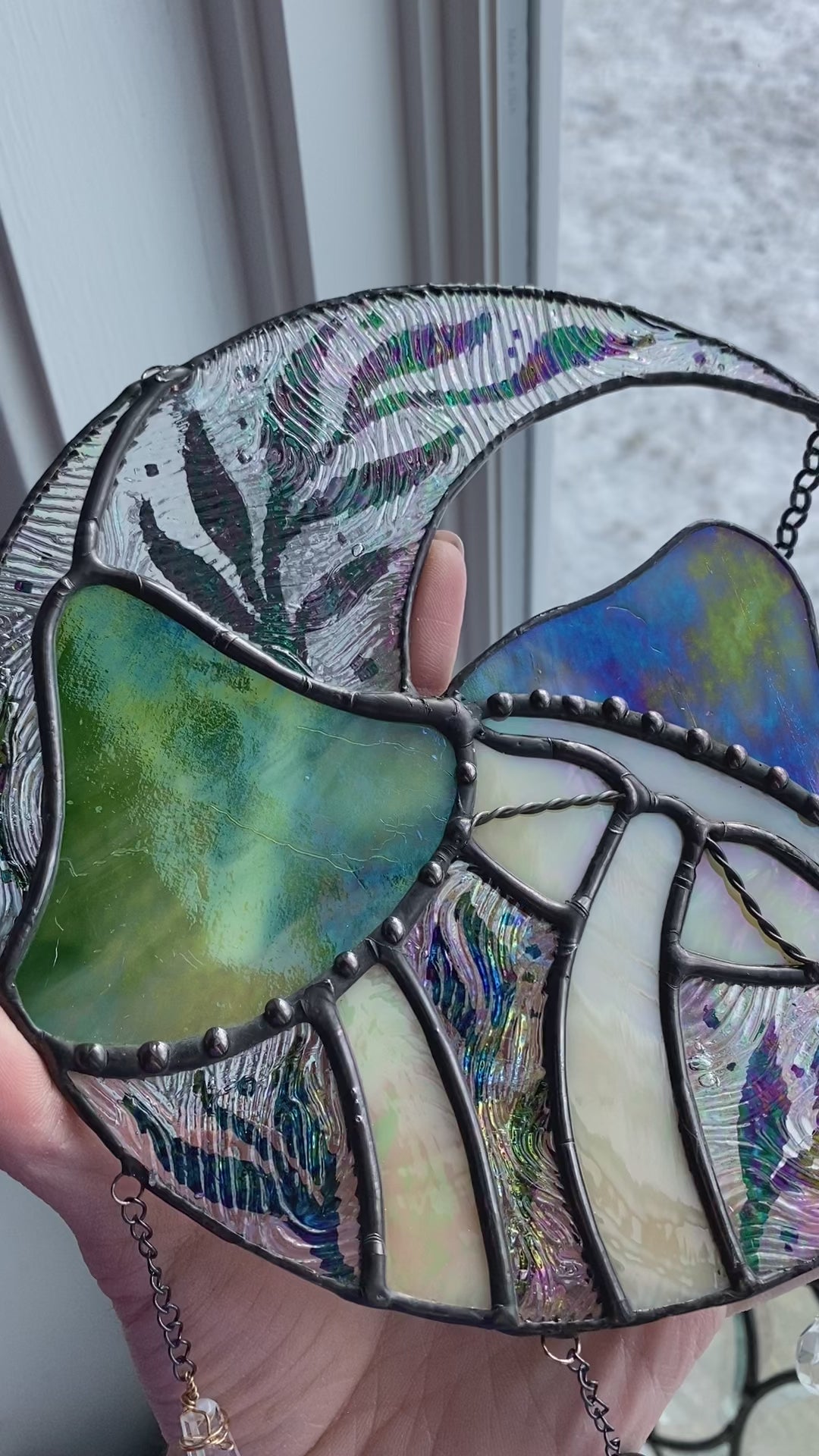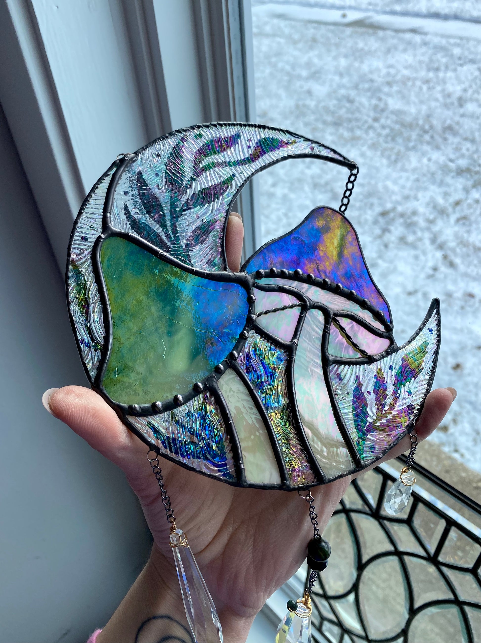 One of one. Fully iridescent!!! Made with beautiful green iridescent swirl glass and a bunch of clear iridescent texture. Has multiple suncatcher beads that will fill the room with rainbows :)