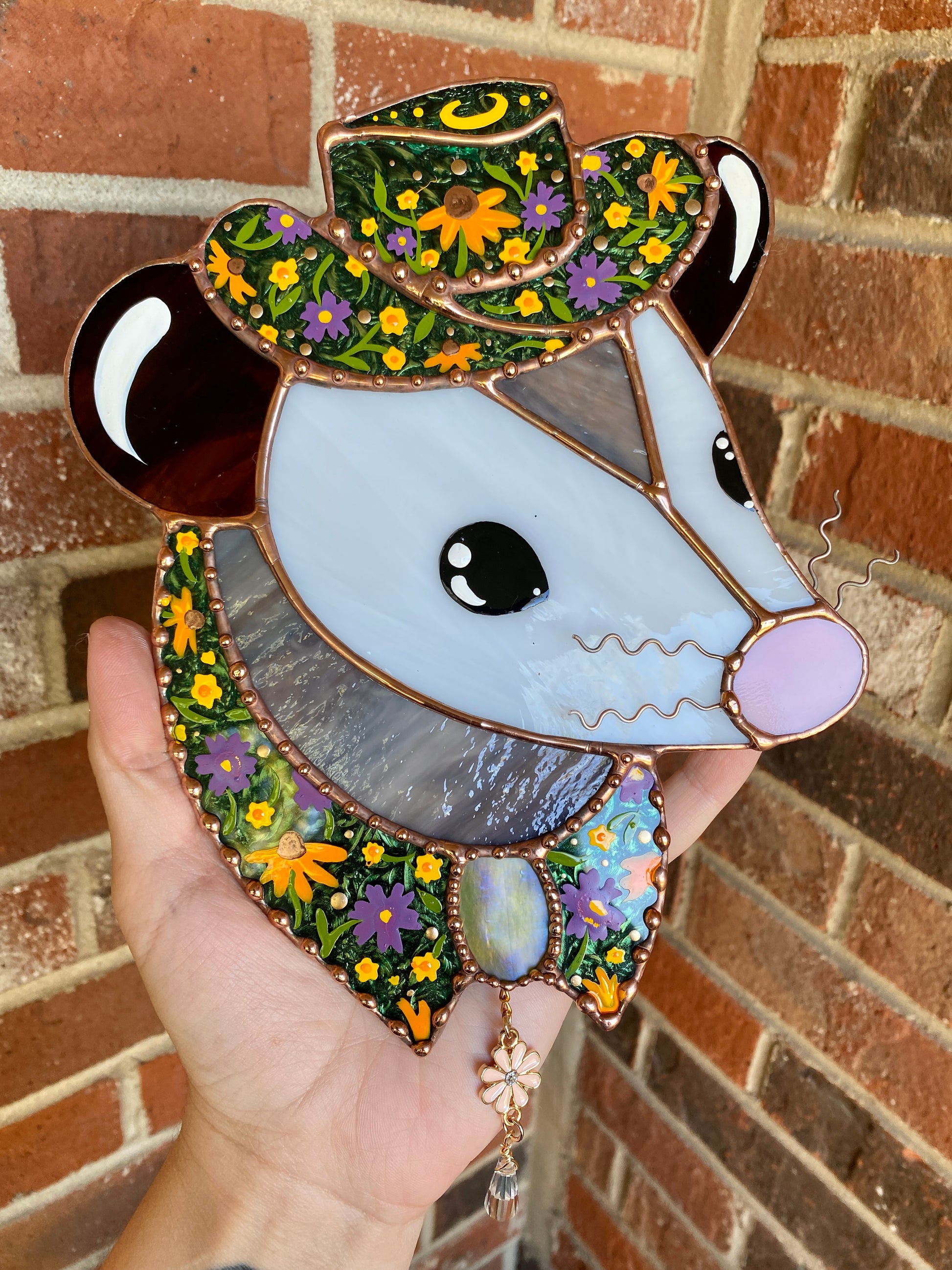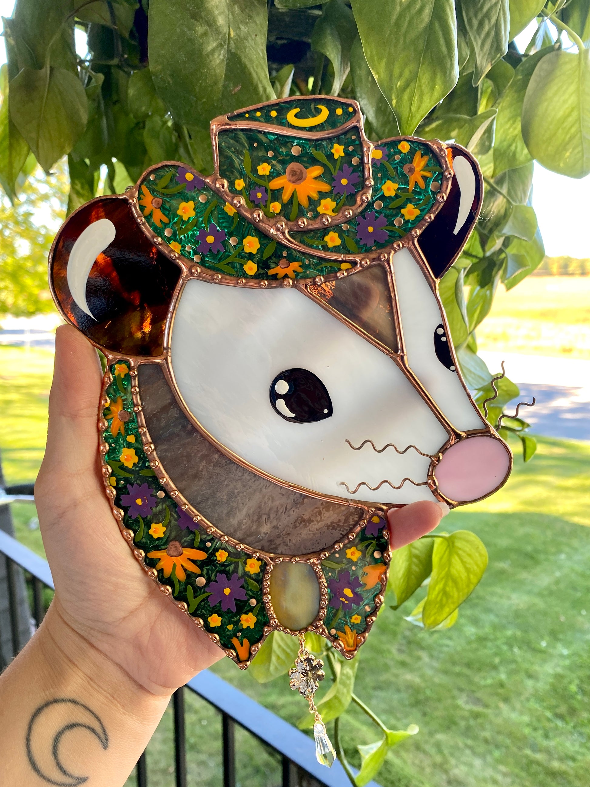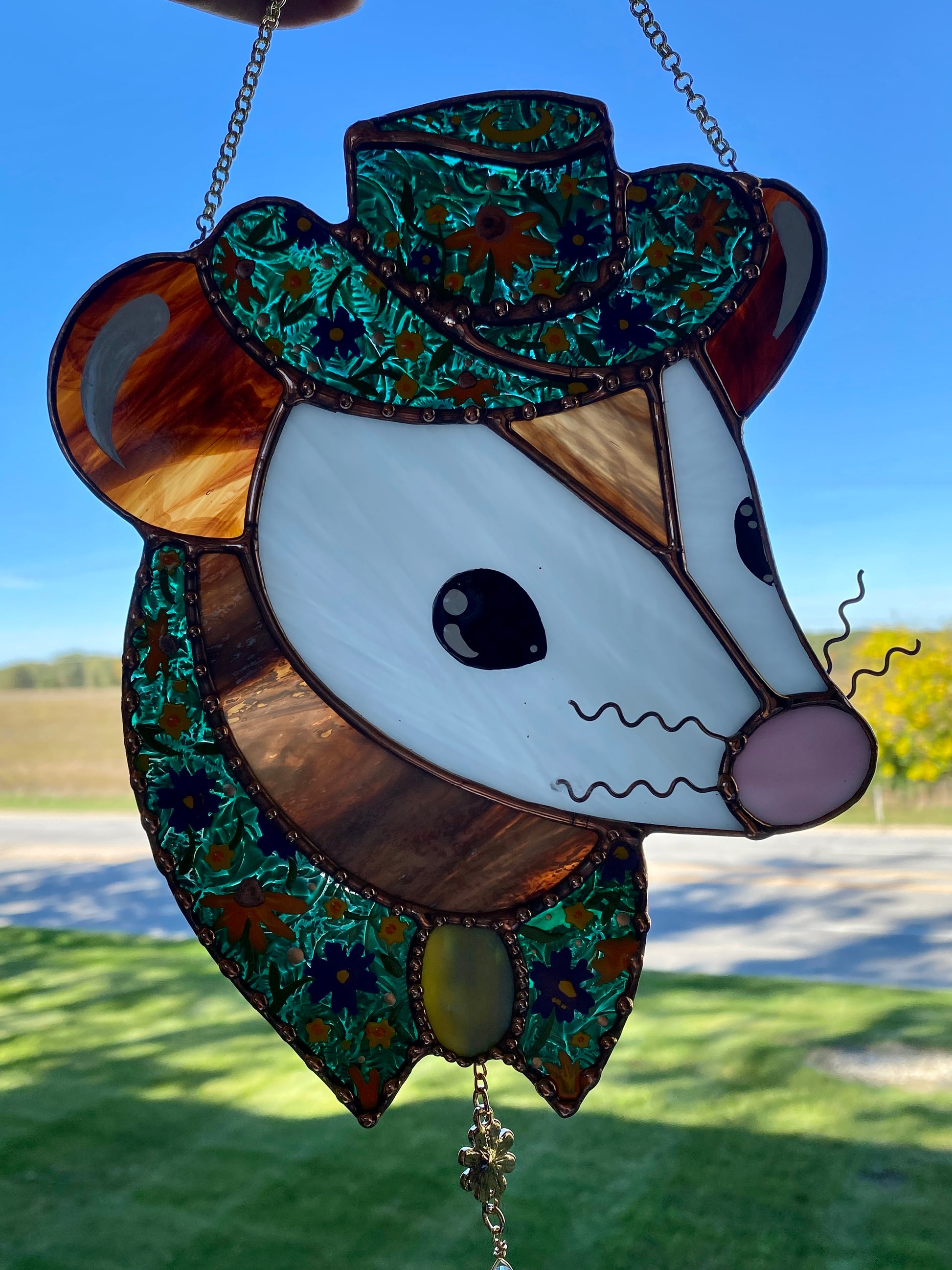Garden Cowboy Opossum Stained Glass Suncatcher