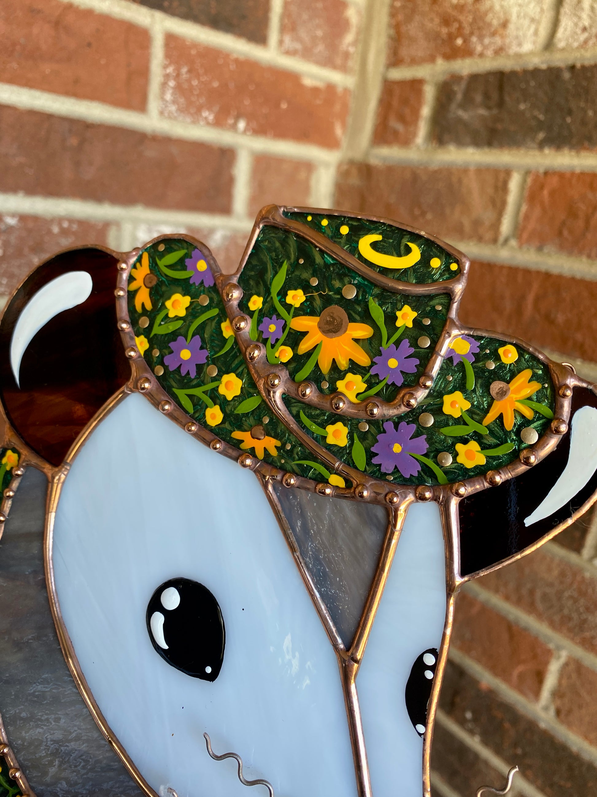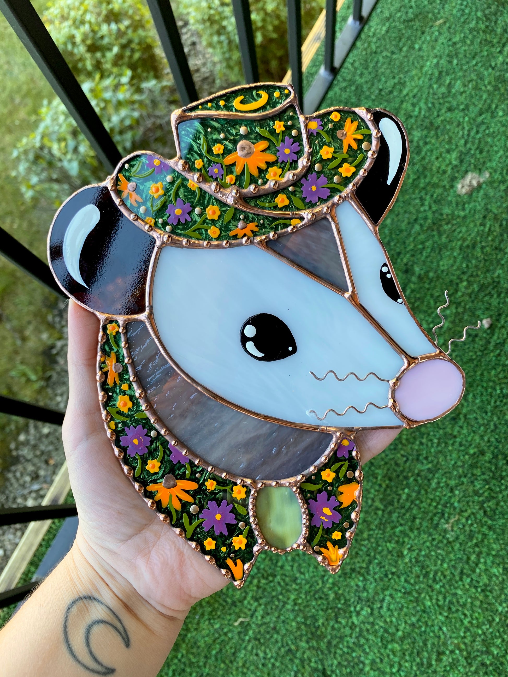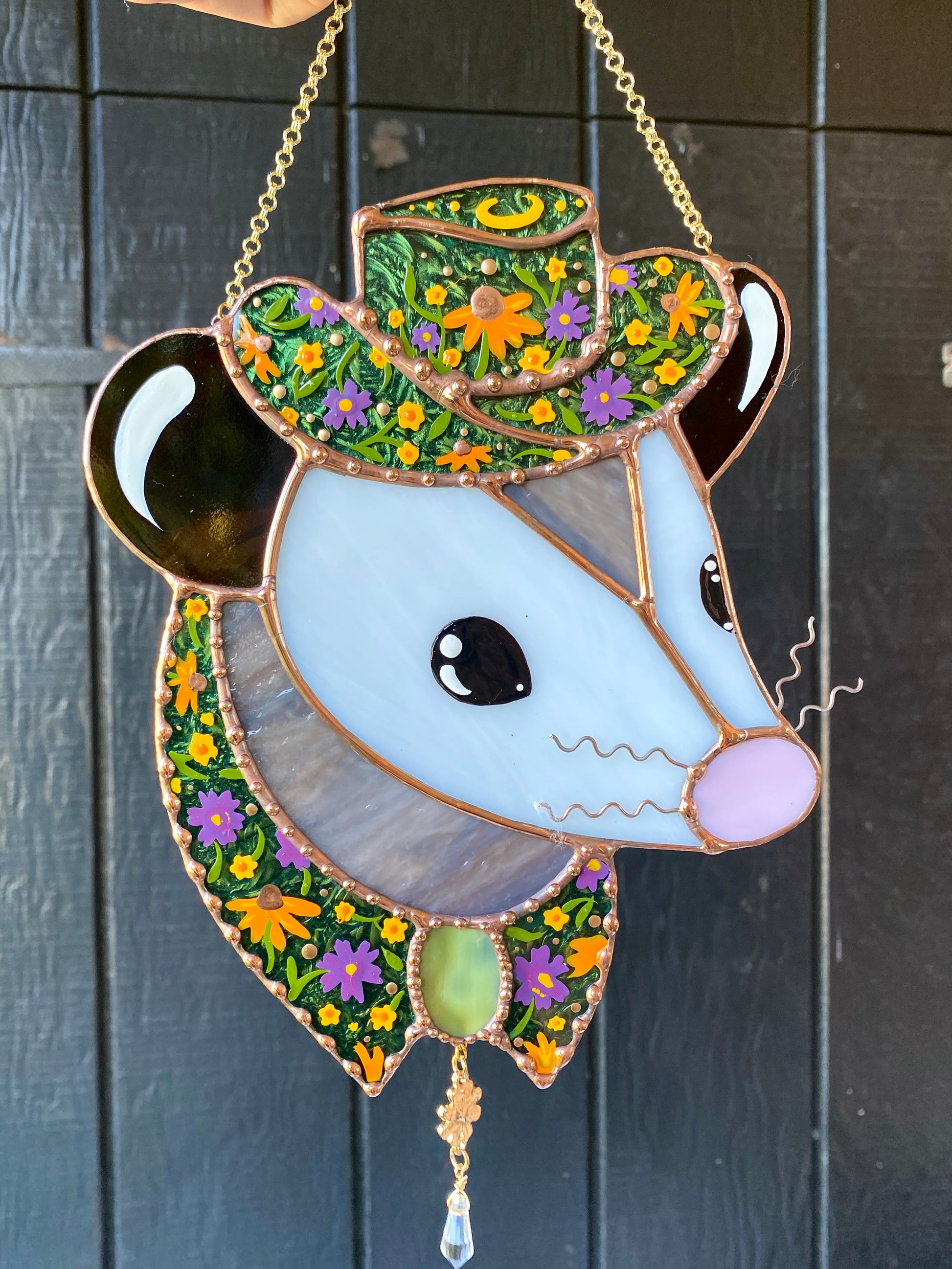 Garden Cowboy Opossum Stained Glass Suncatcher