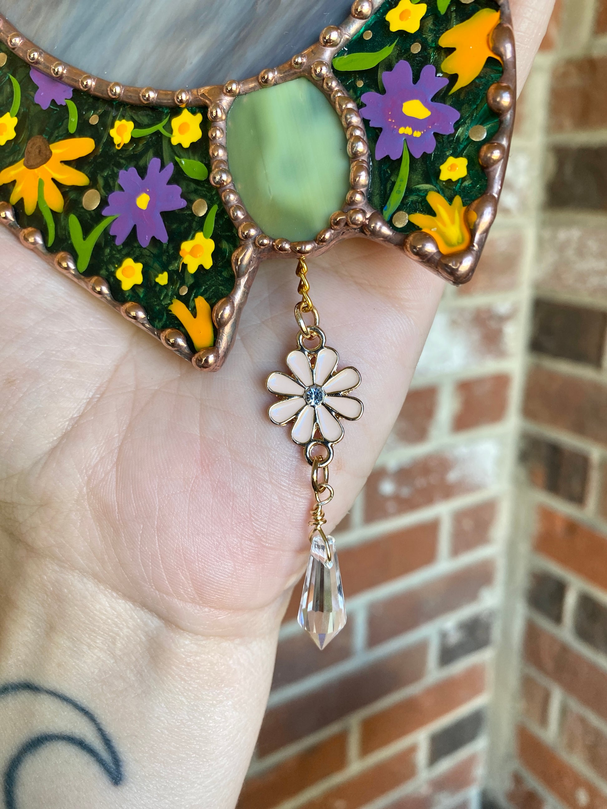 Measures about 8.5” tall and 6” wide. Suncatcher beads on his collar reflect sunlight into rainbows! Has a gold chain and screw-in hook to hang him up wherever you please! Hand painted enamel flowers on green Van Gogh glass.