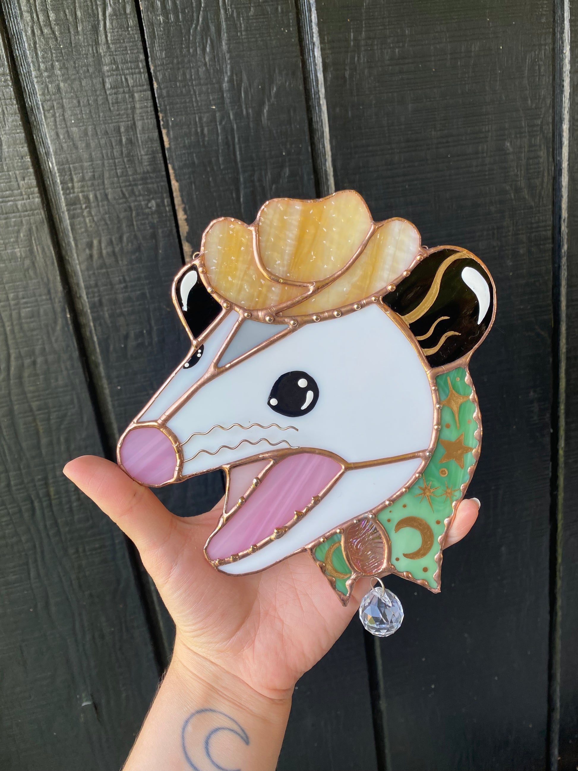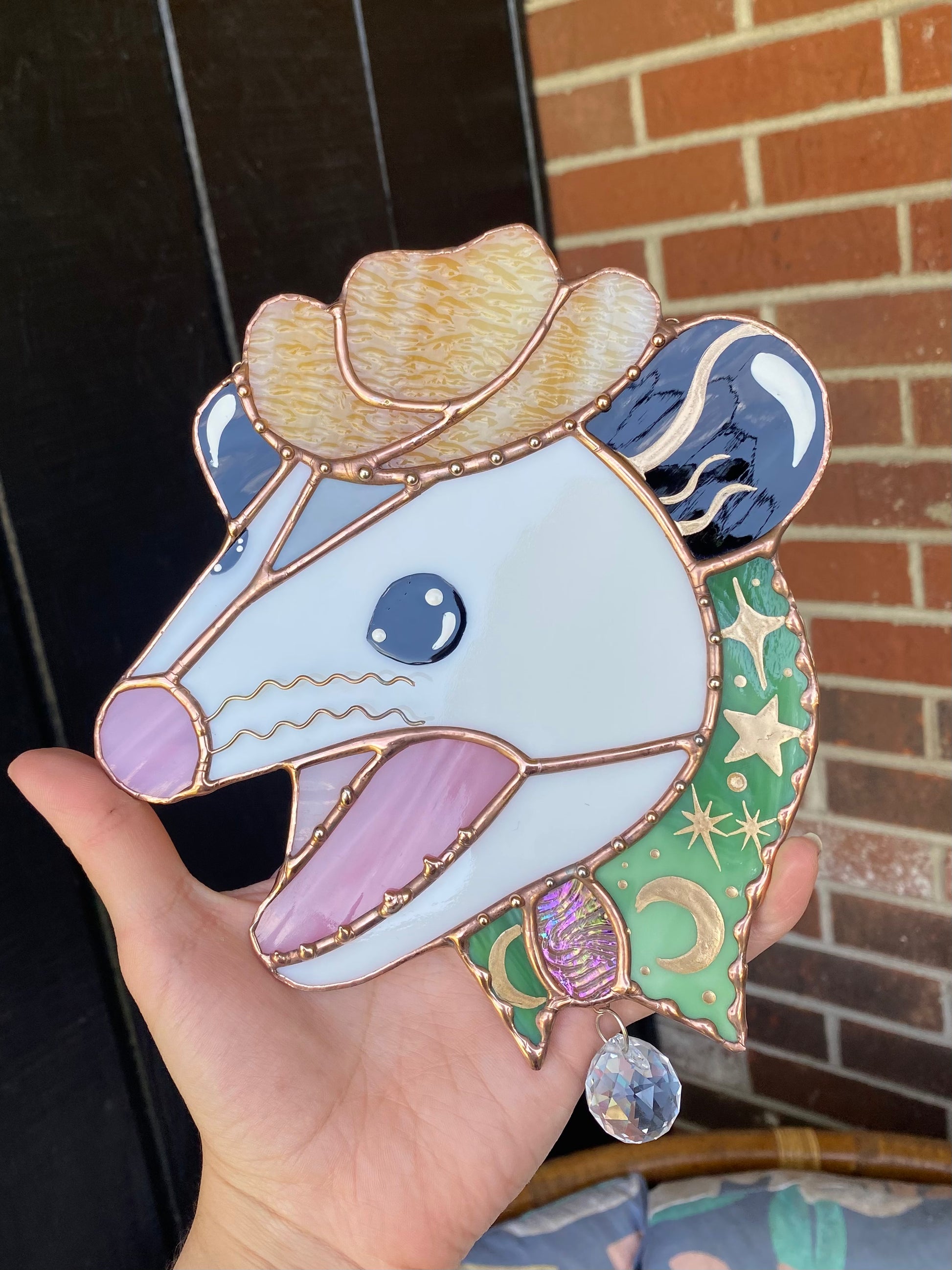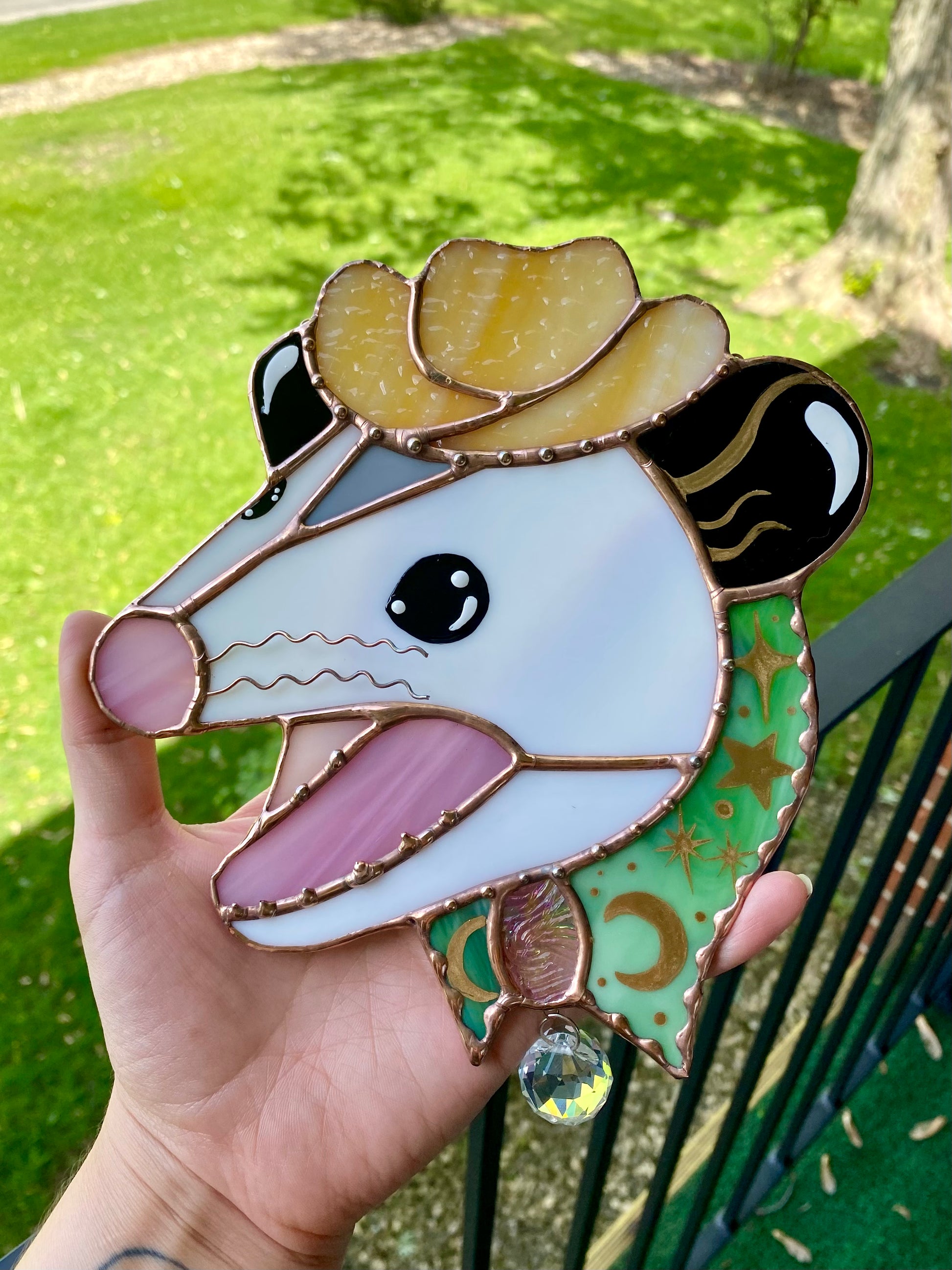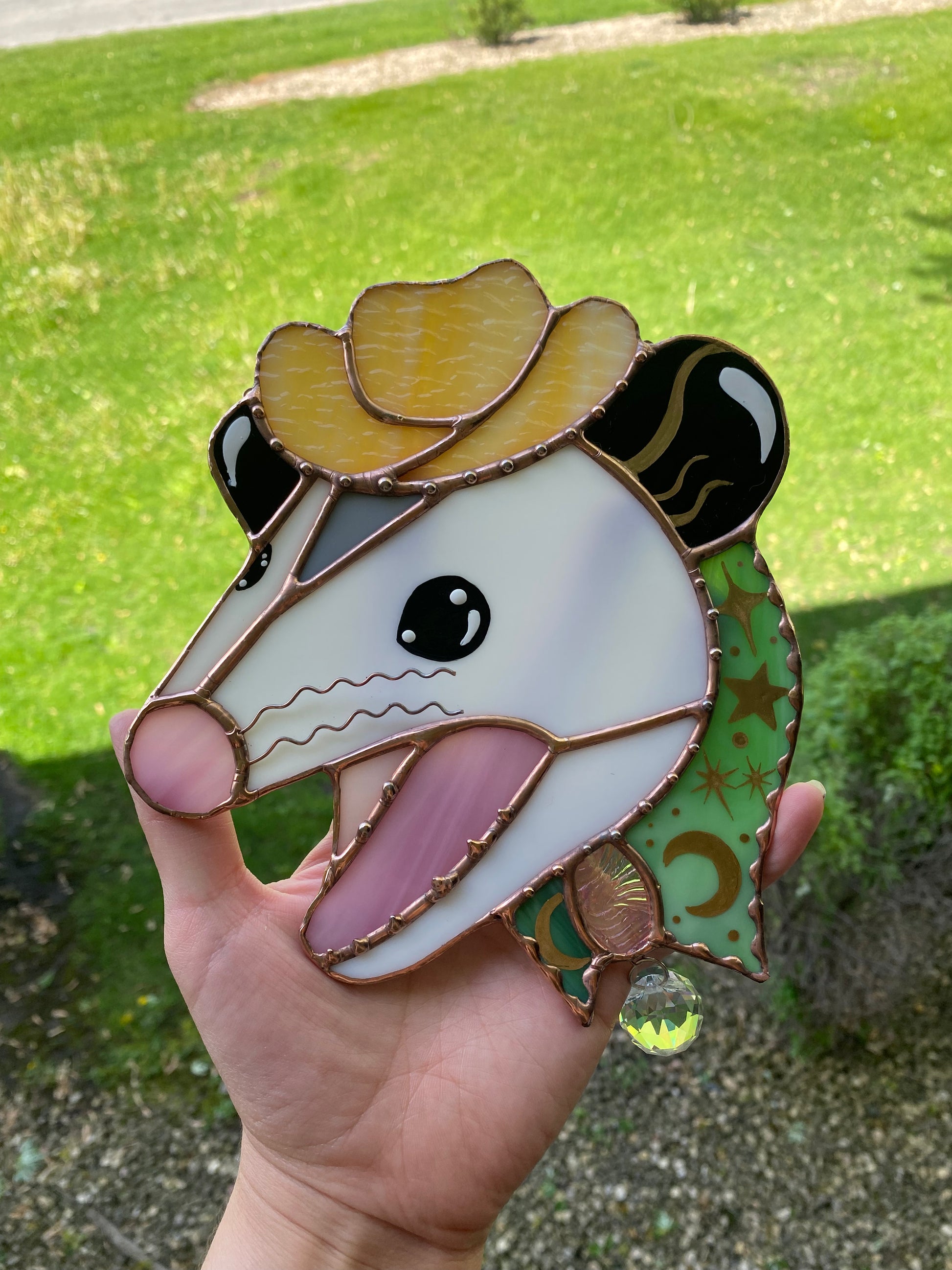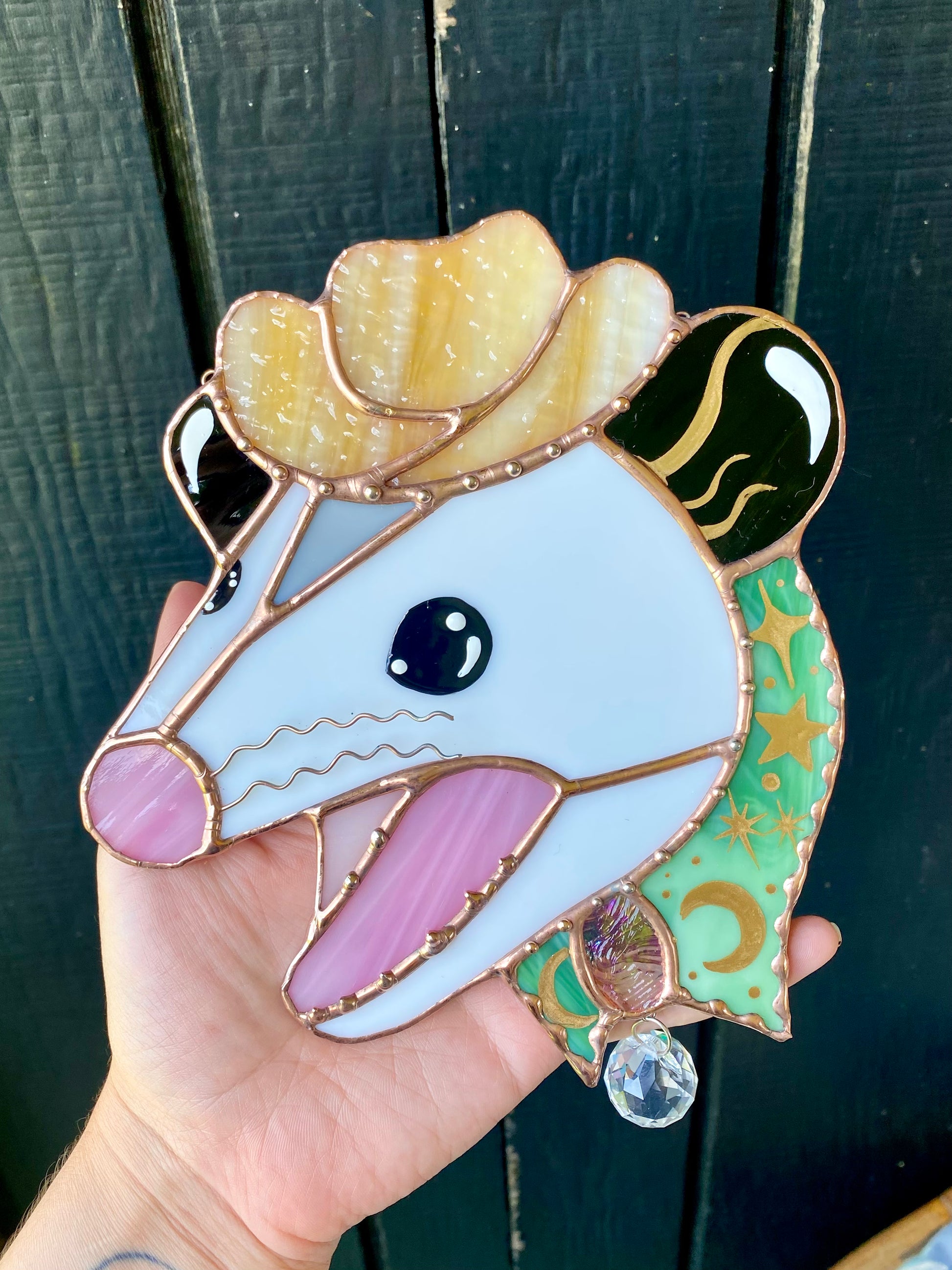 Green Celestial Screamy Cowboy Opossum Stained Glass Suncatcher