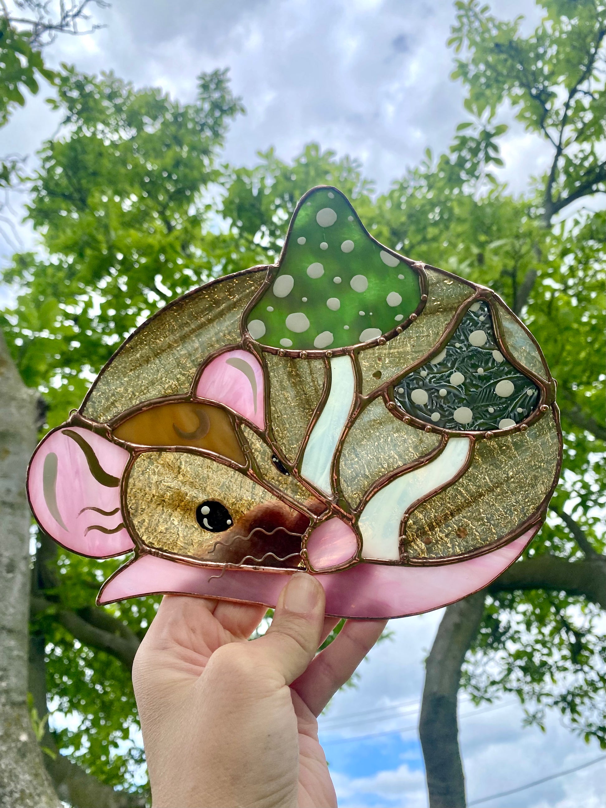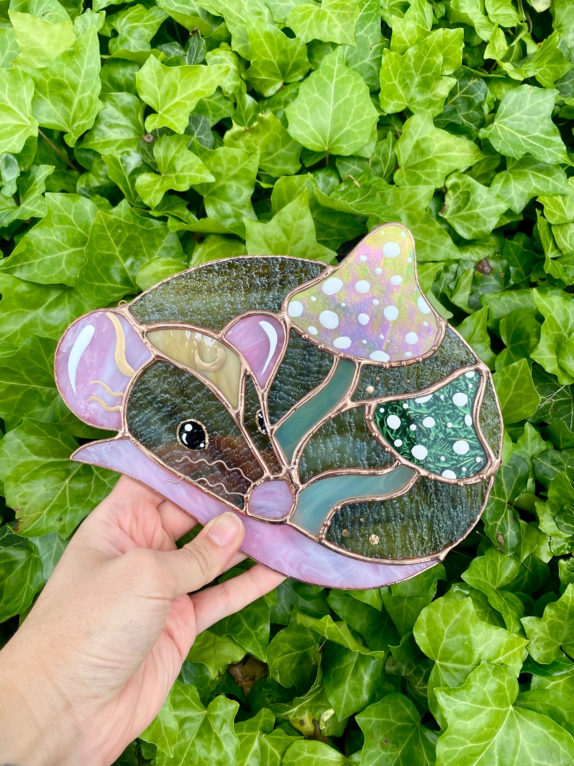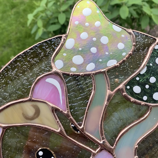 Green Forest Mushroom Rat Stained Glass Suncatcher