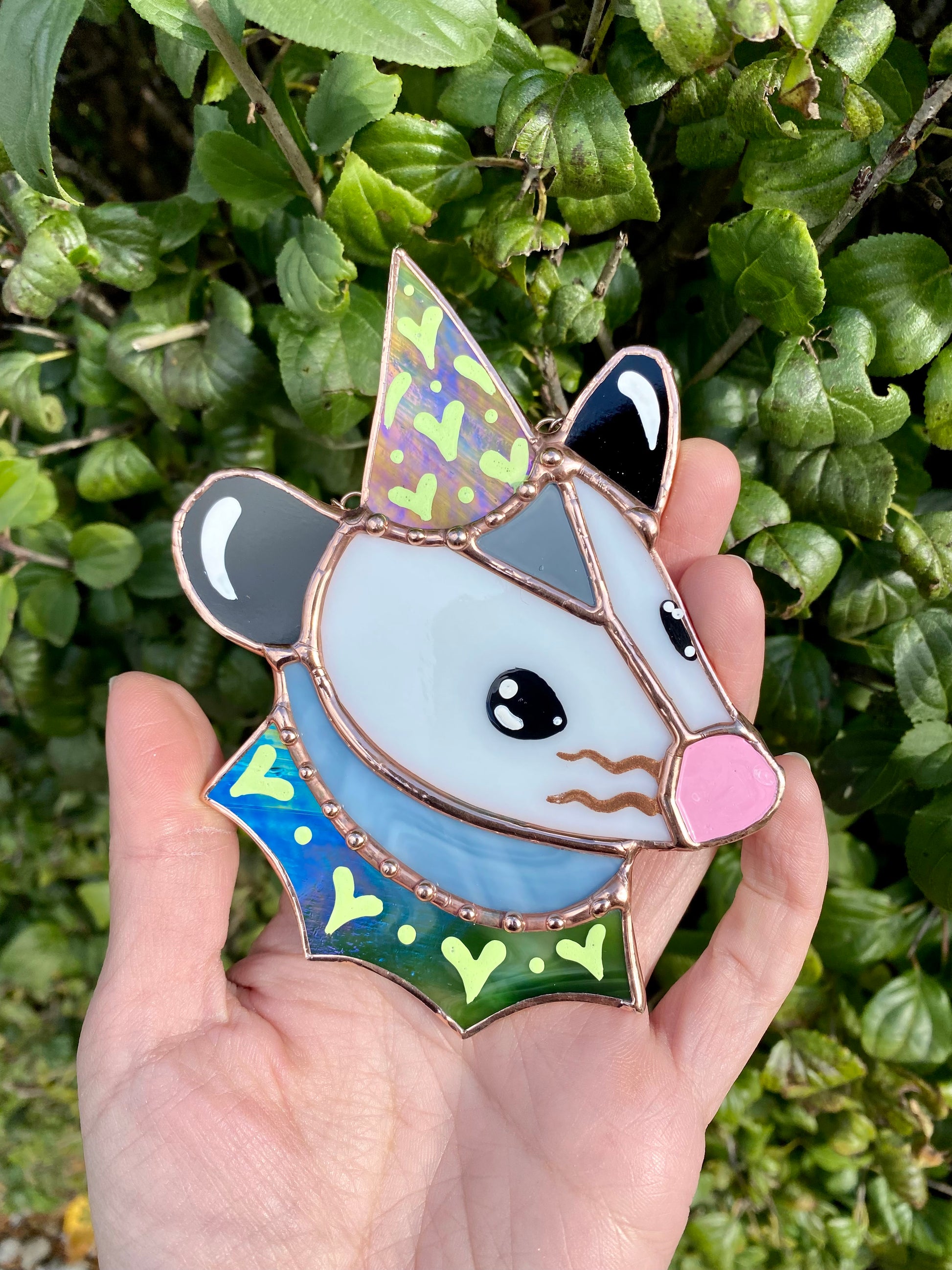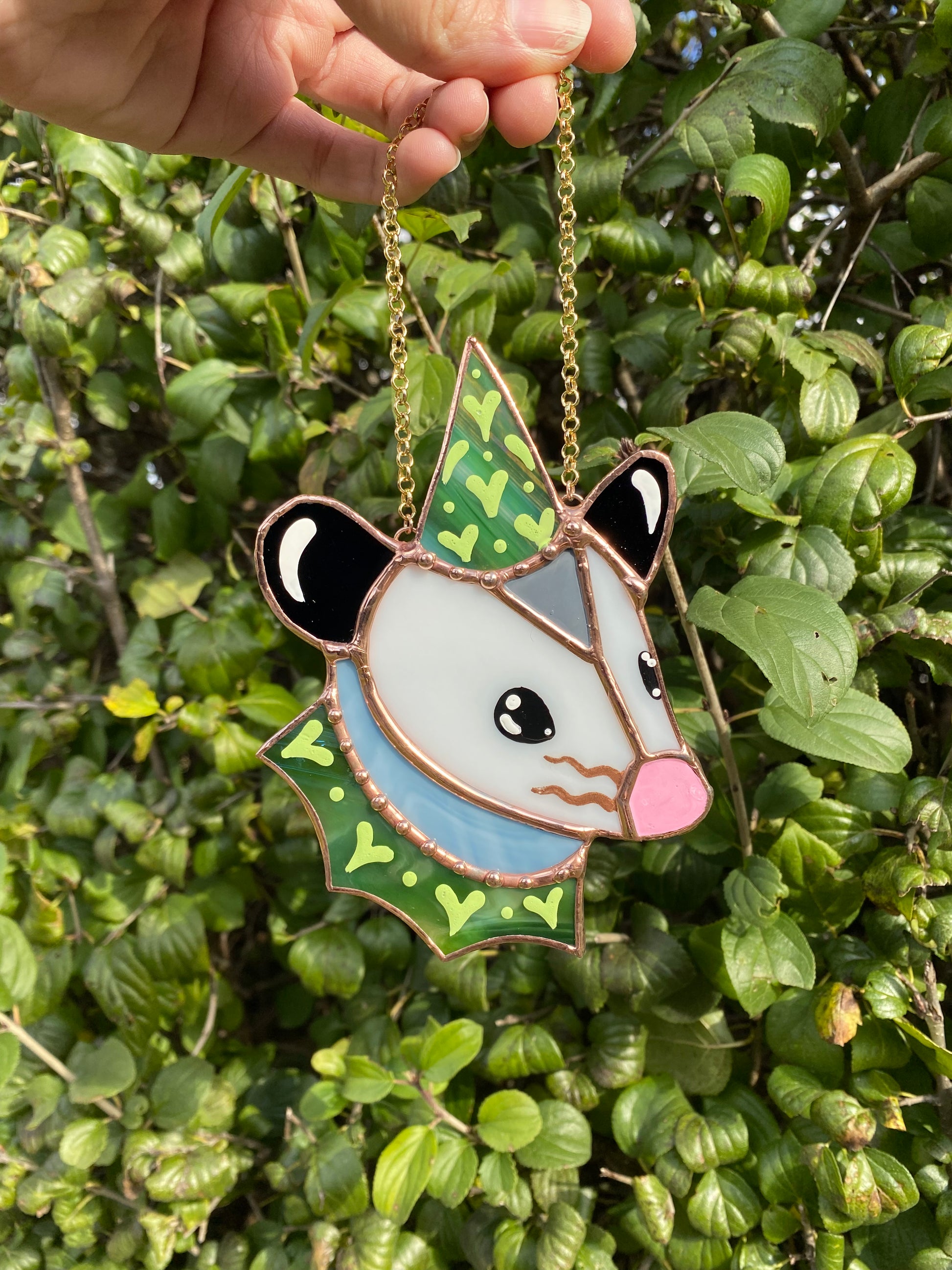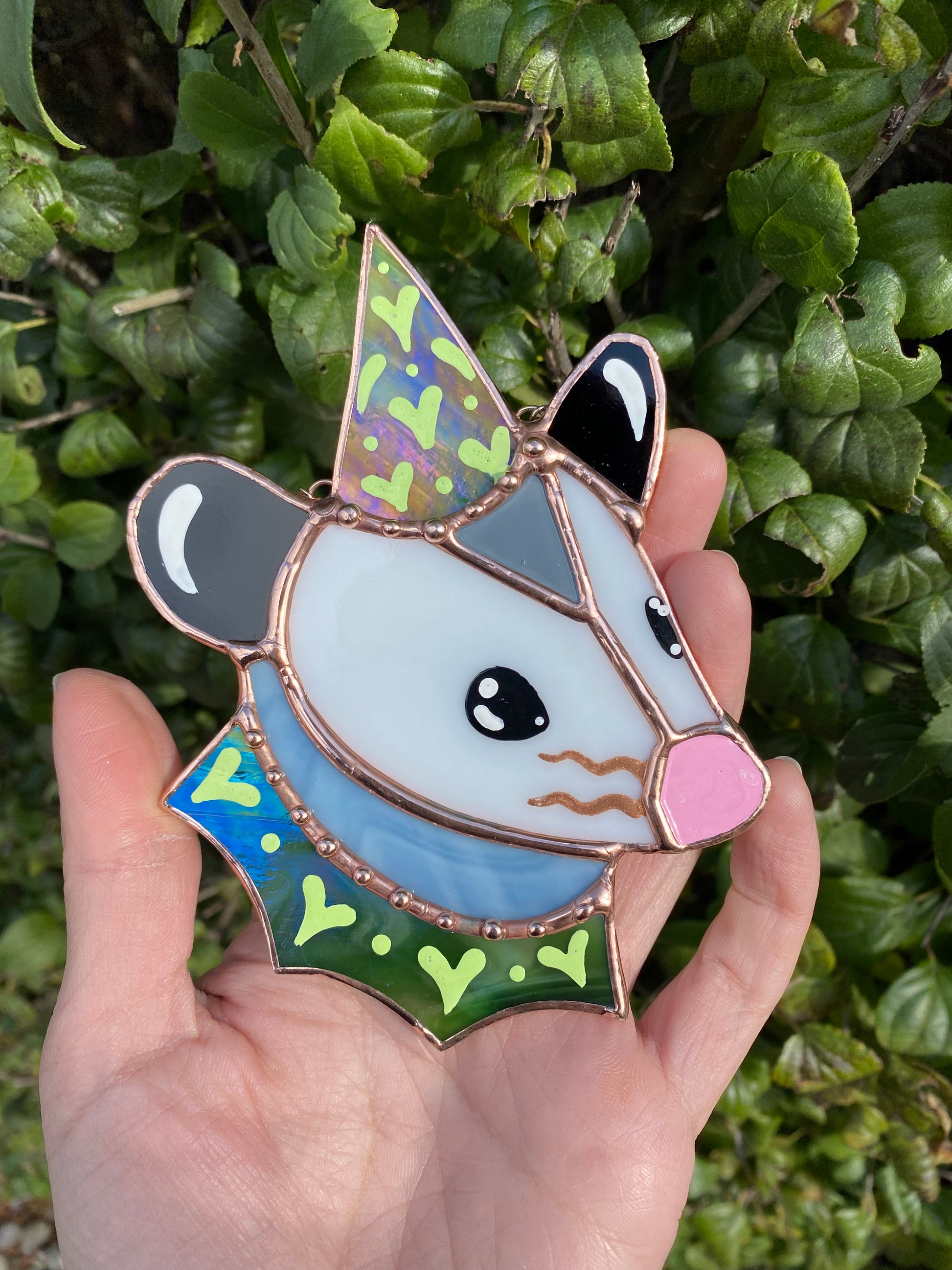 Green Iridescent Heart Opossum Stained Glass Ornament