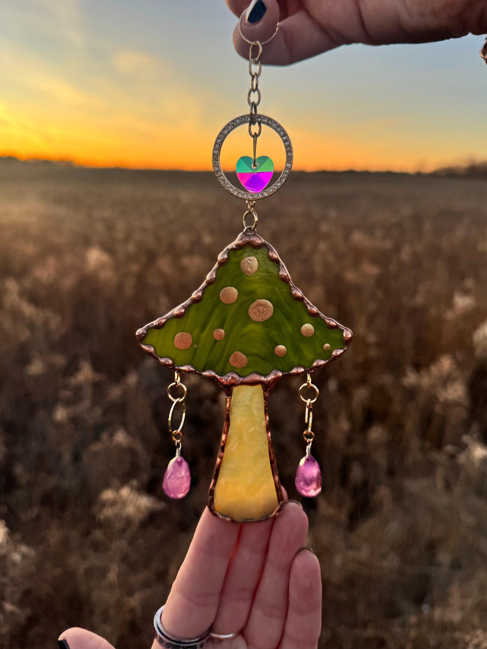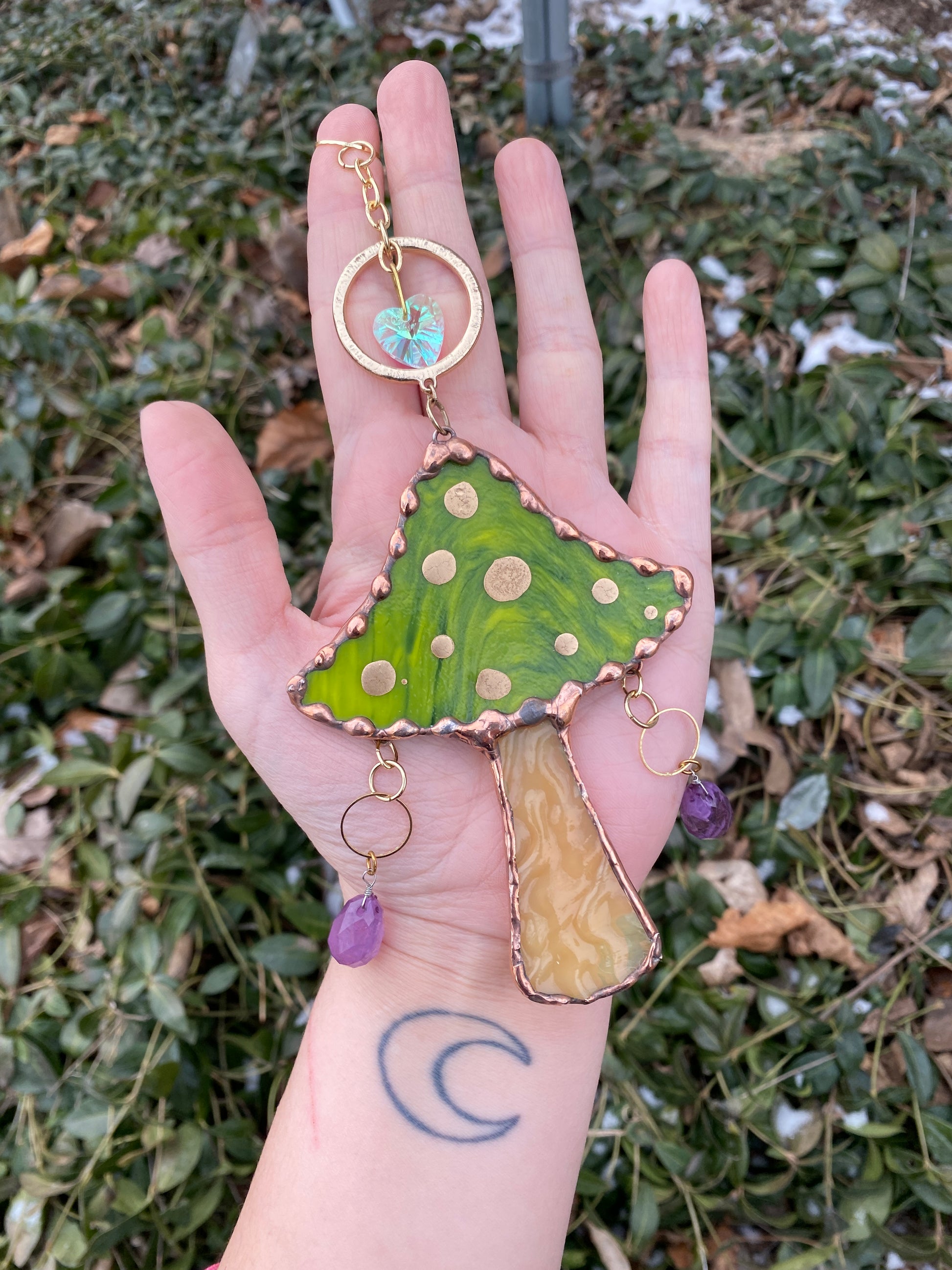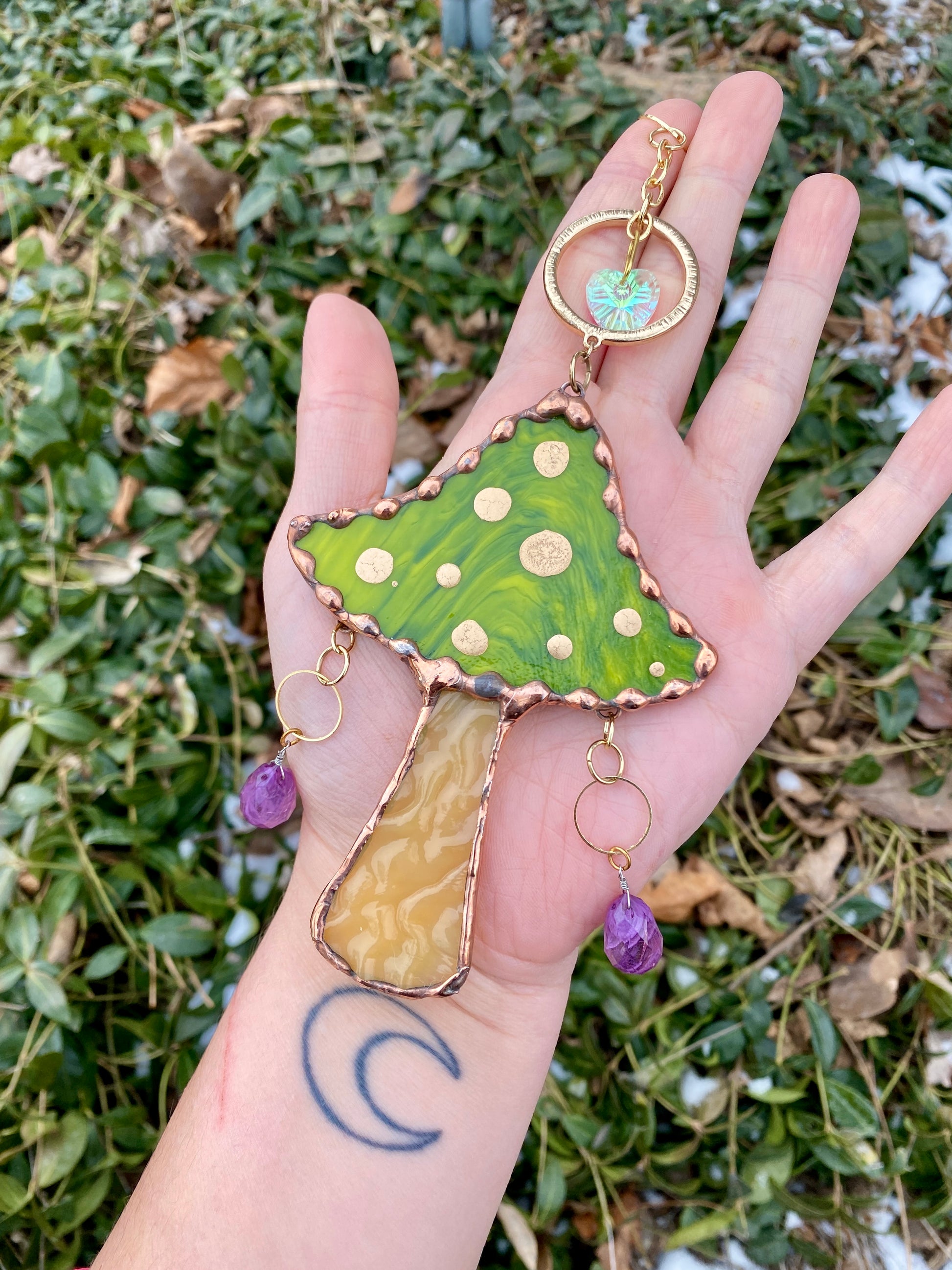 Green mushroom with purple beads, golden ornament and suncatcher beads.