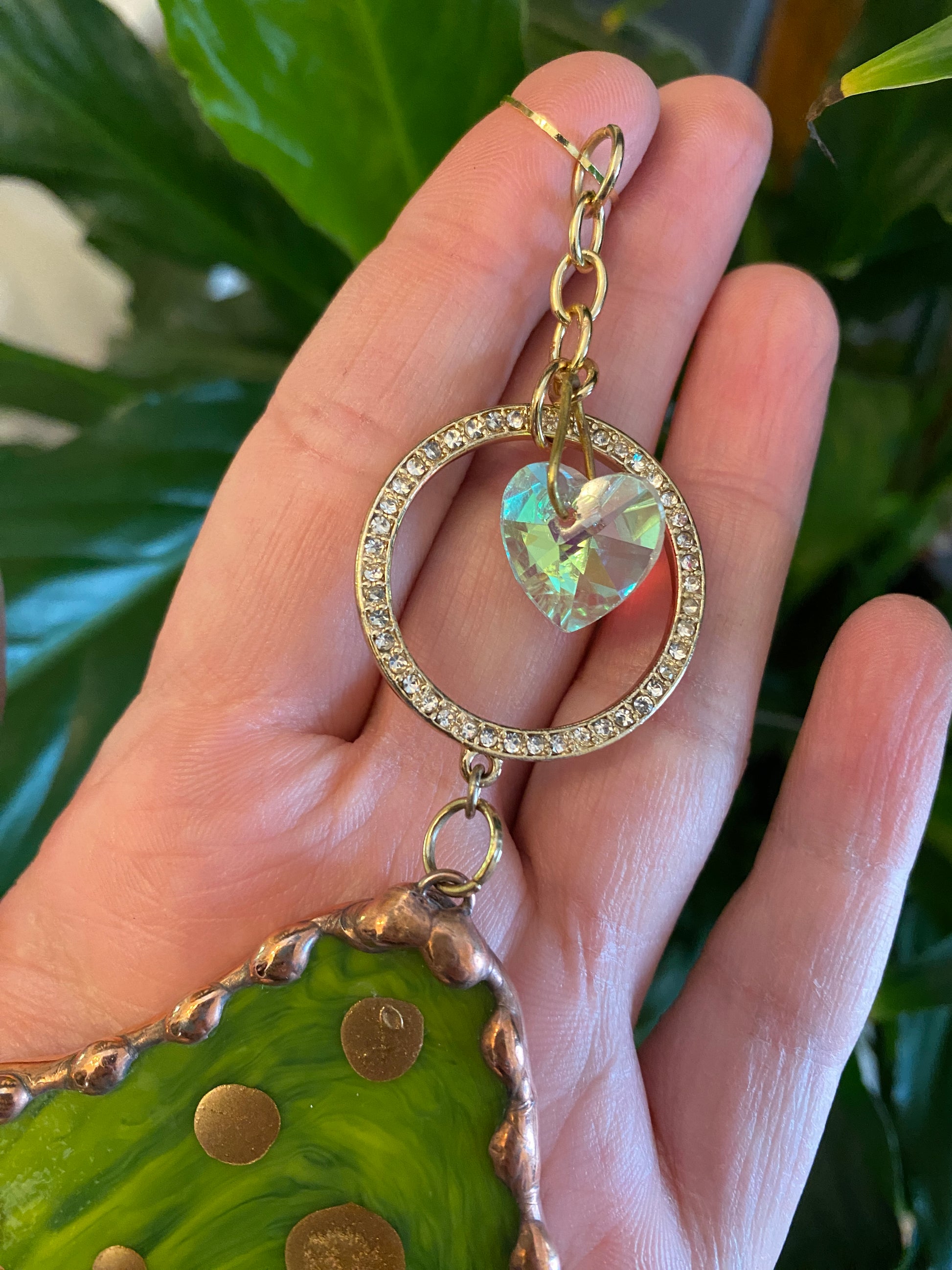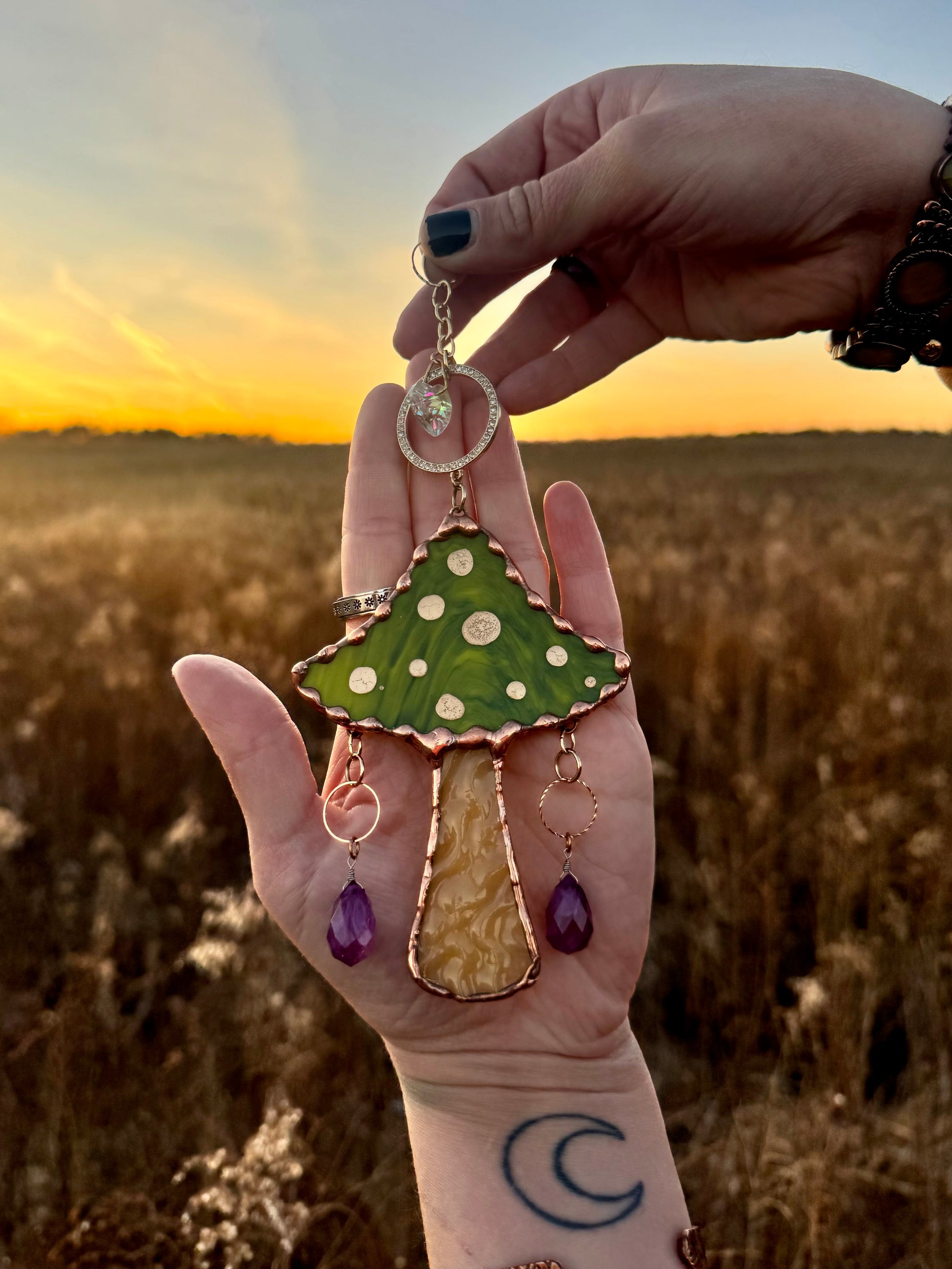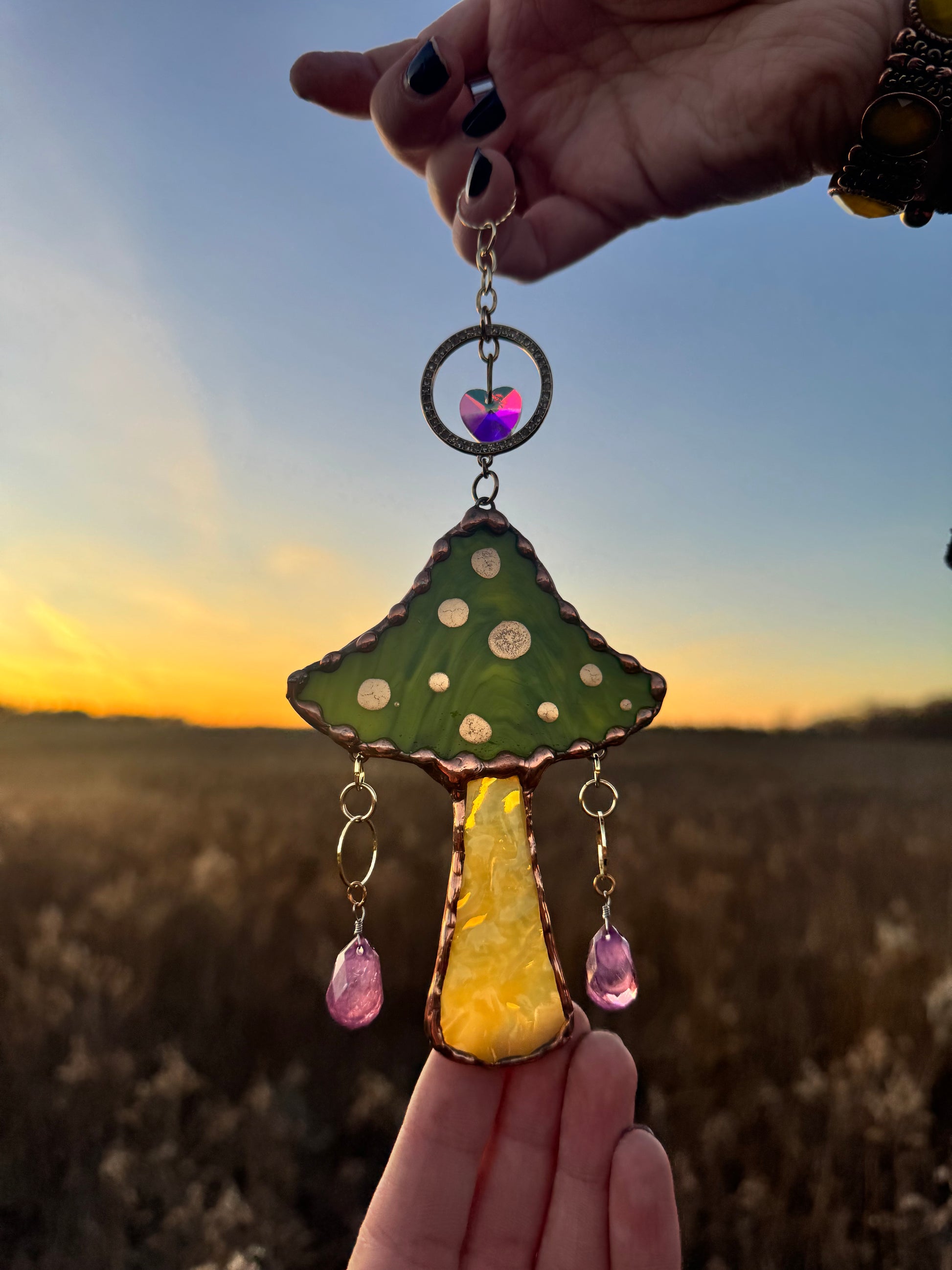 Green mushroom with purple beads, golden ornament and suncatcher beads.