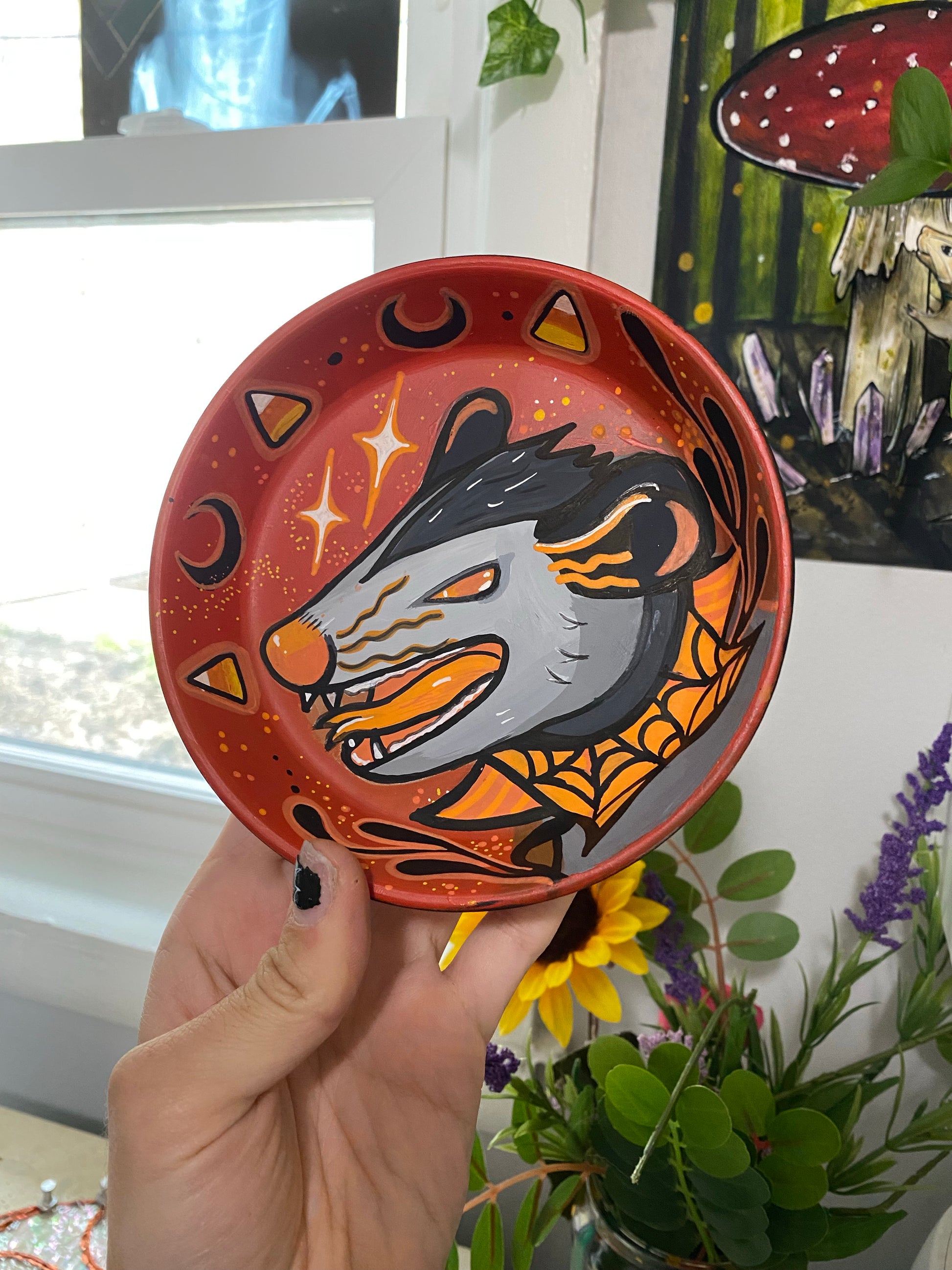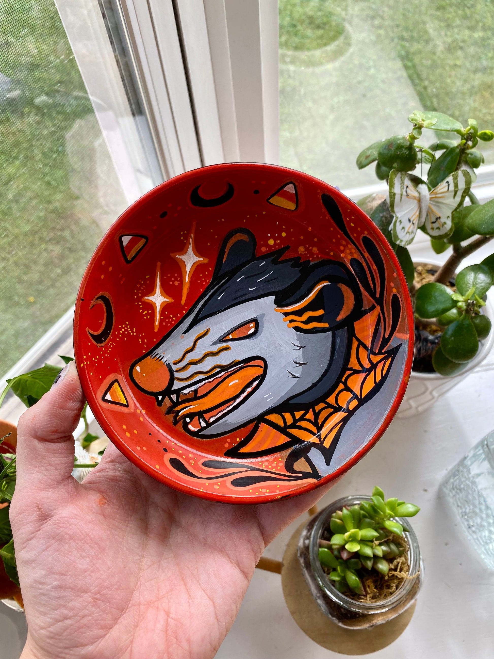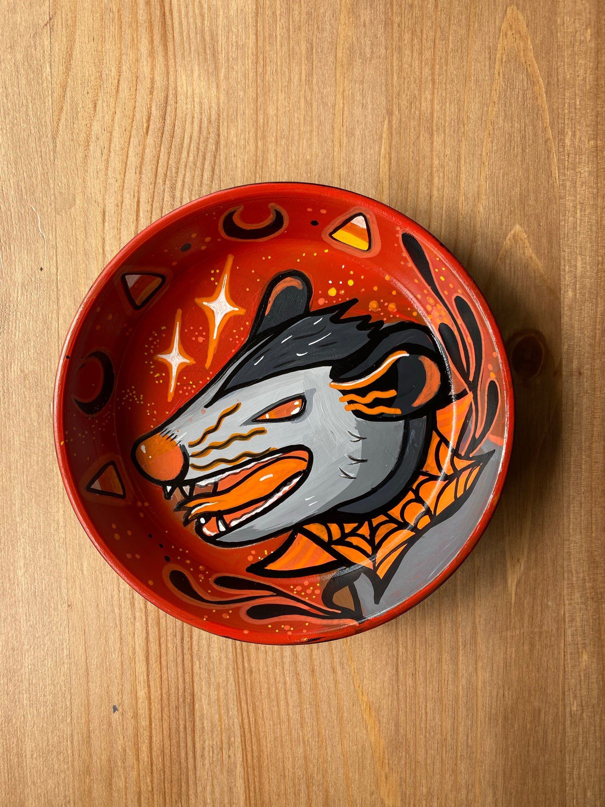 Acrylic on terracotta dish. Varnished and sealed. Clean gently with soap and water only as needed. Measures 5.5” in diameter, 1” deep.