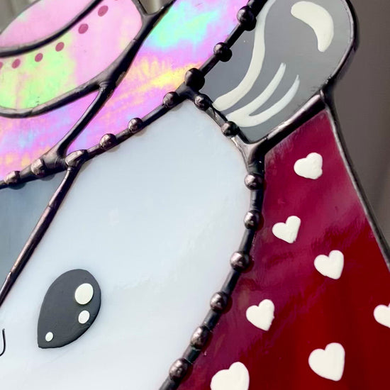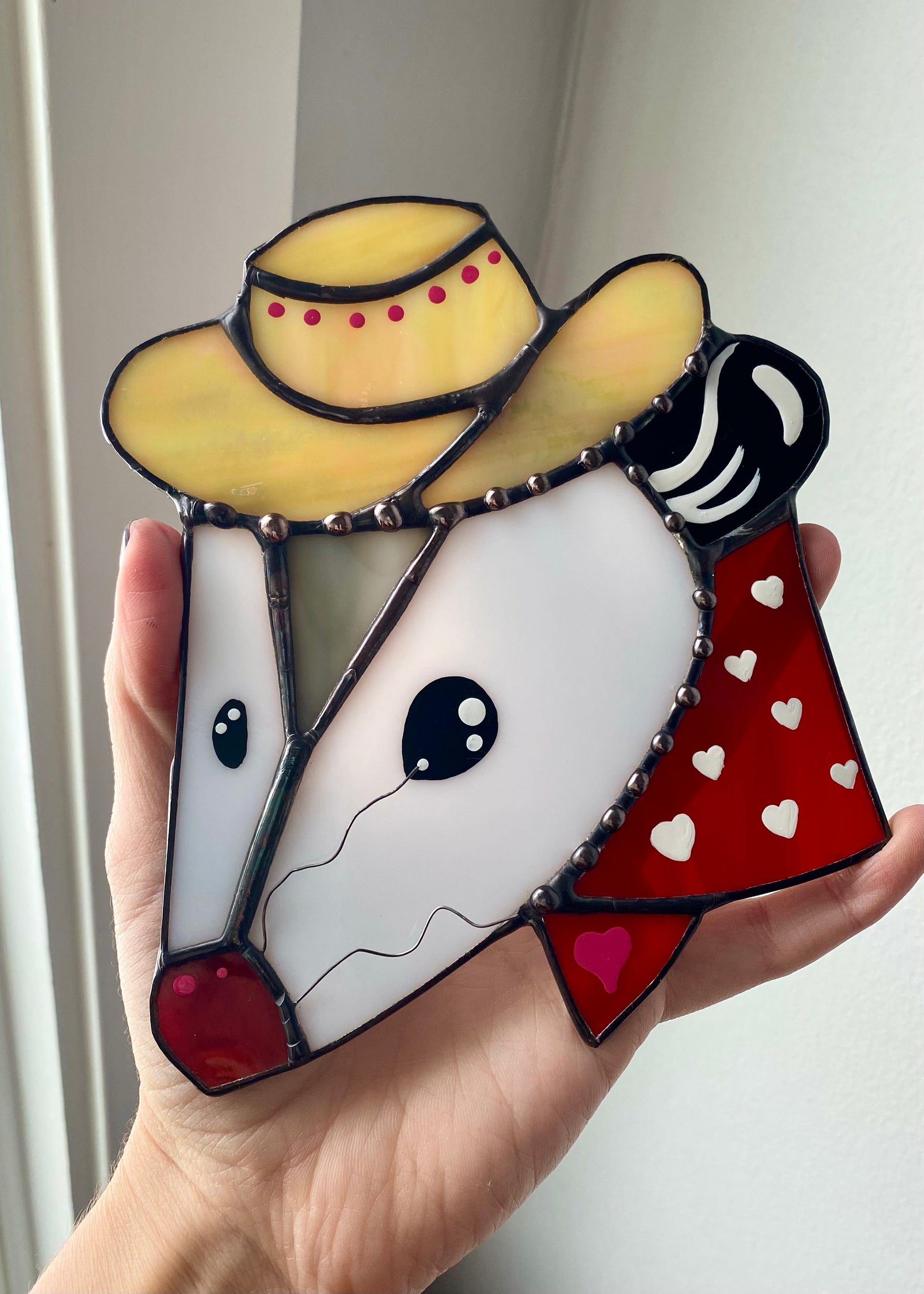 This stained glass piece is completely made by hand. The technique used for stained glass uses solder that contains lead. Although it is not harmful to handle and poses minimal risk- it is best to wash your hands after handling. Keep out of reach of children and pets.