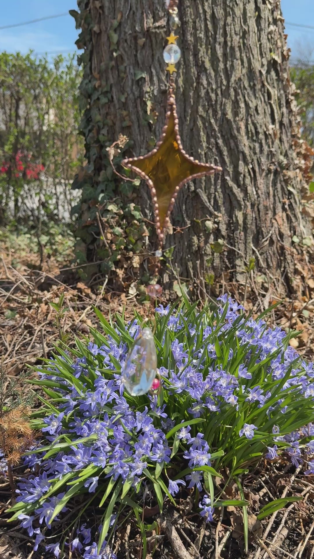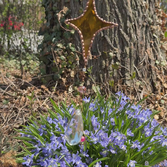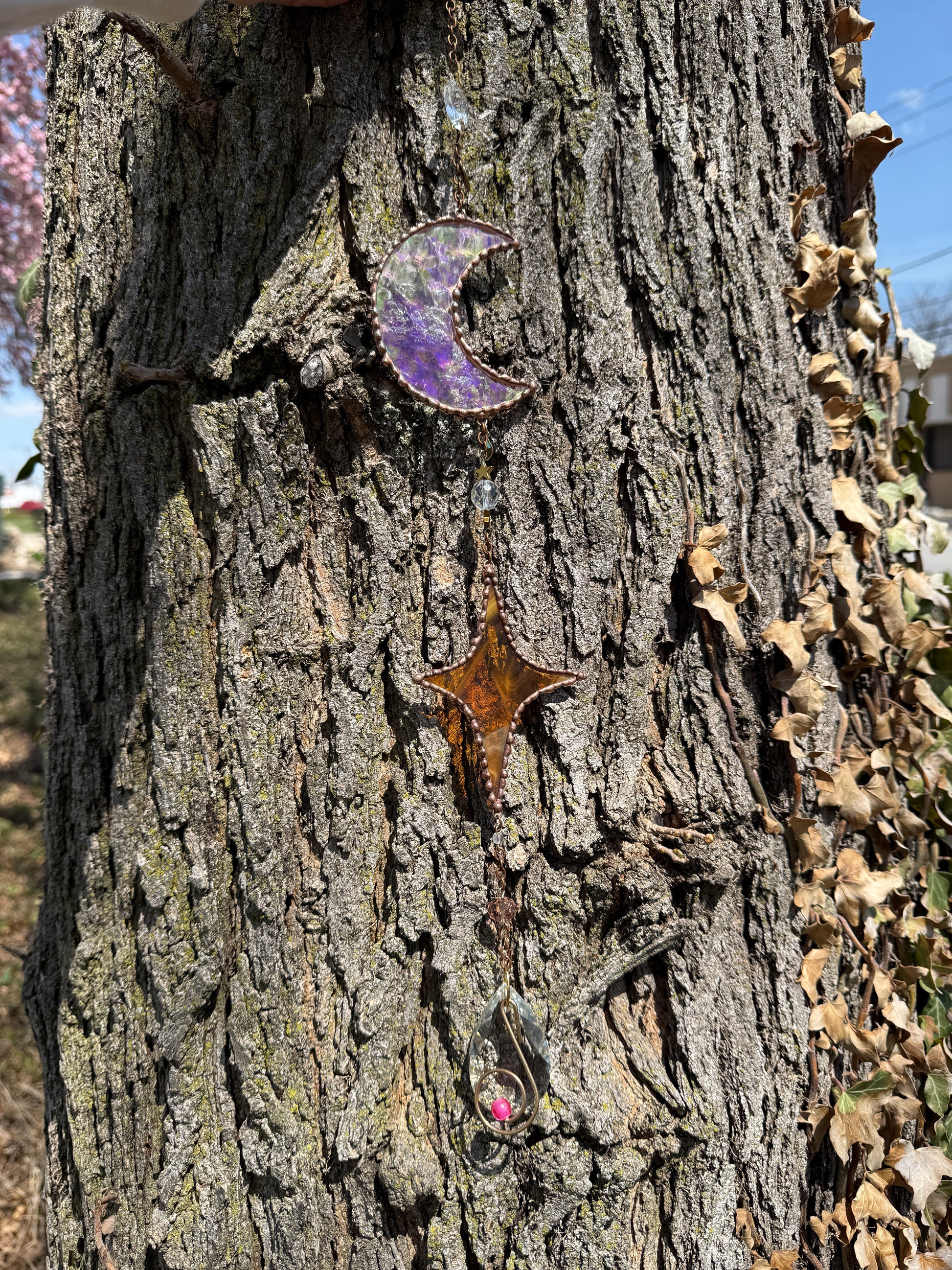 19” long. Moon is 3.5” tall, and star is 4” tall. Both with decorative soldering. Has a 2” chandelier crystal on the bottom.