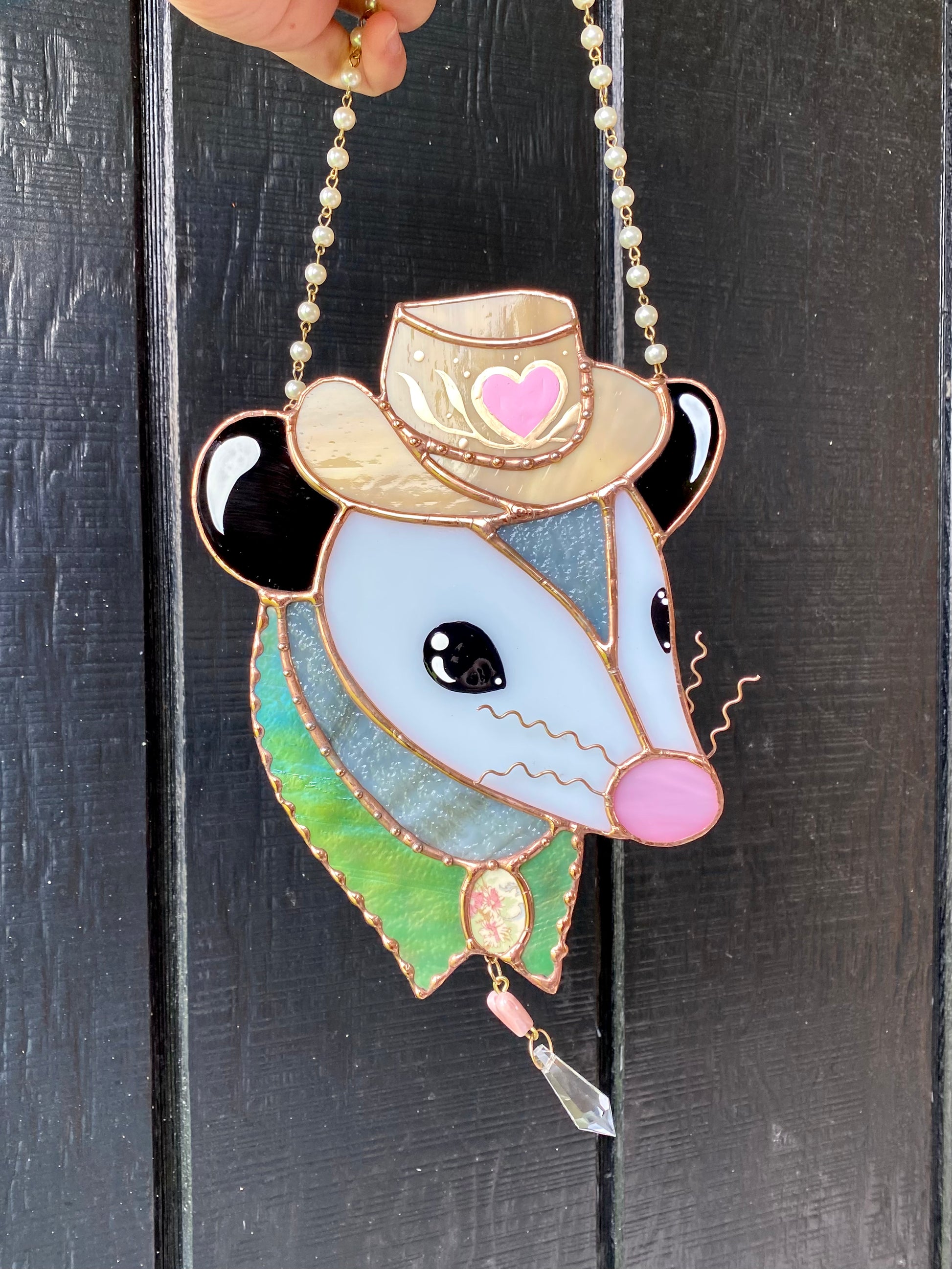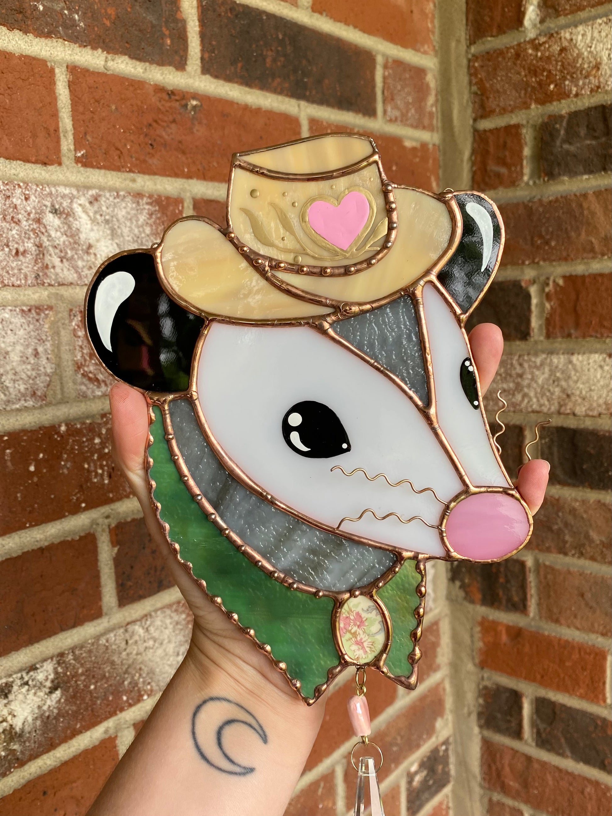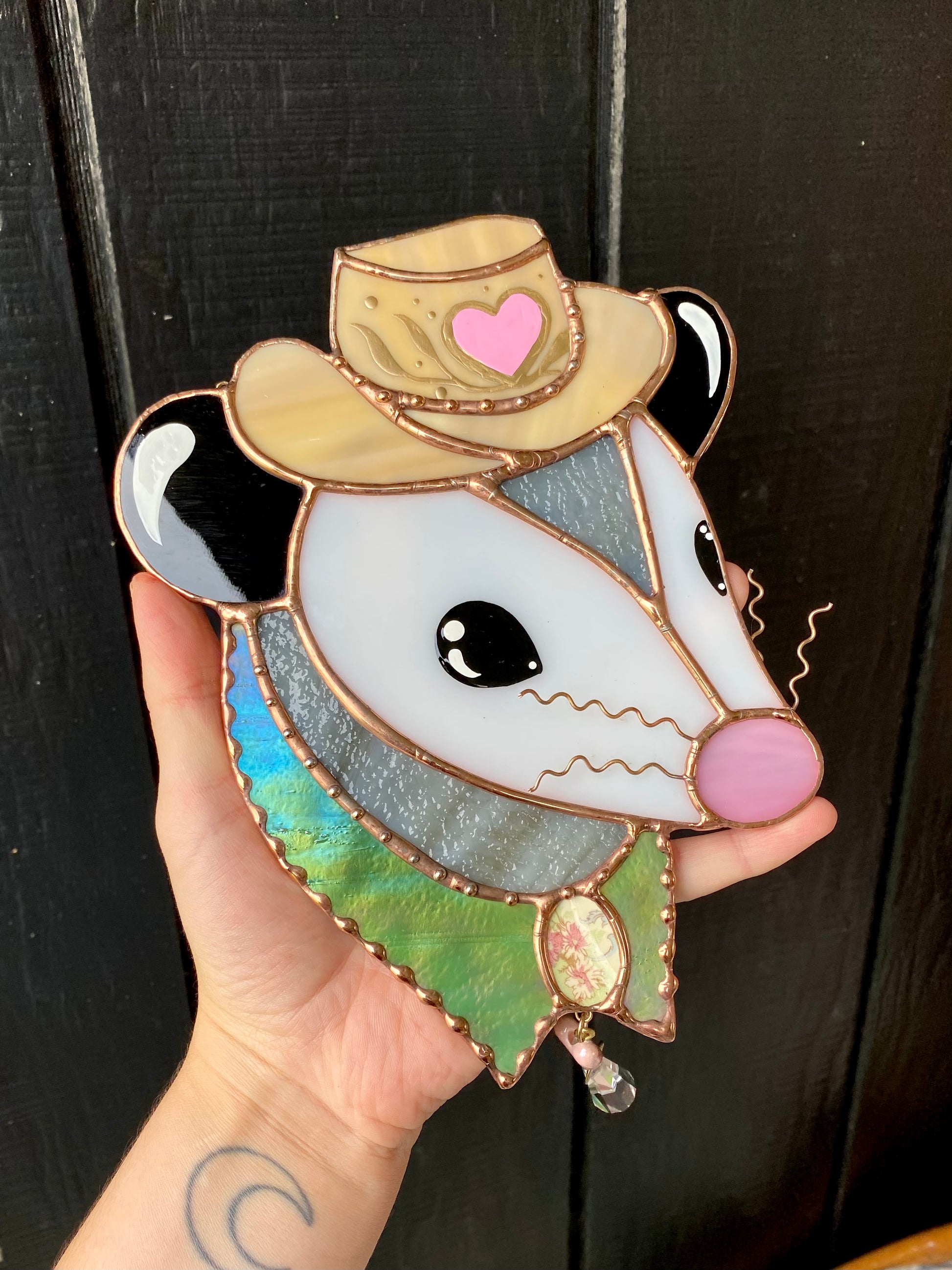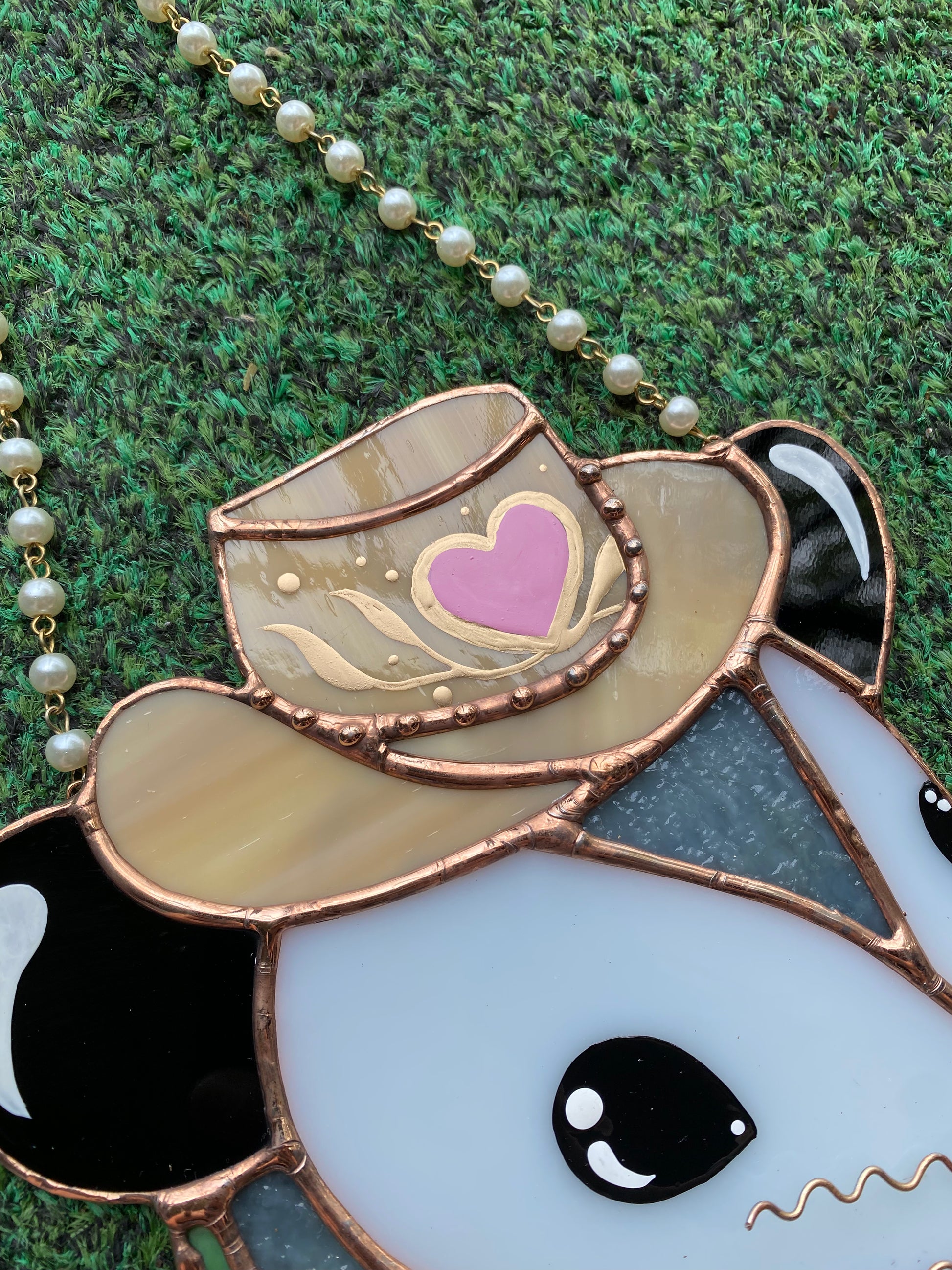 One of a kind! Measures 8.5” tall and 6” wide. Made with iridescent glass for bandana and vintage pottery piece for the bolo tie. Has a gold pearl chain and hang up kit to hang her up wherever you please!