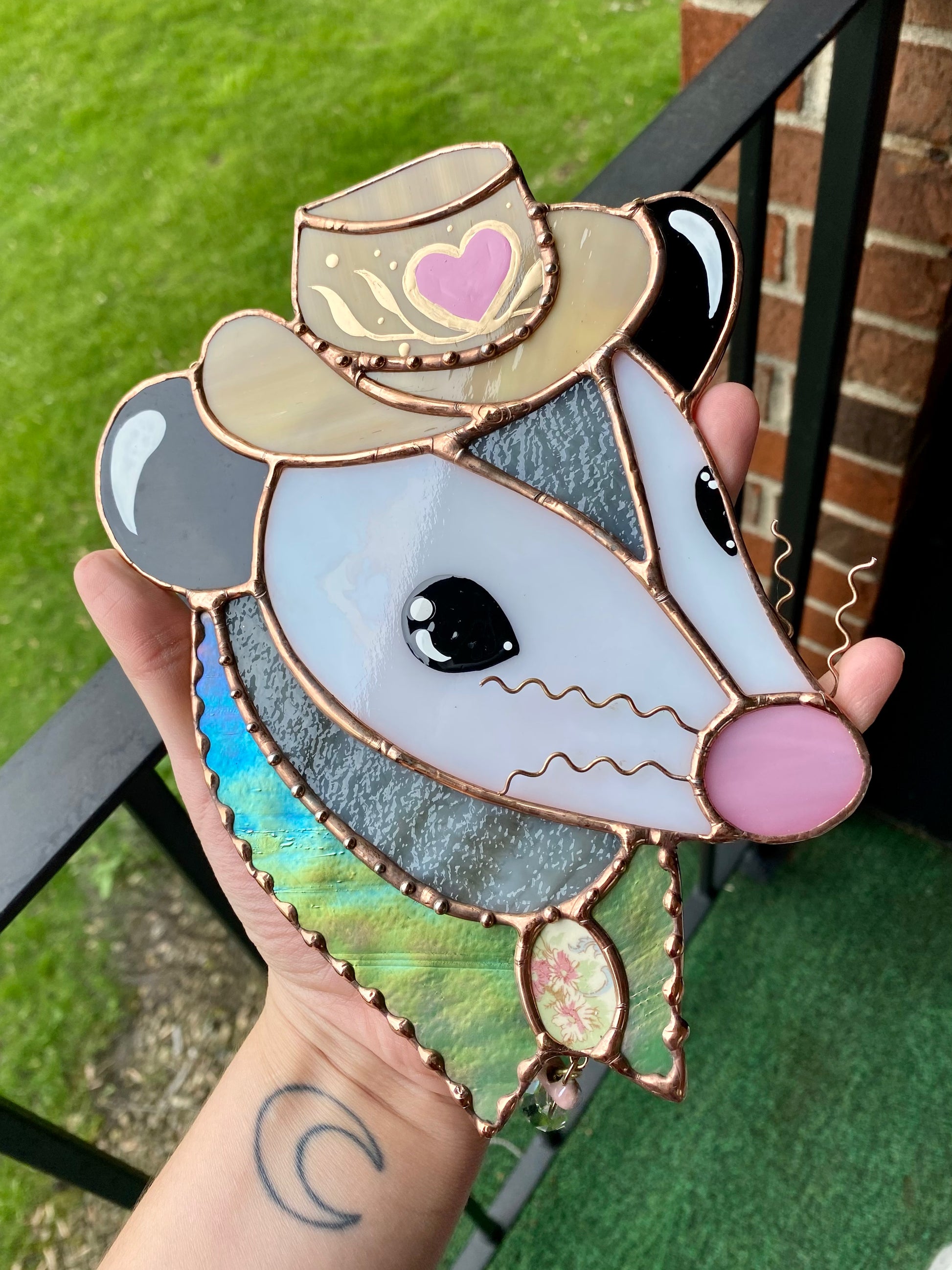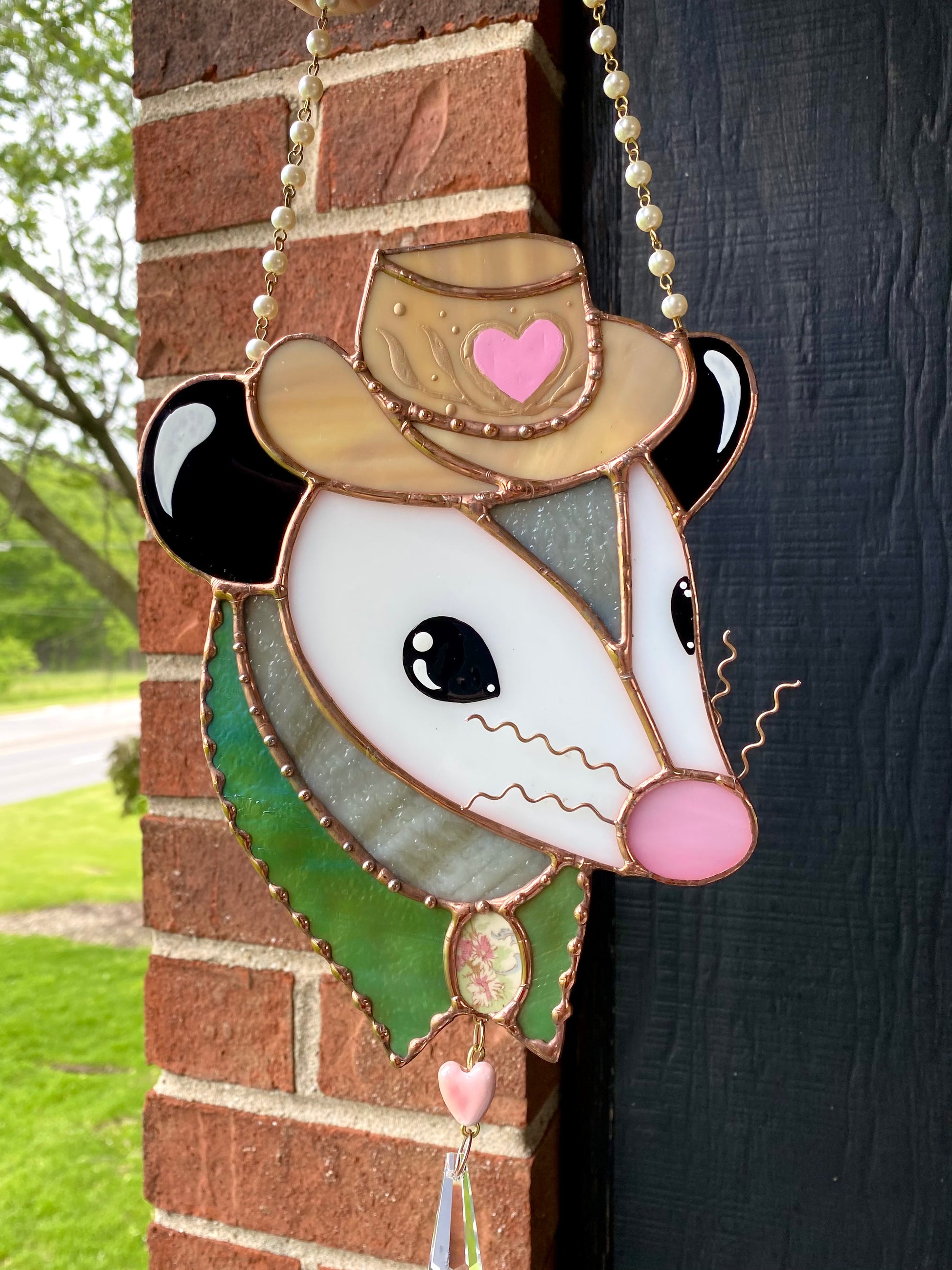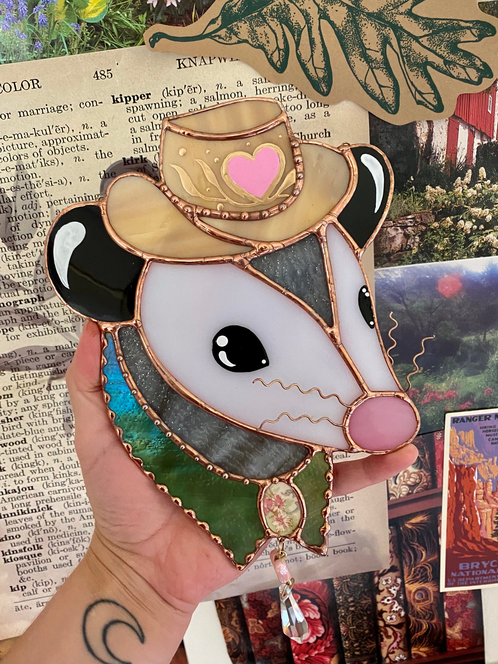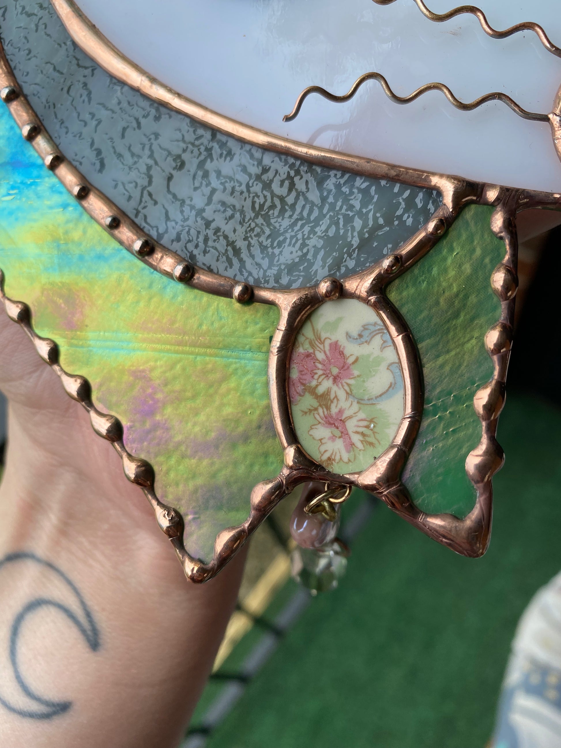 One of a kind! Measures 8.5” tall and 6” wide. Made with iridescent glass for bandana and vintage pottery piece for the bolo tie. Has a gold pearl chain and hang up kit to hang her up wherever you please!