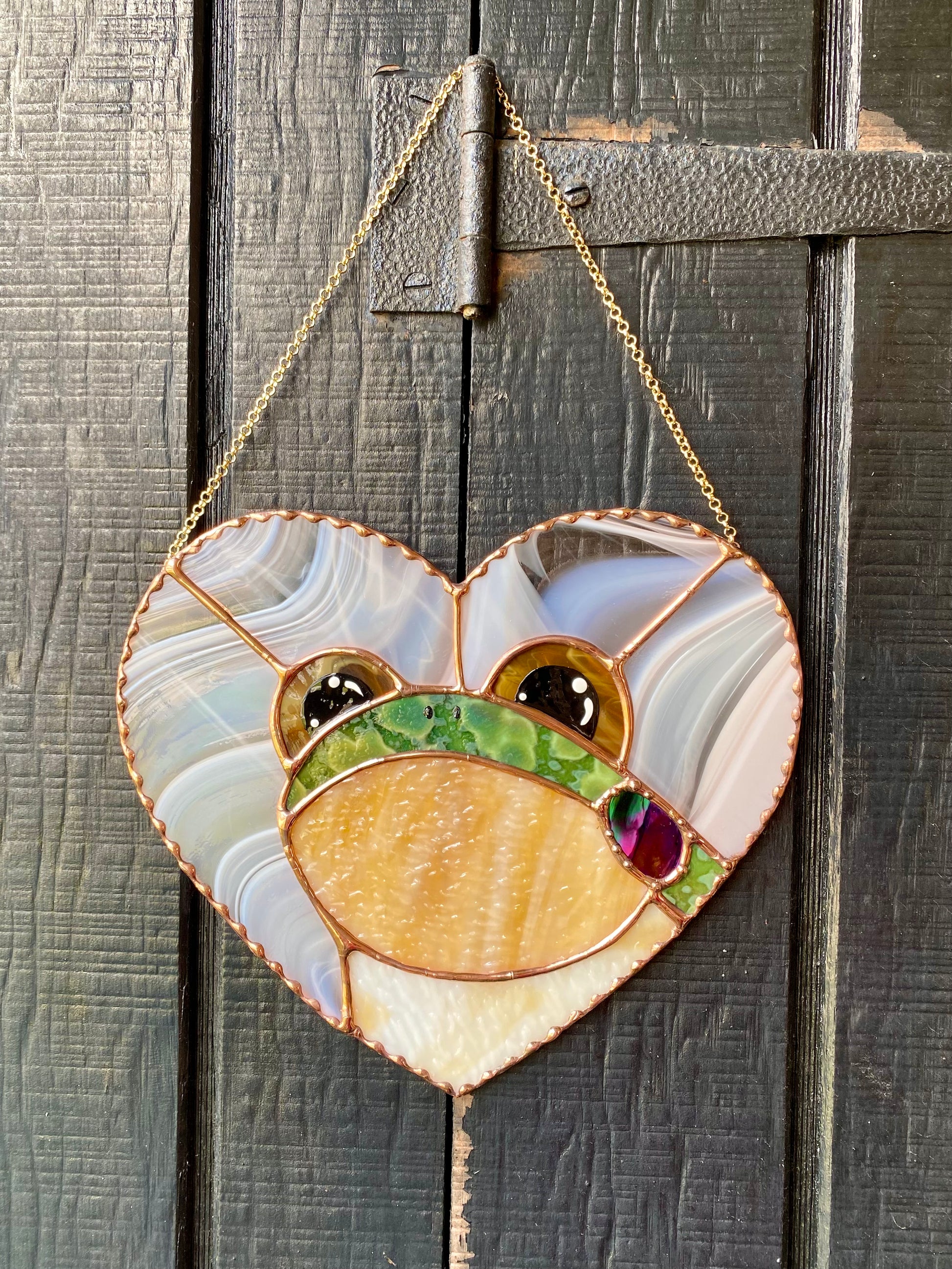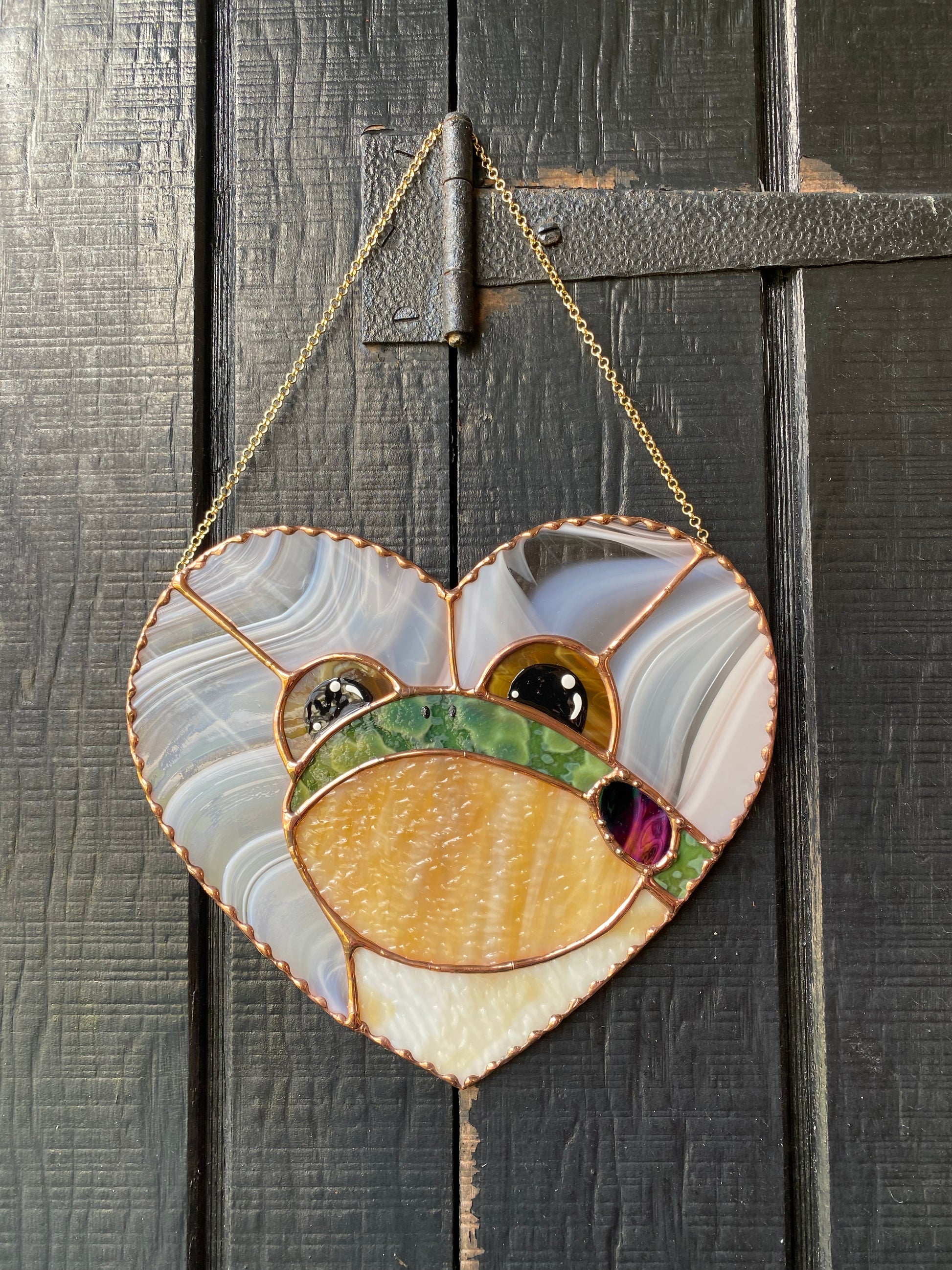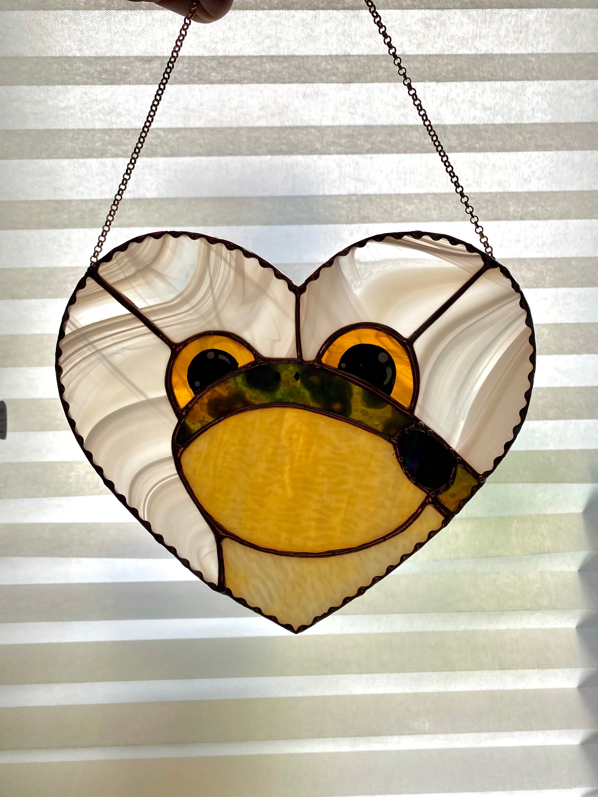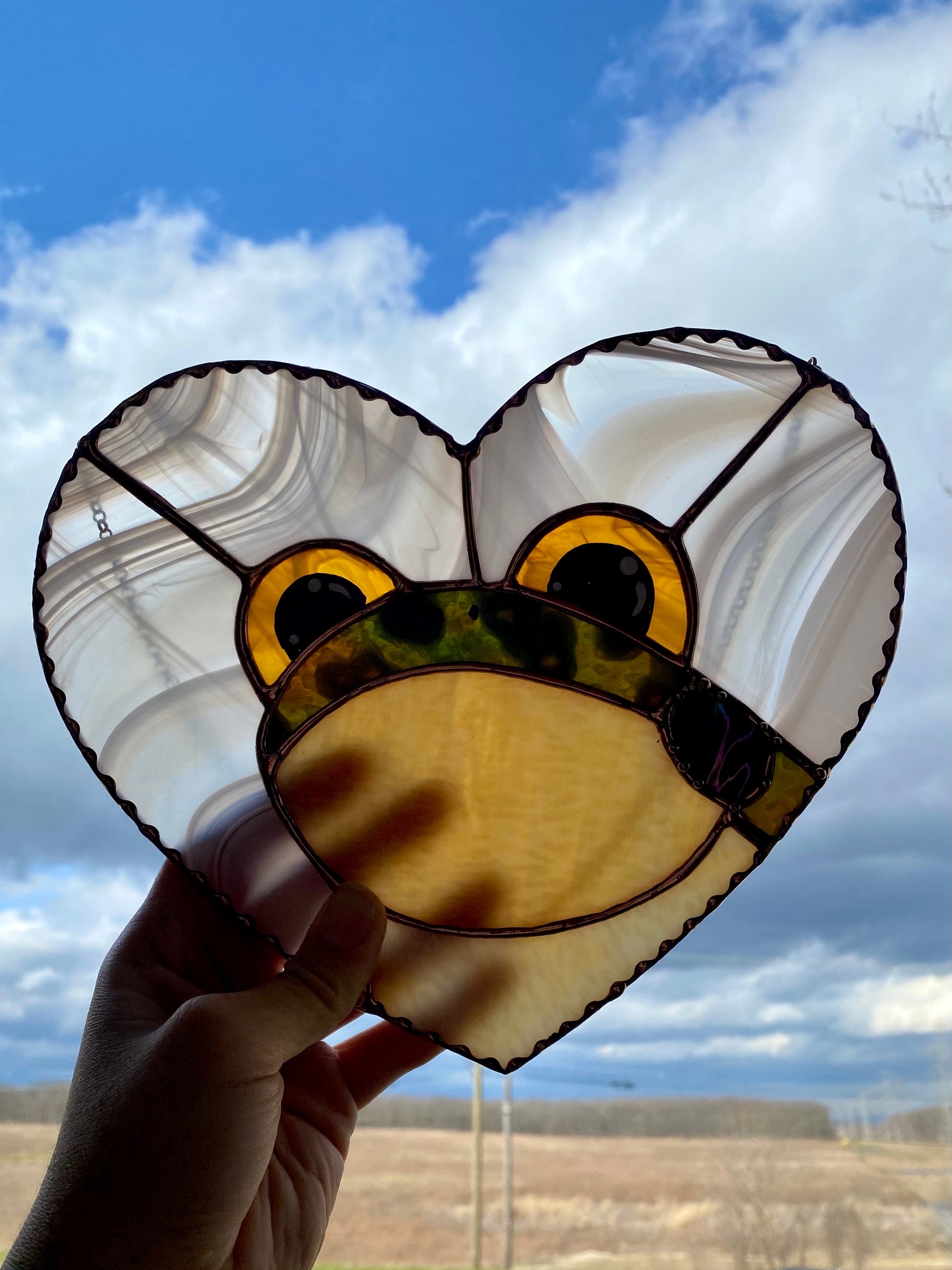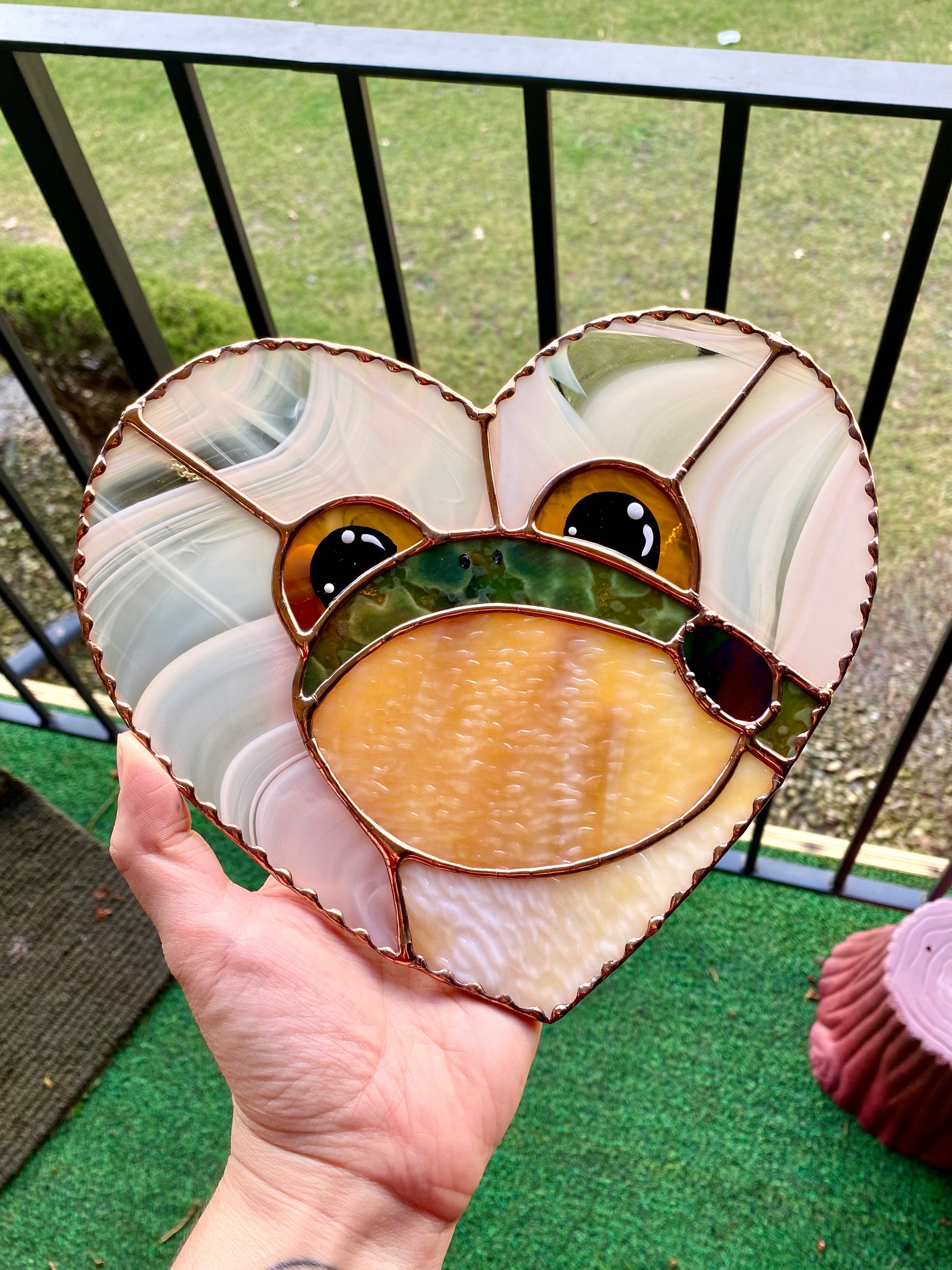 Glass measures 8” by 9”. I used a beautiful baby peach glass for the background and the perfect mottled green for the frog! His eyes are a bright yellow amber swirl.