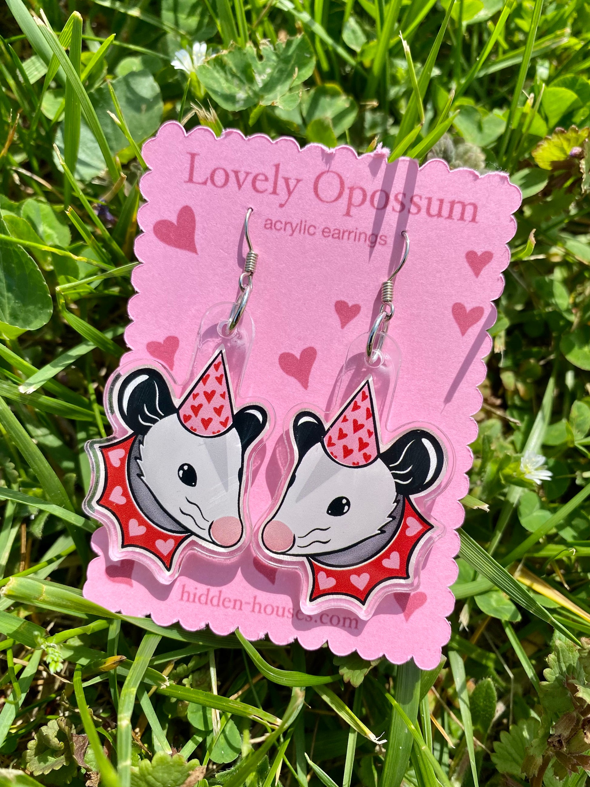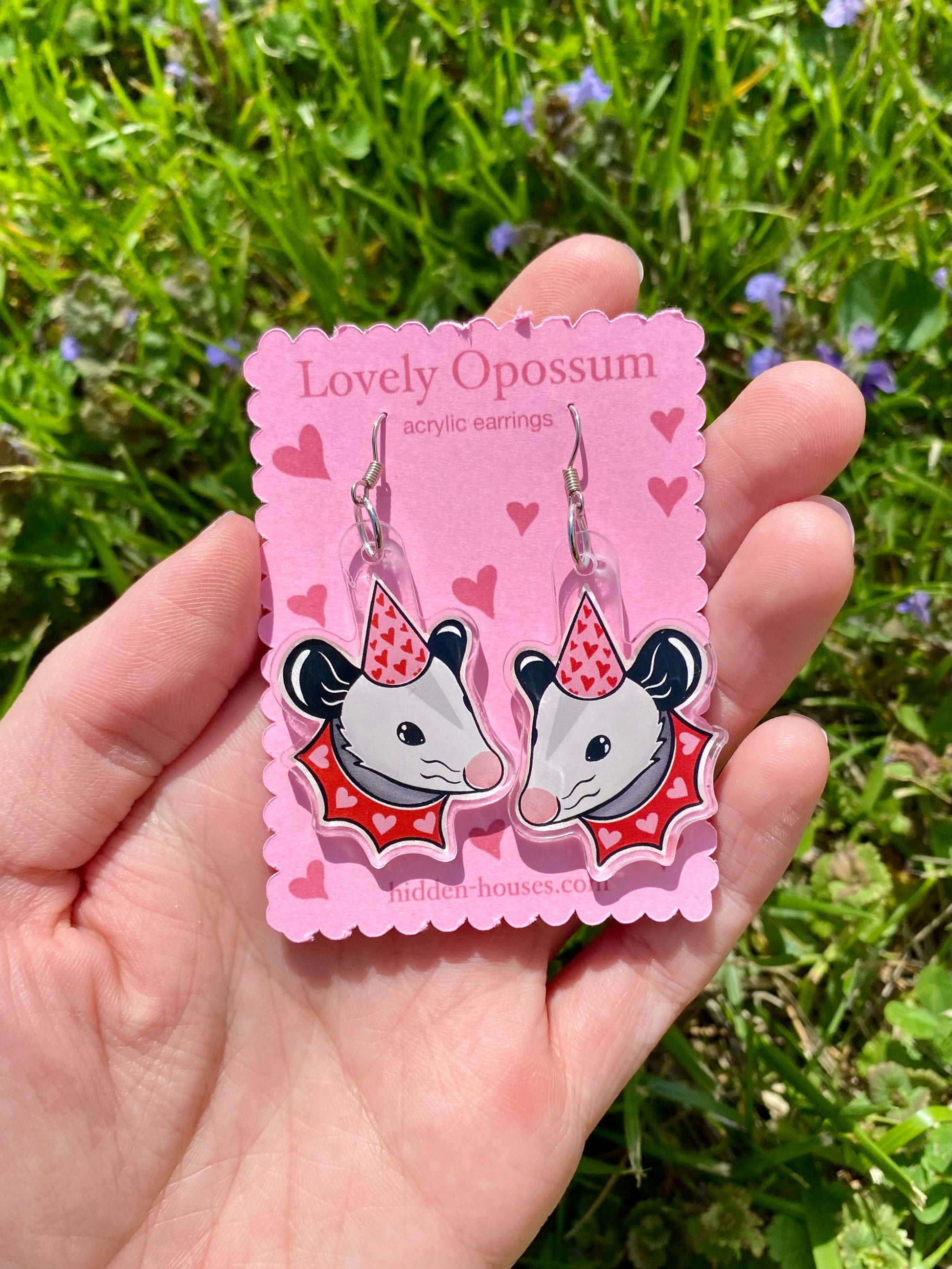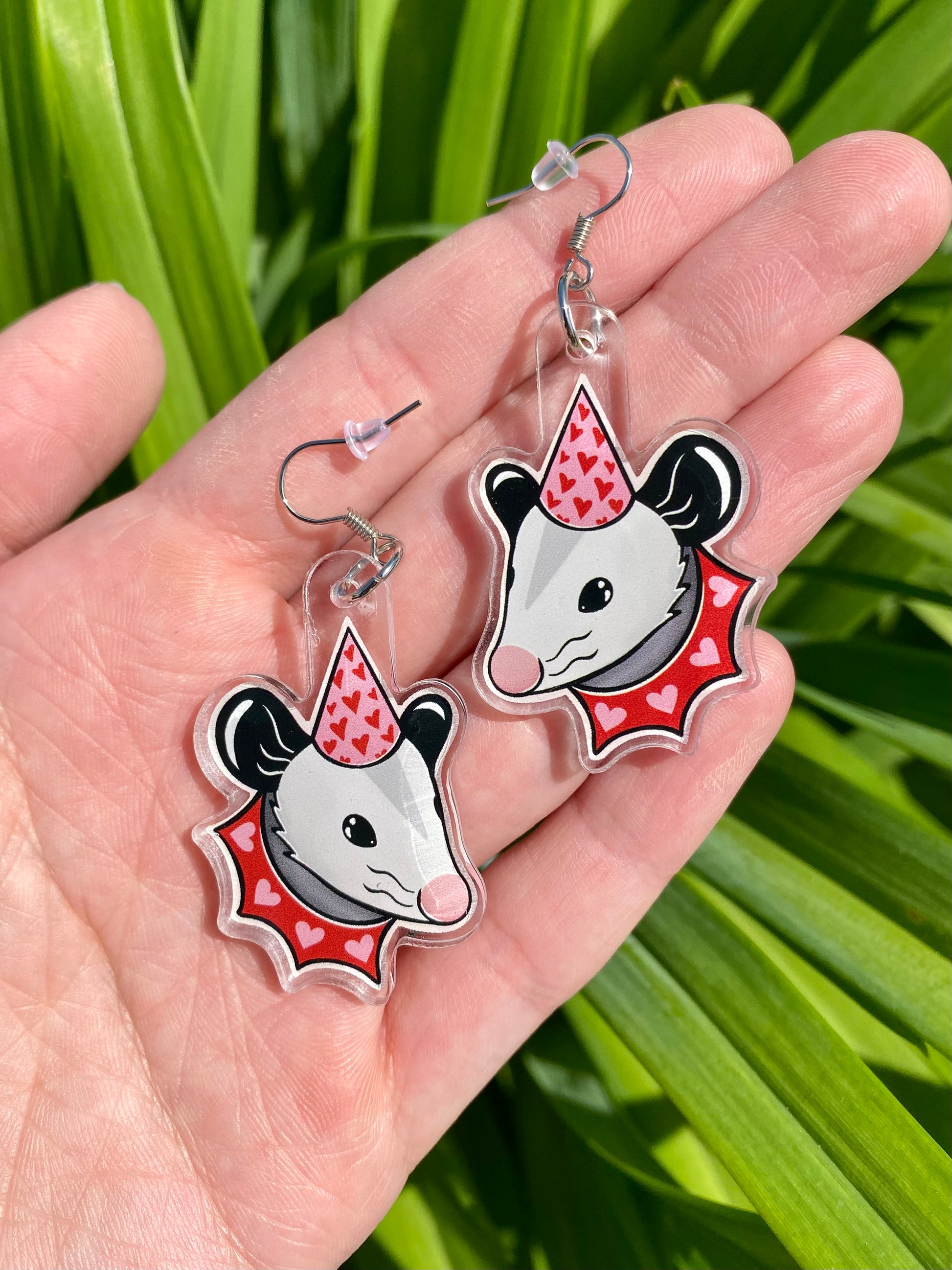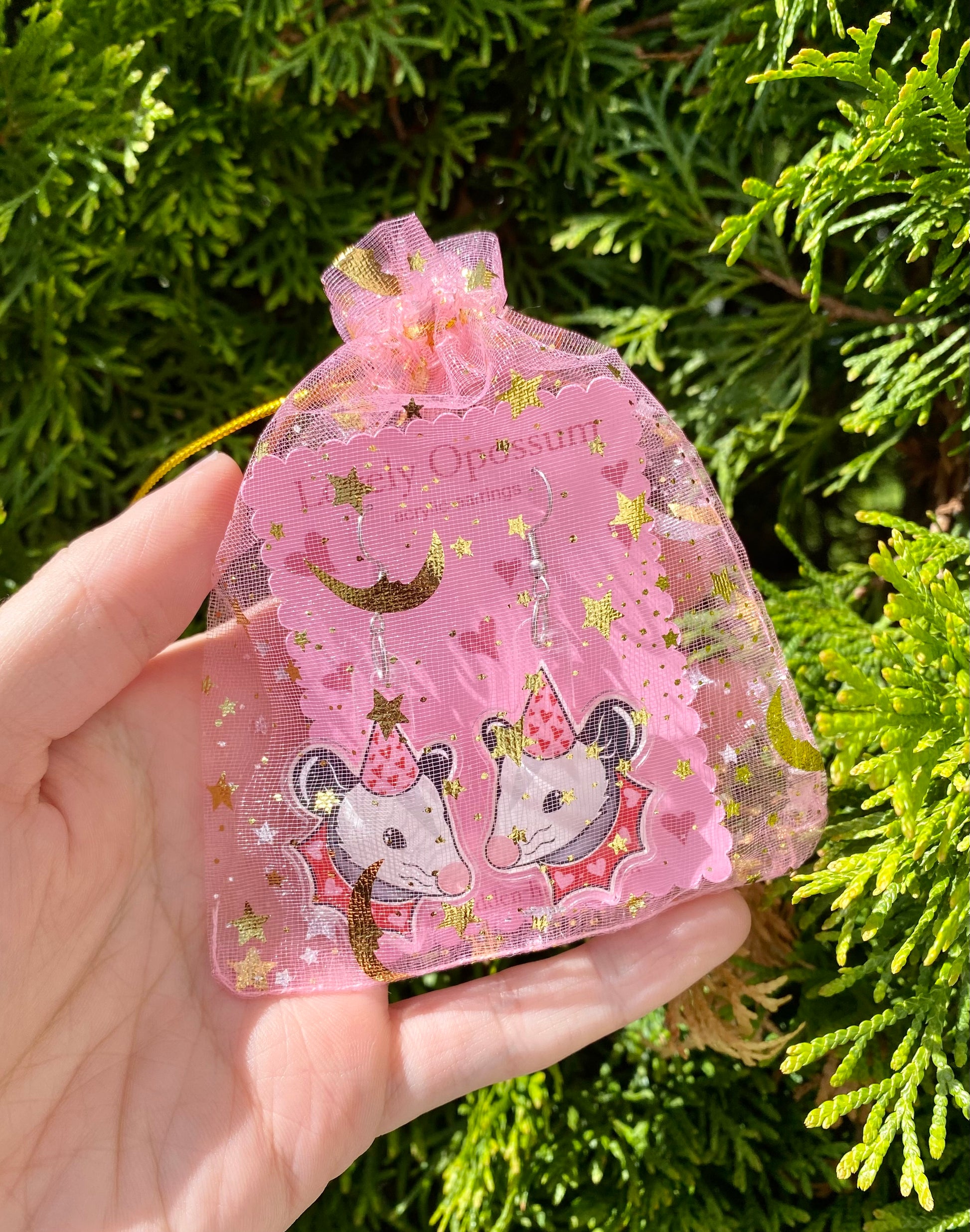 Each opossum measures approximately 1.75” tall and 1” wide. Nickel free fishhooks. Back of earrings are white.