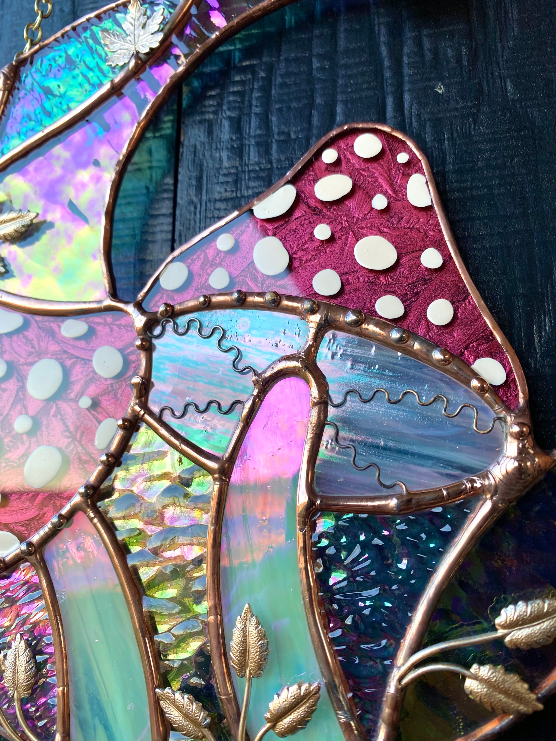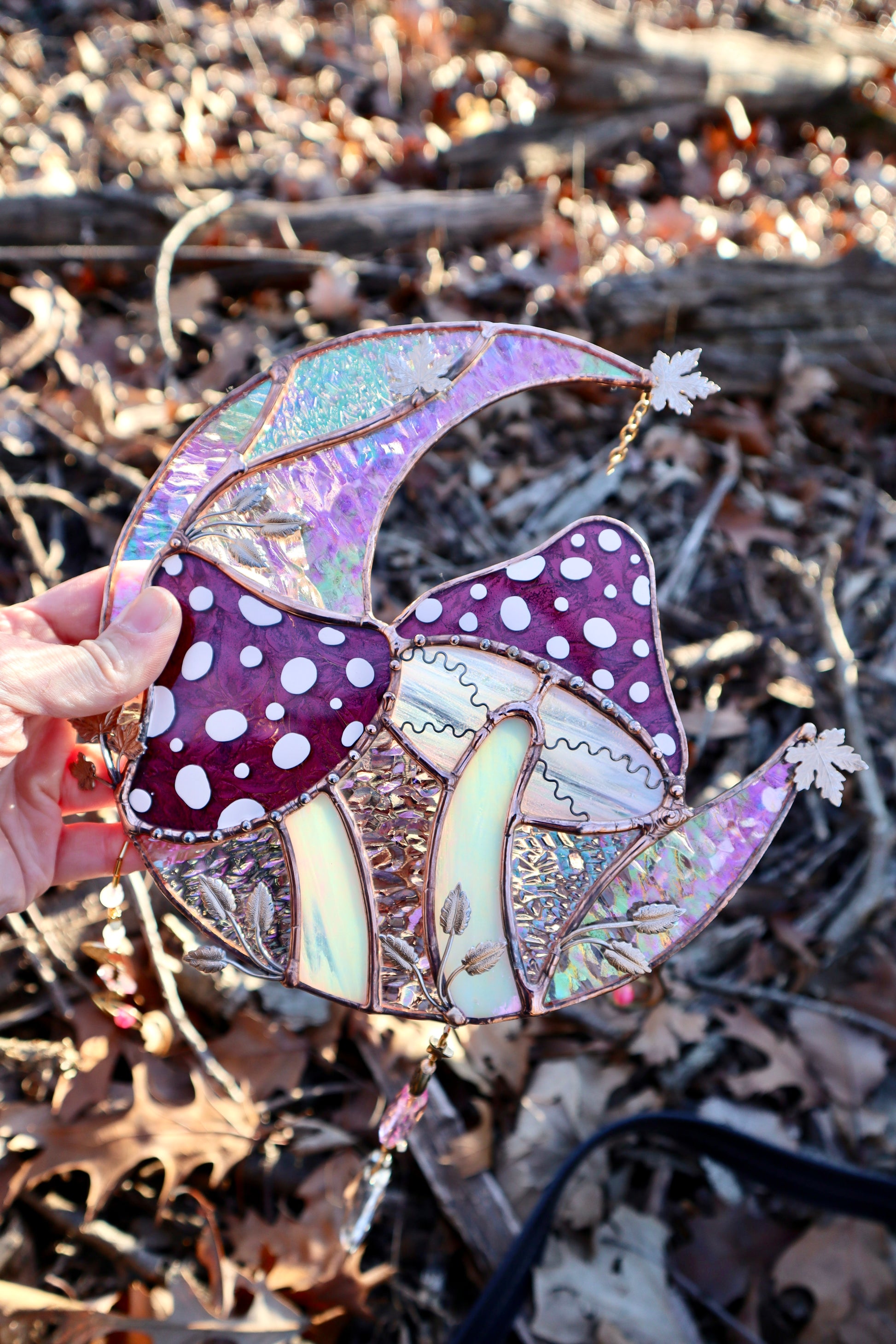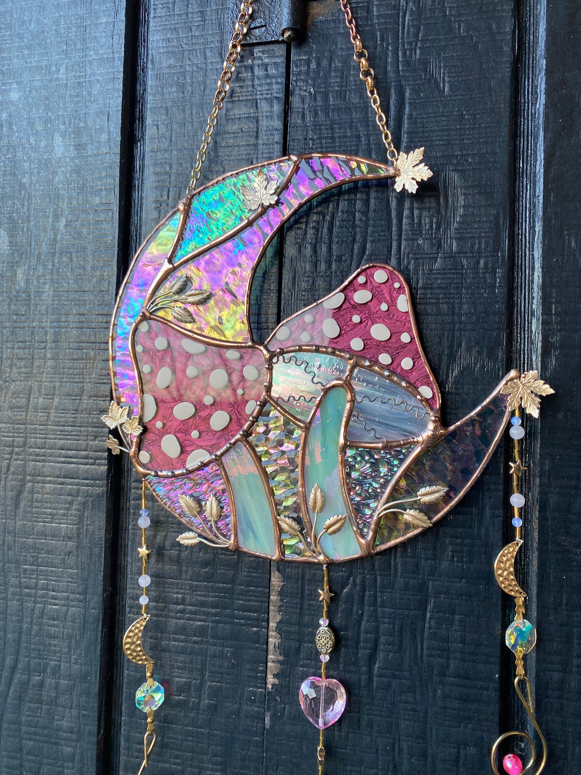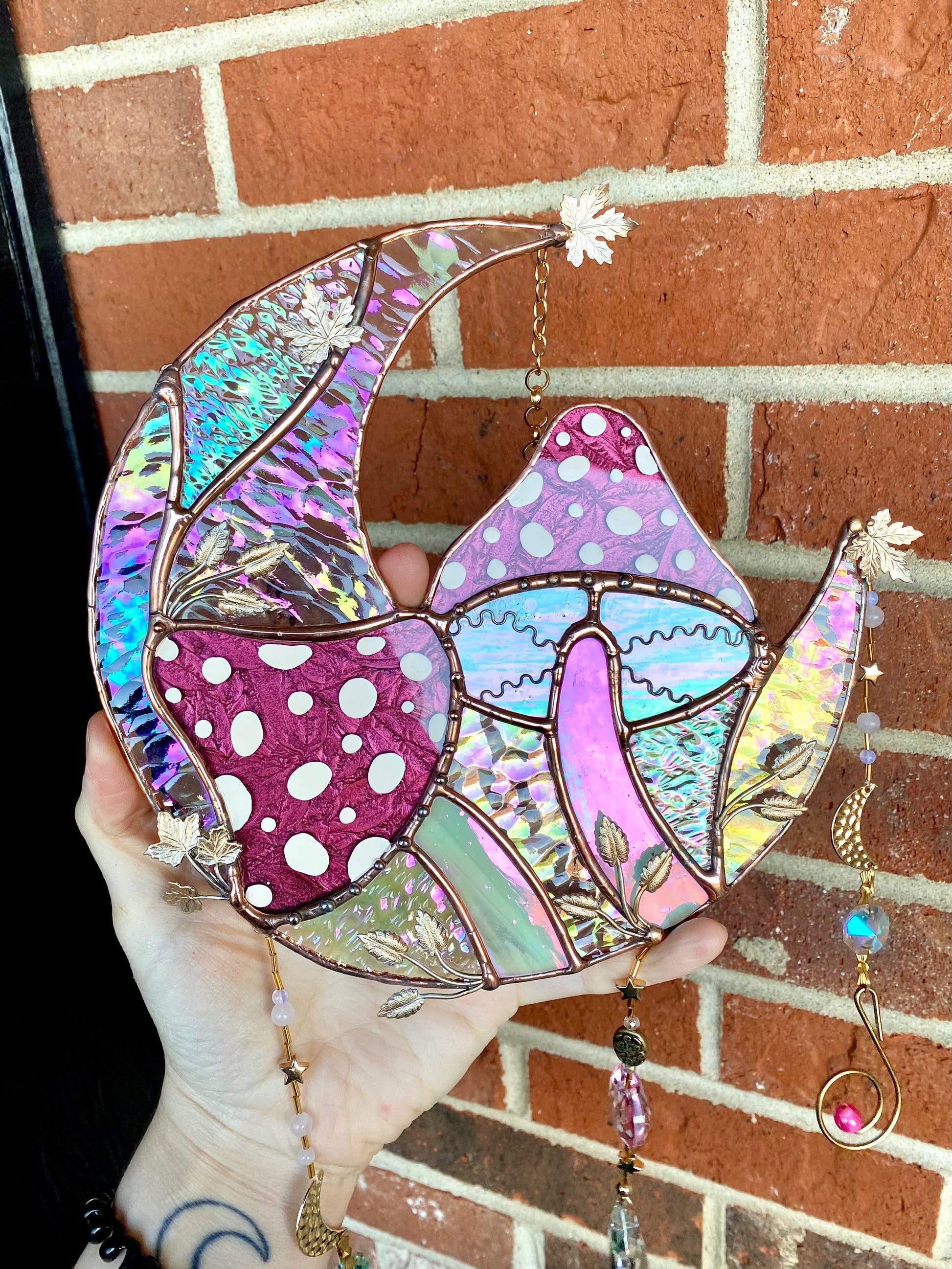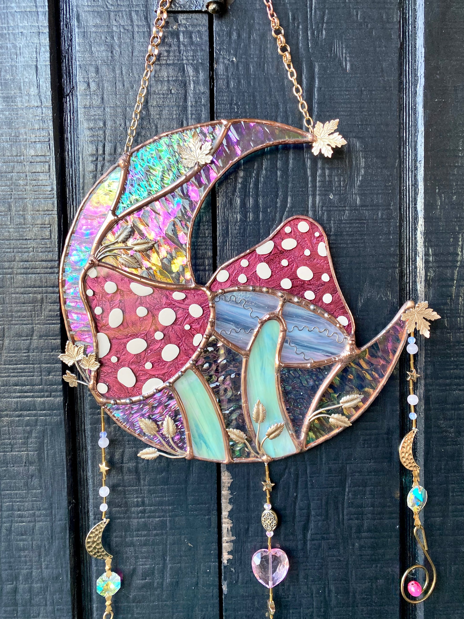 One of a kind! Measures 8” by 8”. Length from top of chain to bottom of strung jewels is approximately 20”. Mushrooms made with red Van Gogh glass and iridescent textured glass for the moon and mushroom stems. Multiple sun-catcher beads reflect rainbows in the sun! Comes with screw-in hook for easy hanging.