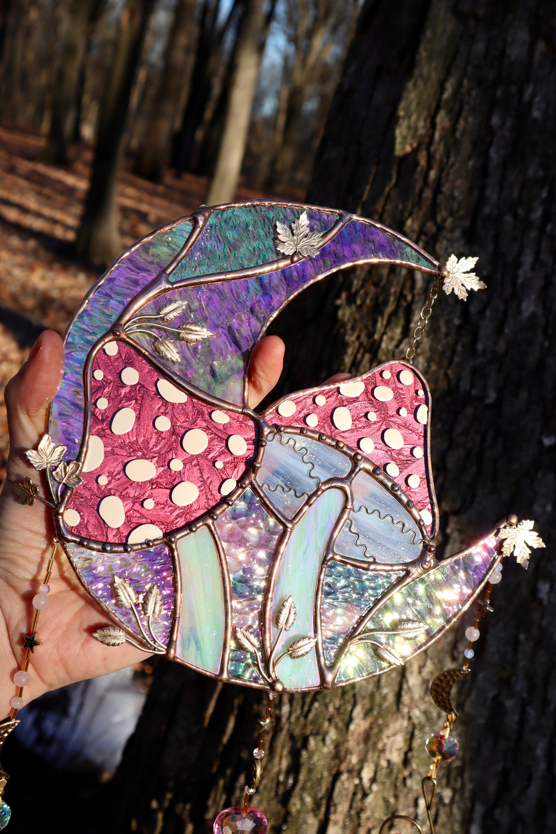 Magenta Mushroom Moon Stained Glass Suncatcher