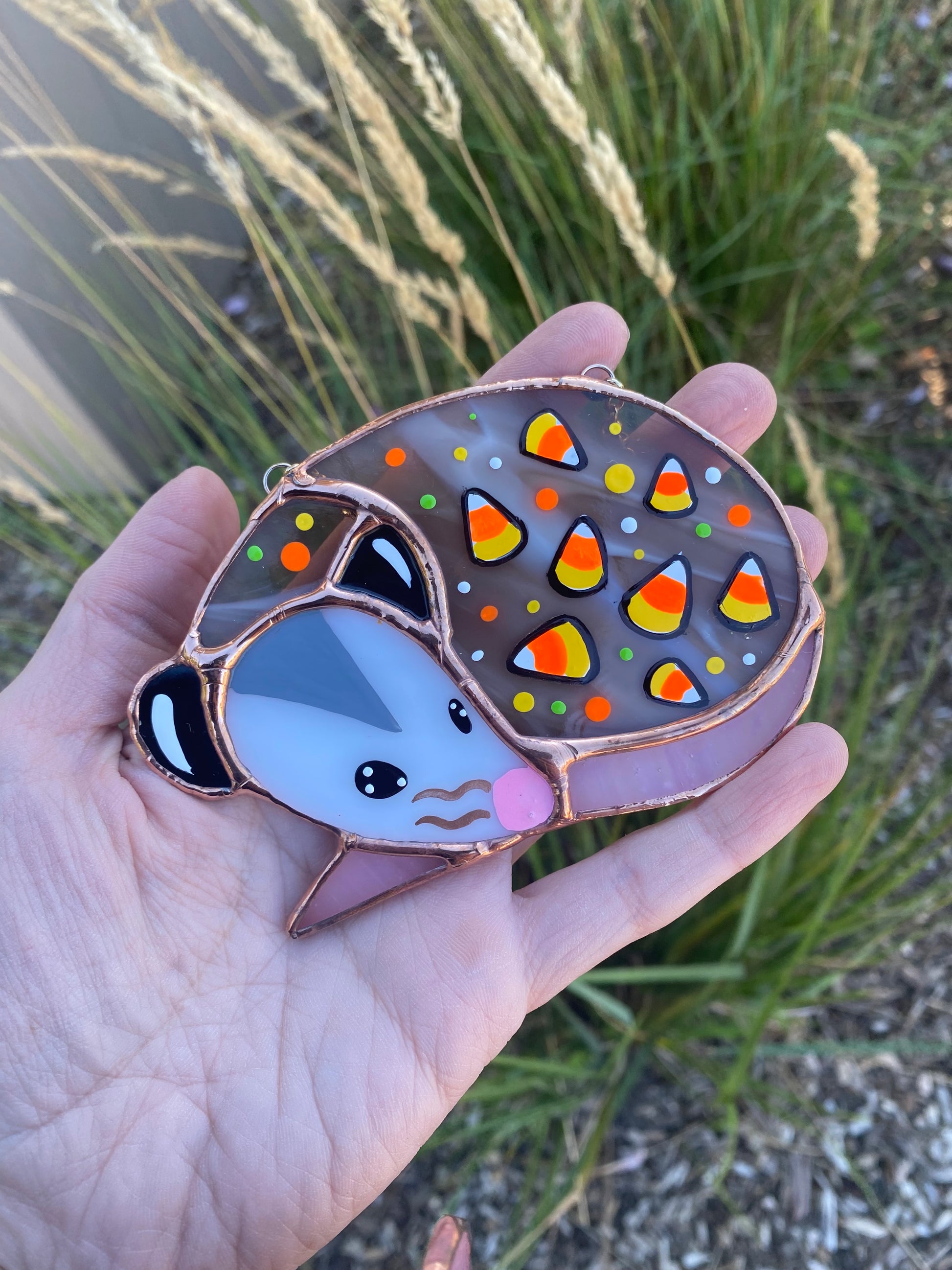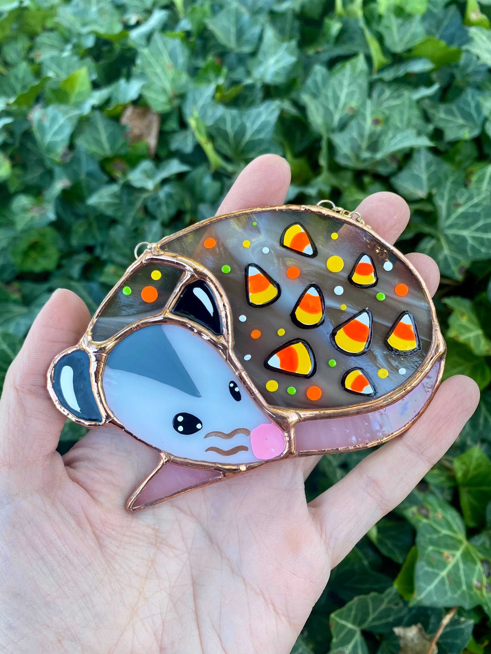 Mini Candy Corn Opossum Stained Glass Suncatcher