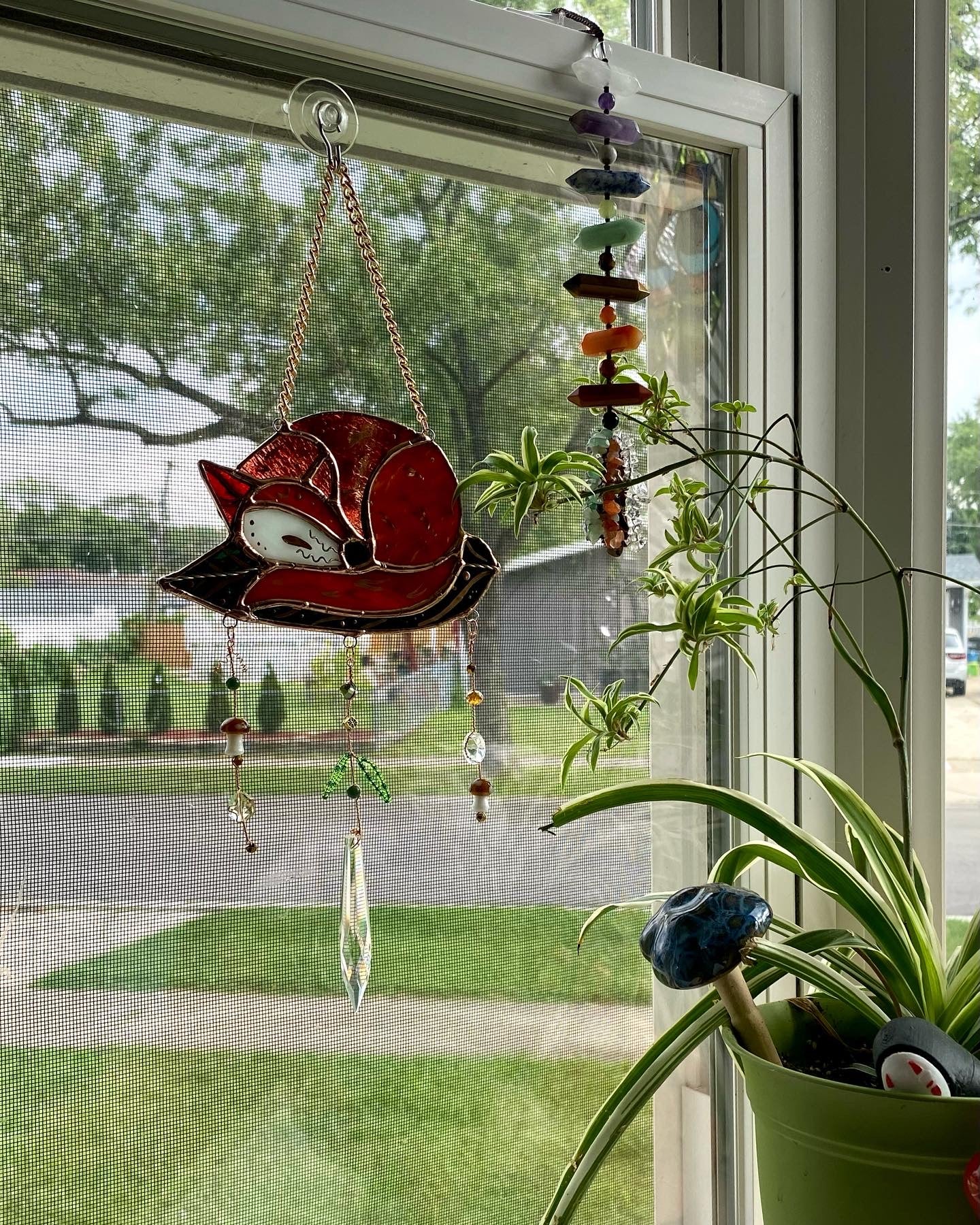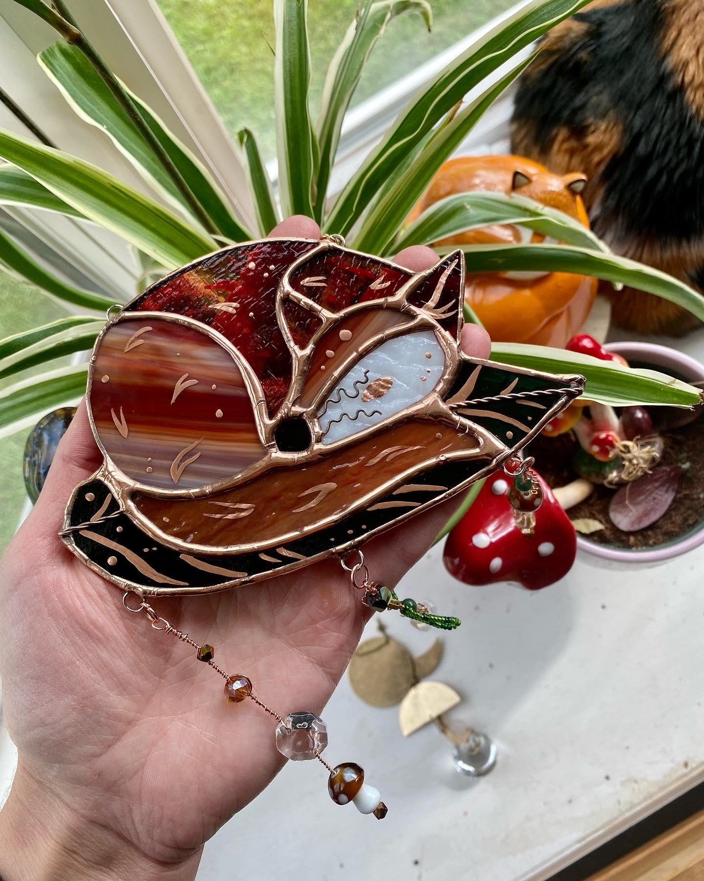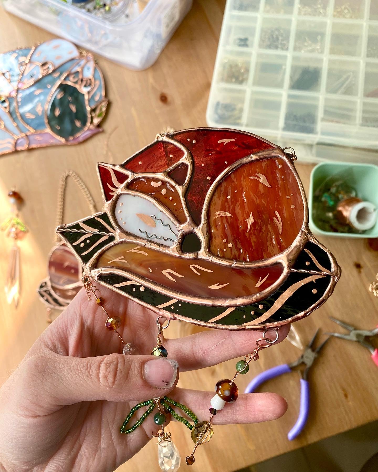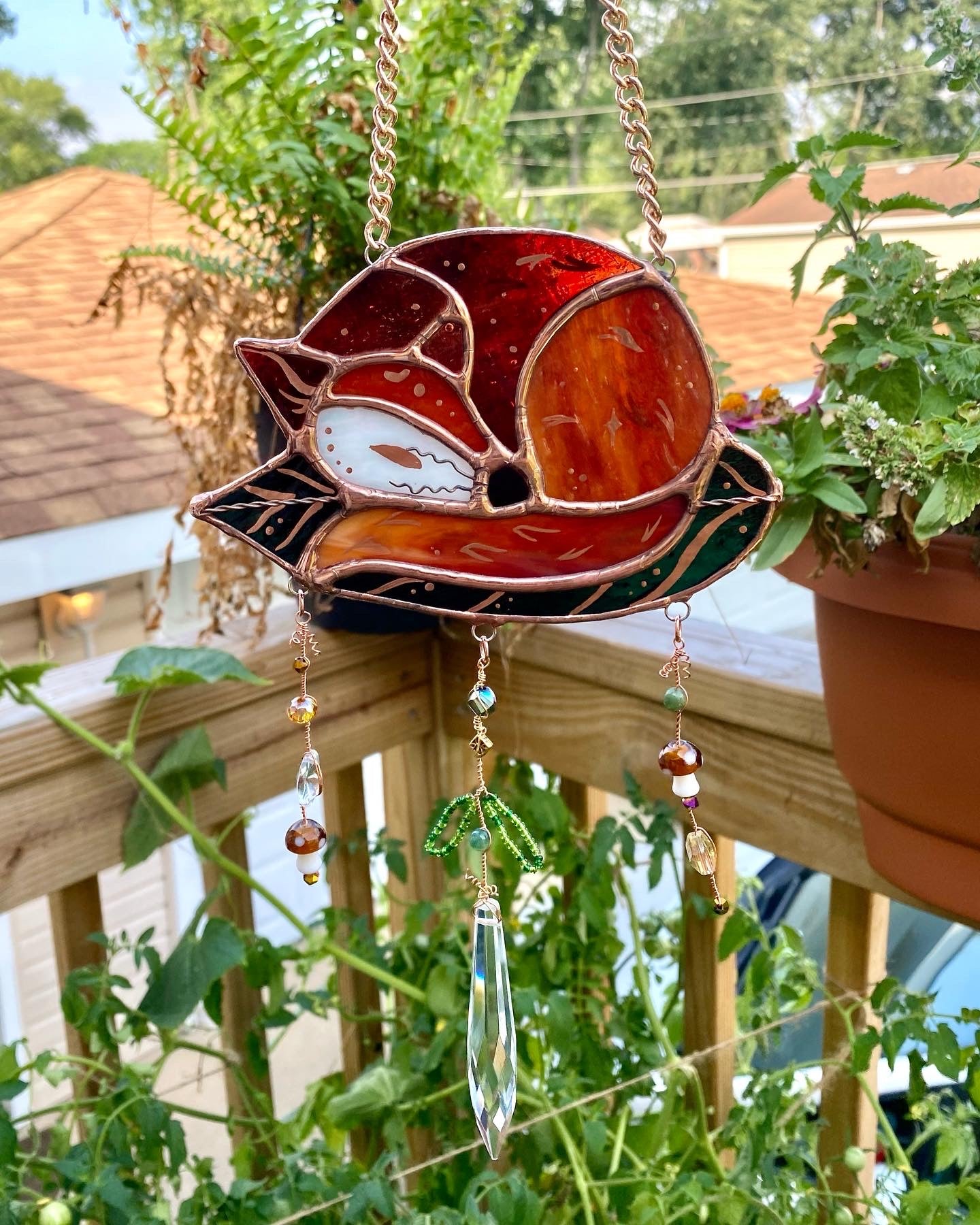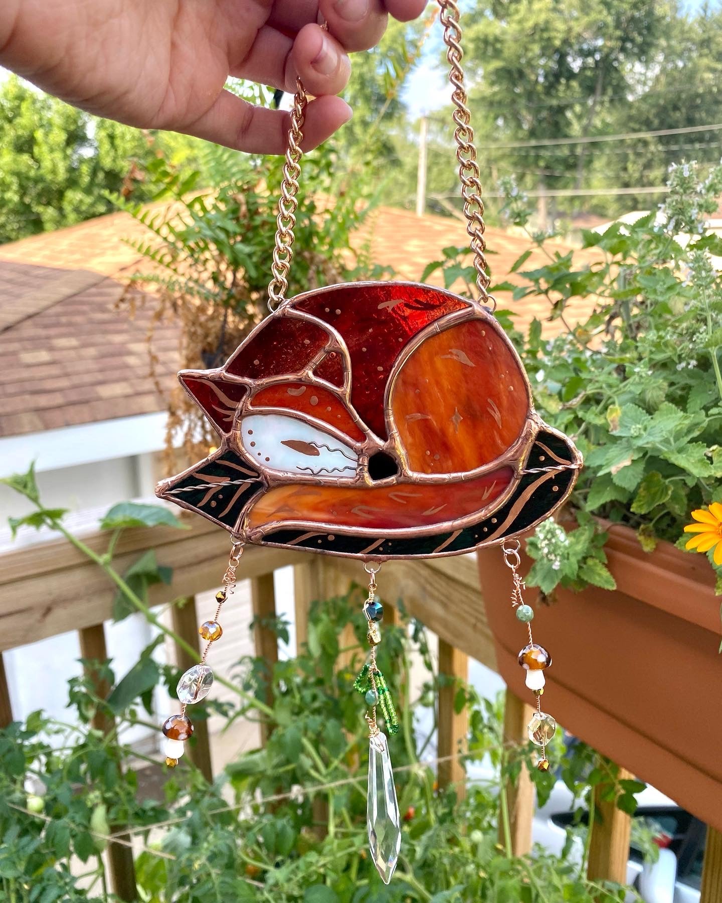 Mini stained stained glass fox with glass Sun-catcher crystal and beaded details. Measures 13.5“ from top of chain to bottom of crystal. 6” wide.
