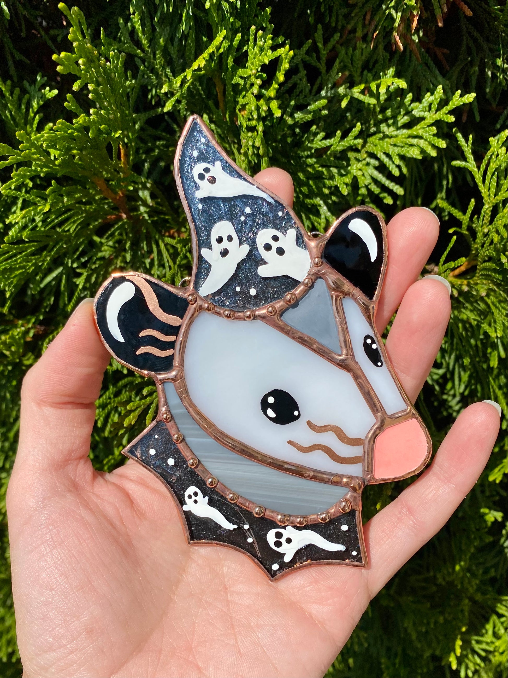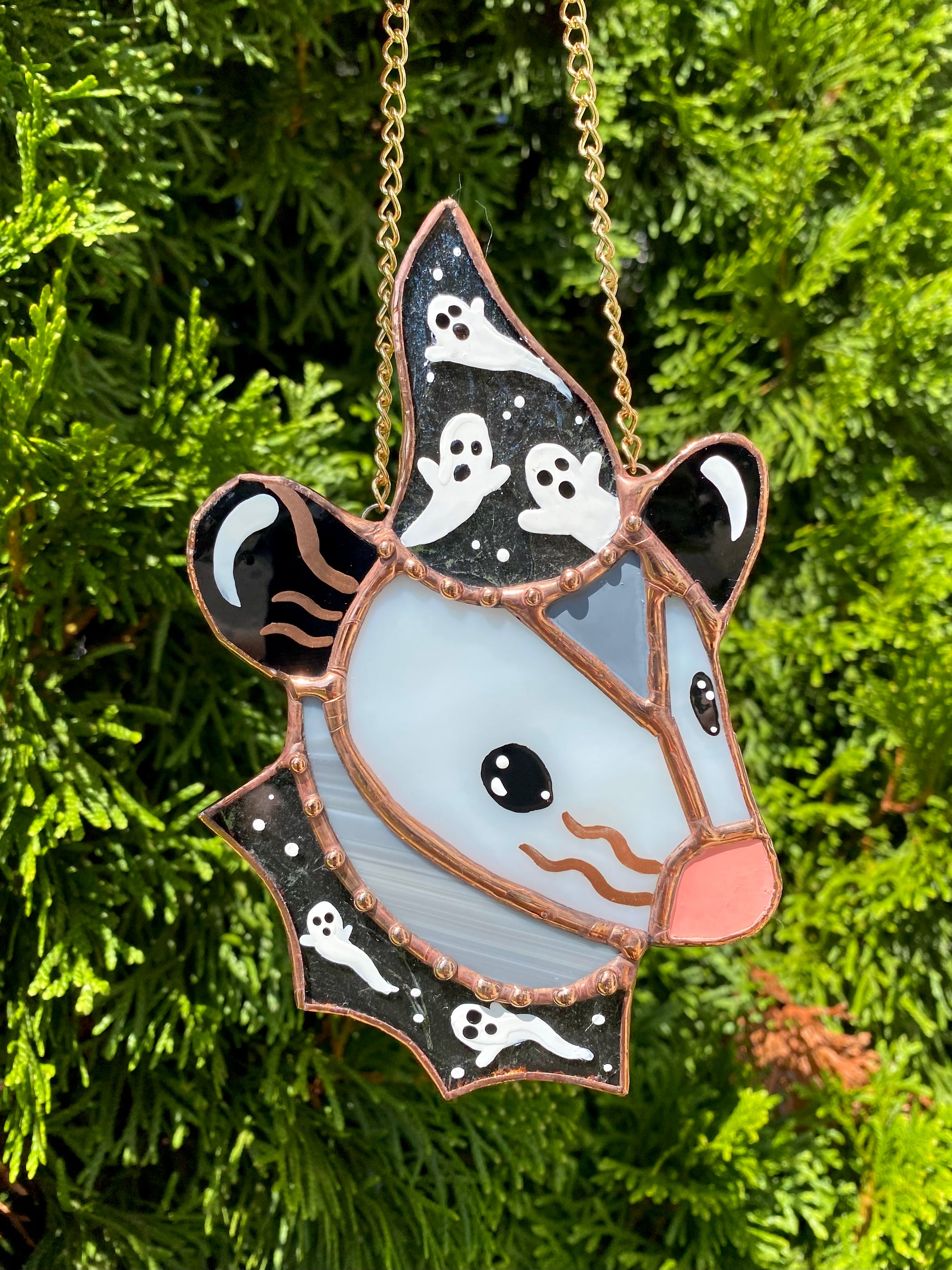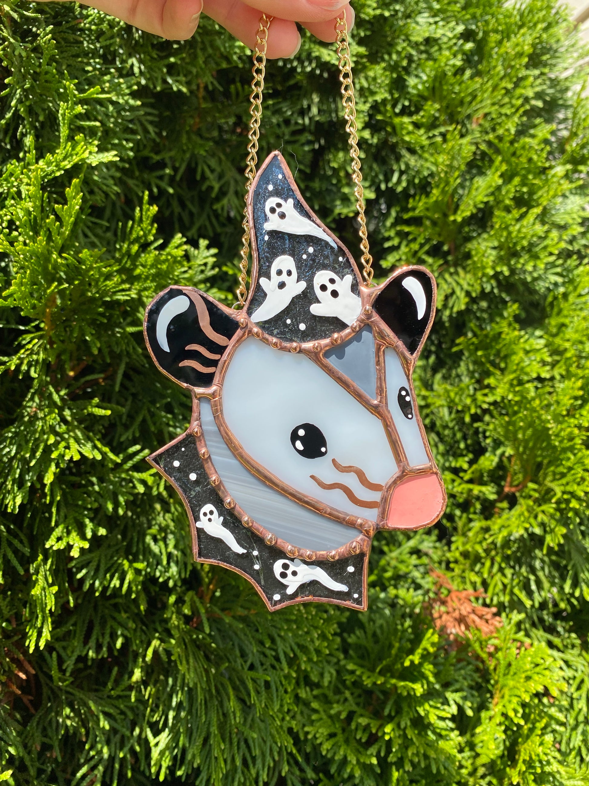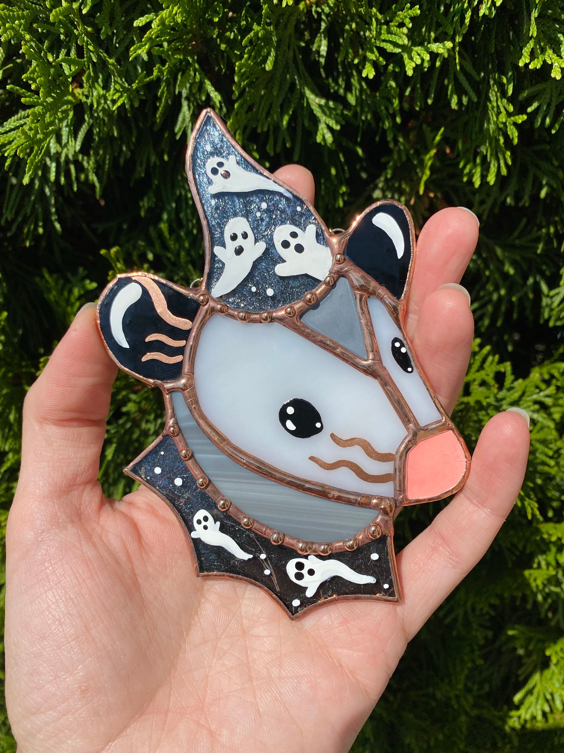 Mini Ghost Wizard Opossum Stained Glass Suncatcher