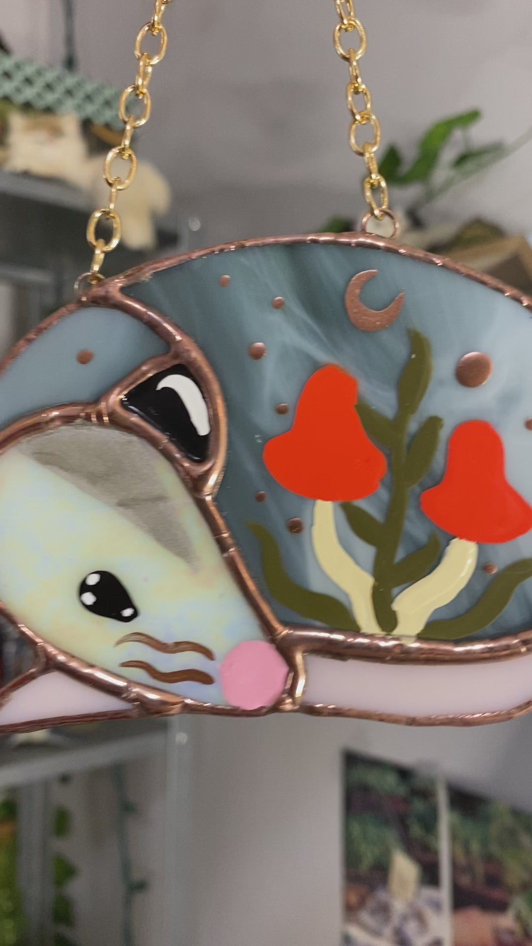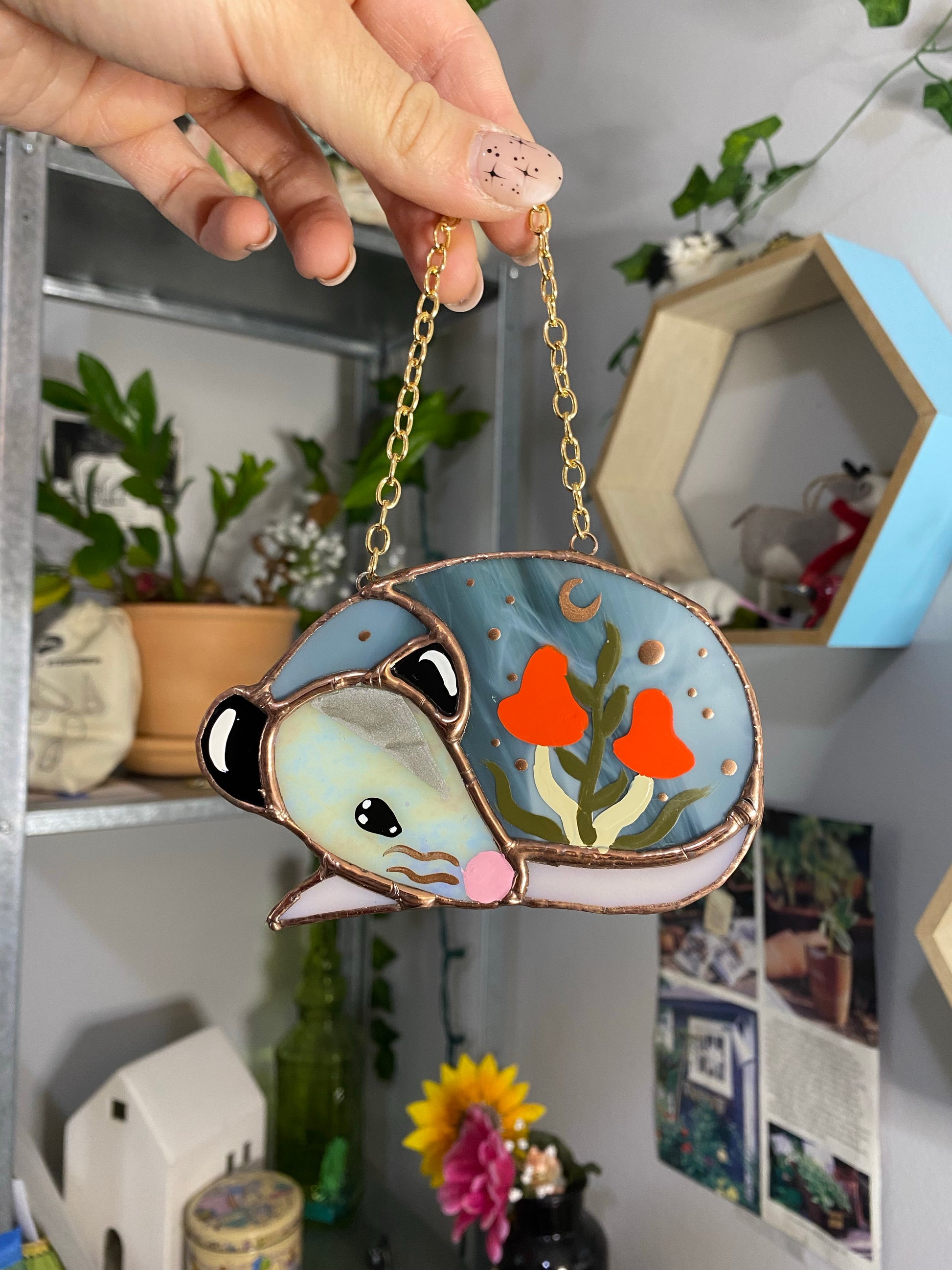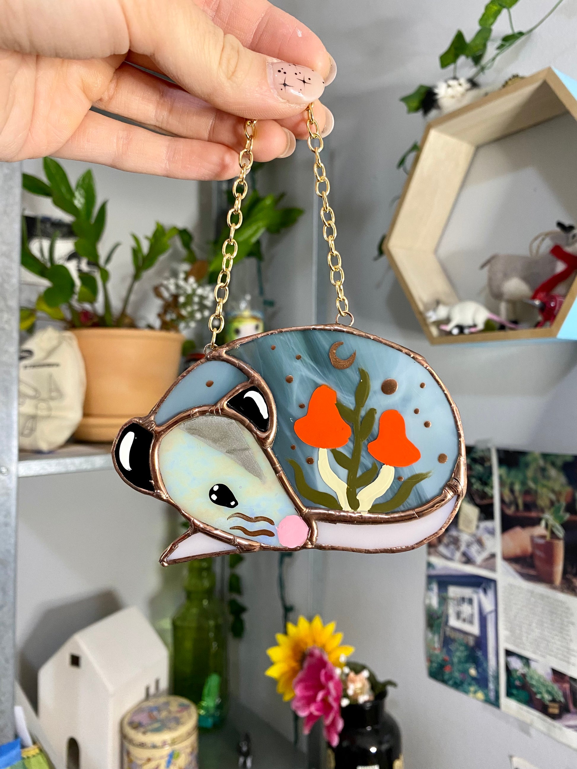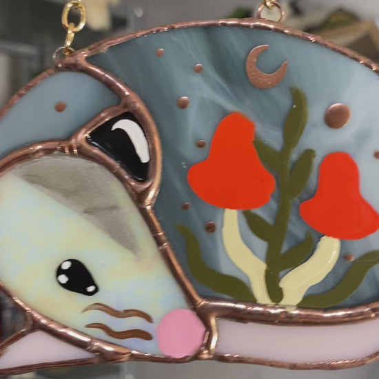 Mini Orange Mushroom Opossum Stained Glass Ornament