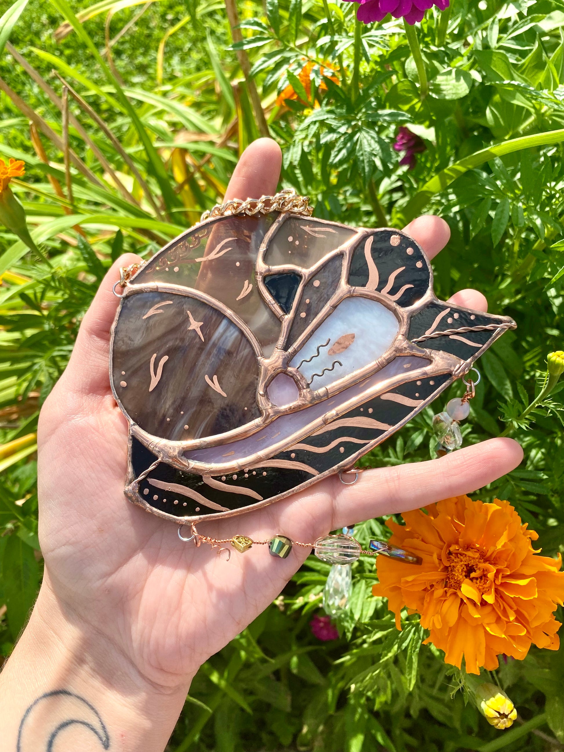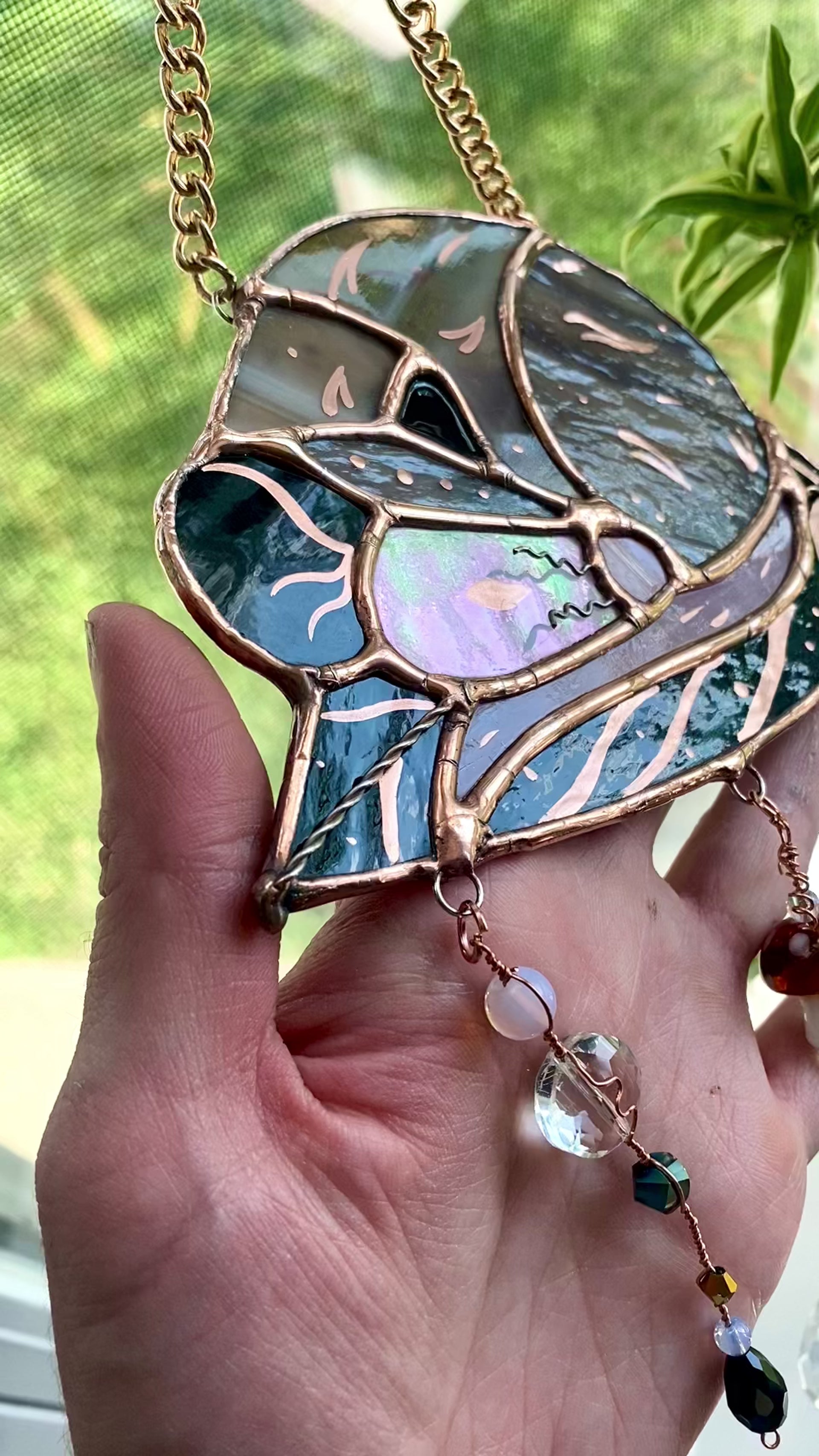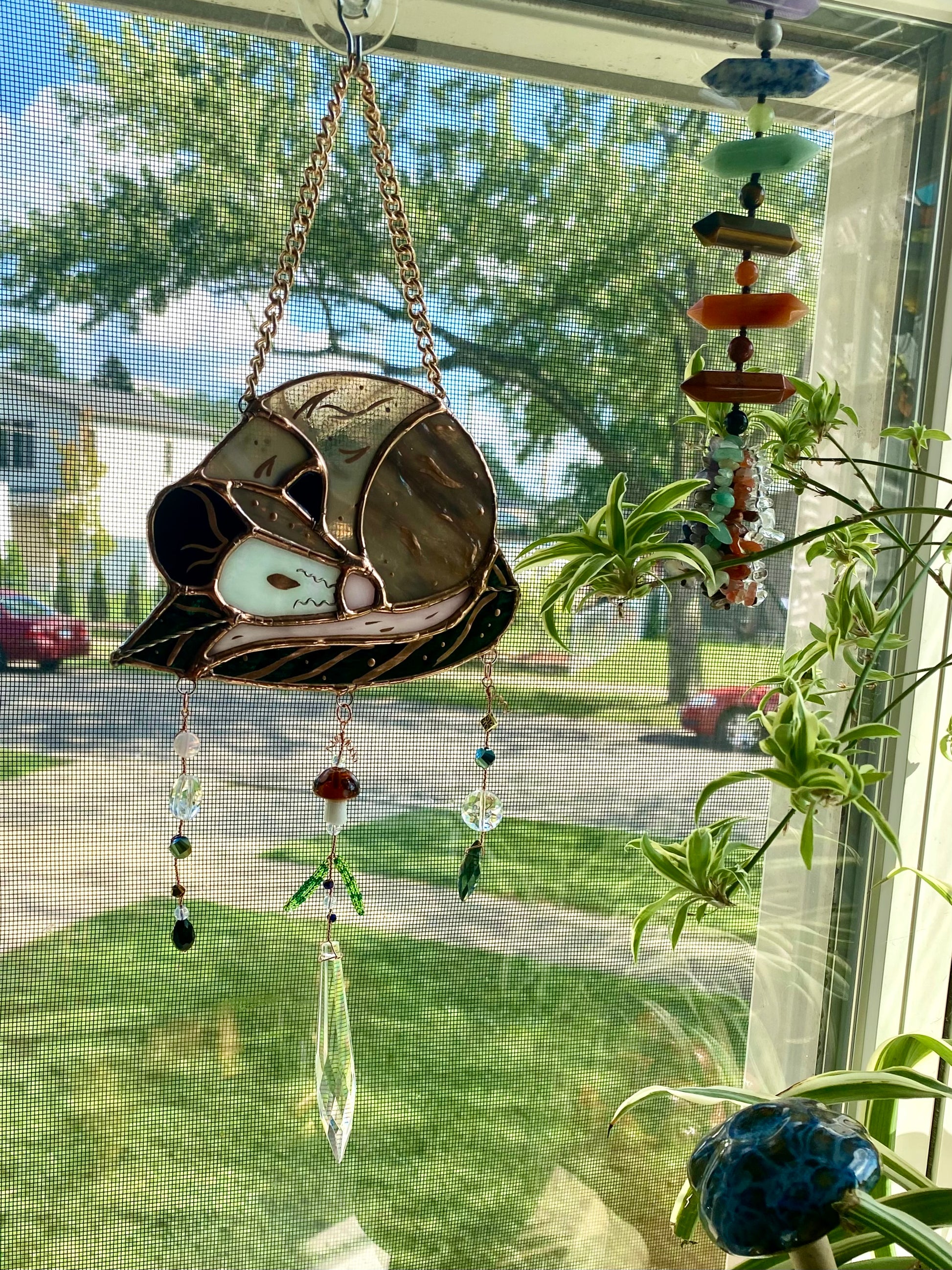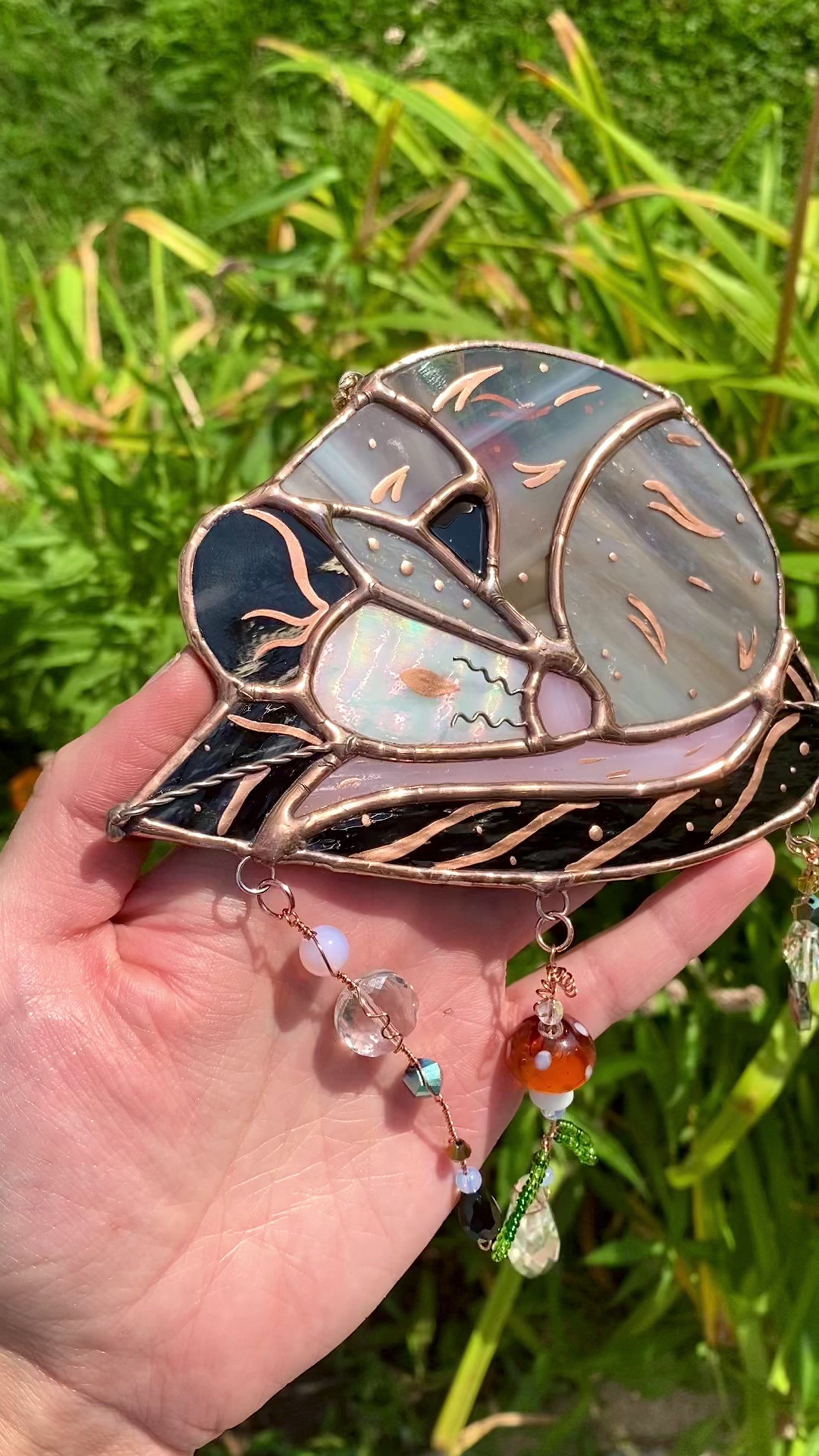 Mini stained stained glass opossum with glass suncatcher beads and beaded details.