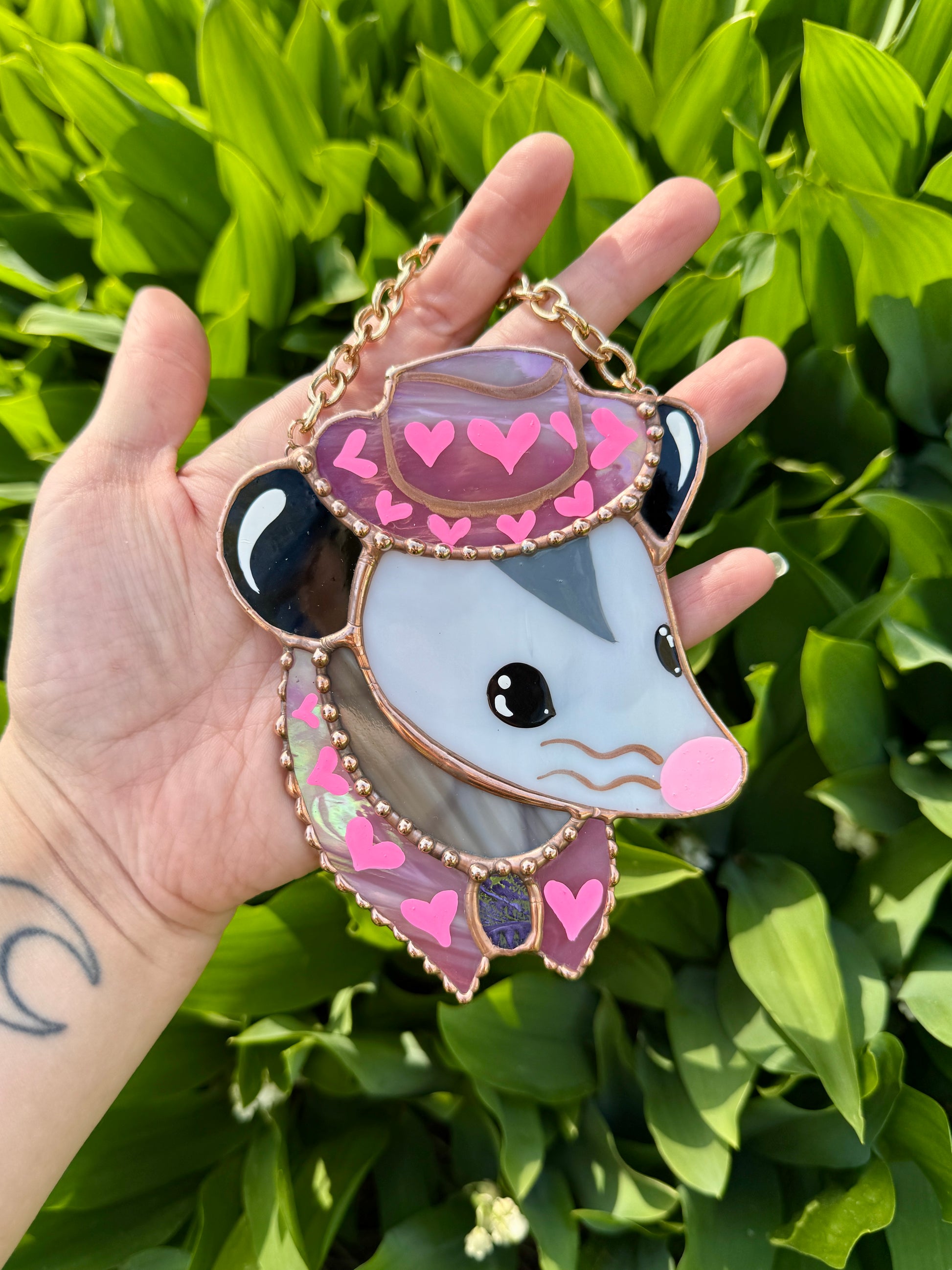 Mini Pink Cowboy Opossum Stained Glass Ornament