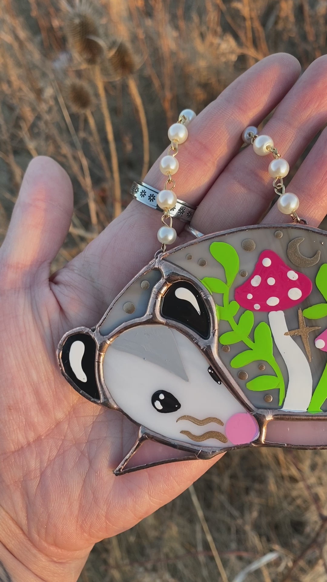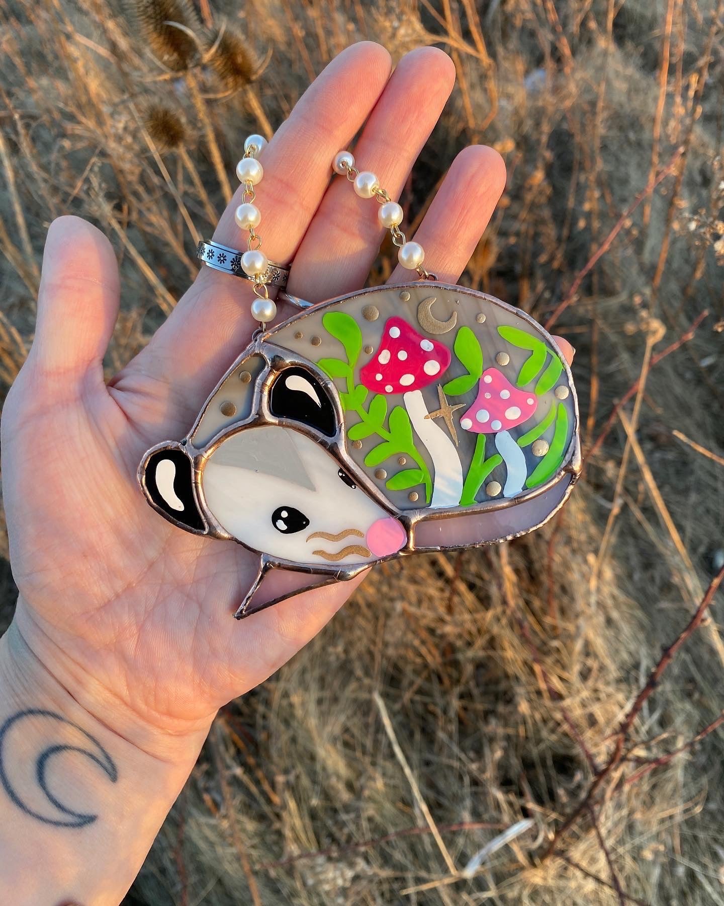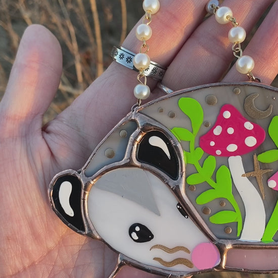 Mini Pink (ver 1) Sleepy Mushroom Opossum Stained Glass Ornament