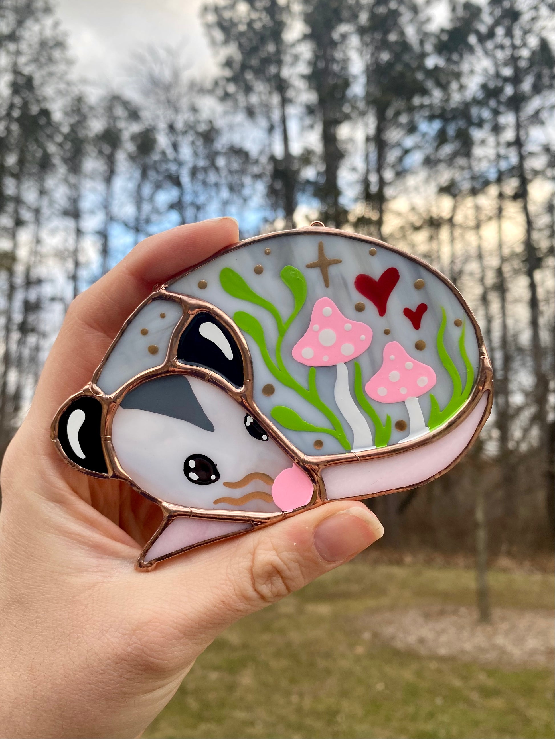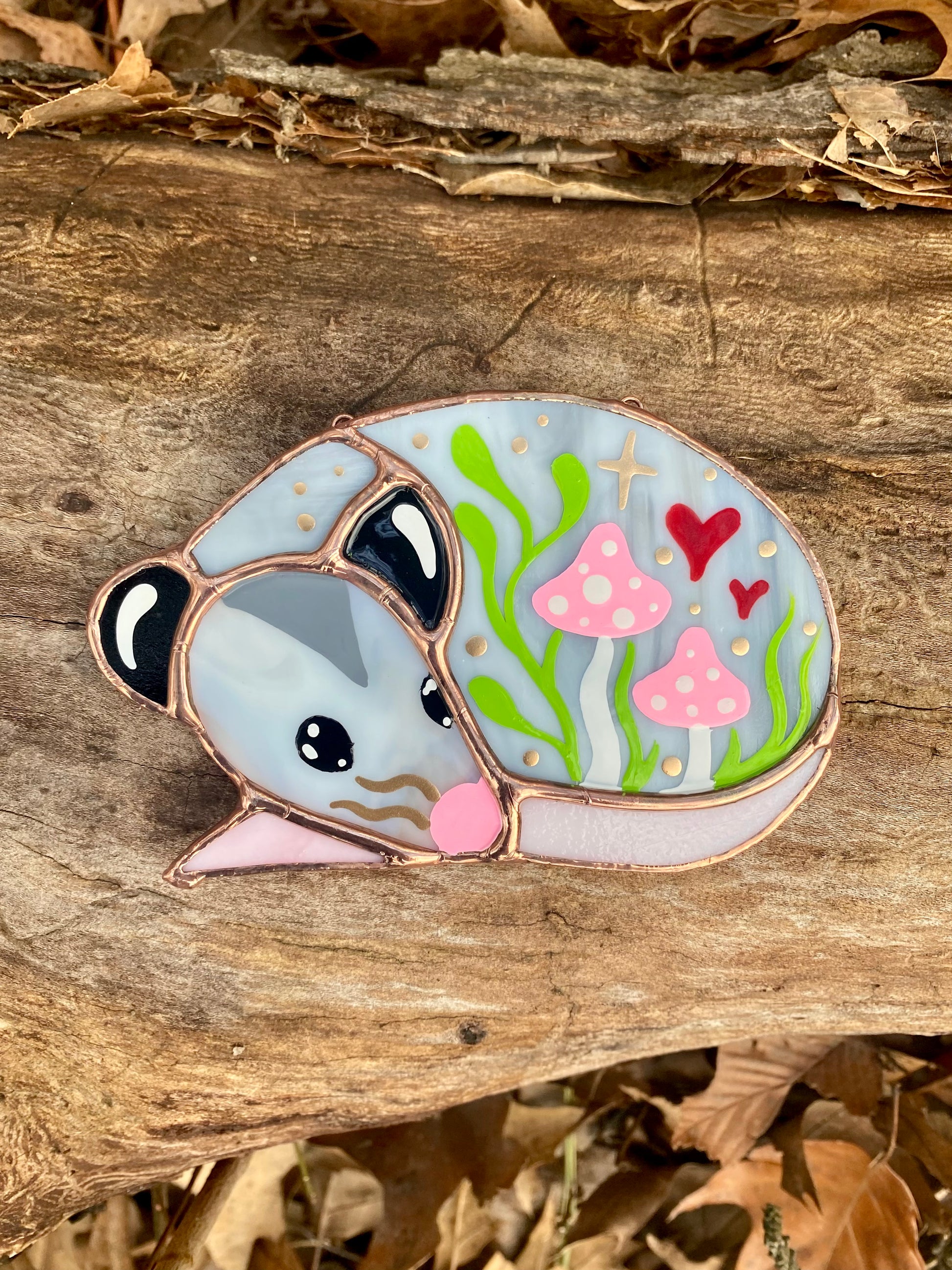 Mini Pink (ver 1) Valentine Sleepy Opossum Stained Glass Suncatcher